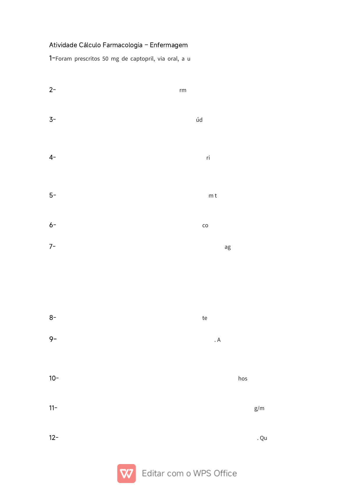 Atividade Cálculo Farmacologia – Enfermagem 1-Foram prescritos 50 mg de captopril, via oral, a um paciente. O captopril tem a seguinte apresentação: comprimido via oral 25 mg. Quanto(s) comprimido(s) devem ser administrados a esse paciente? 2-O técnico de enfermagem solicita auxílio da enfermeira para administrar vancomicina 300 mg, sendo que o frasco liberado pela farmácia foi de 500mg com 10ml de diluente. Nesse caso, quantos ml devem ser administrados para que a prescrição seja cumprida? 3-Homem, 55 anos, foi atendido na Unidade Básica de Saúde (UBS) devido à crise hipertensiva. Recebeu a prescrição de furosemida 80mg, EV, em 200 ml de soro fisiológico 0,9%, para infundir em 40min. Assinale a alternativa que indica corretamente o número necessário de gotas por minuto para essa infusão. 4-Um paciente foi à Unidade Básica de Saúde com uma prescriçãomédica para administrar, via intramuscular, Voltaren 50 mg e Gentamicina 45 mg. A apresentação das ampolas é Voltaren 75 mg/3 ml e Gentamicina 60 mg/2 ml. Quantos mililitros de cadamedicamento serão administrados, respectivamente? 5-Foi prescrito a administração de 45ml de uma solução em um tempo de 50min. Calcule o número de microgotas necessárias para administrar essa solução no tempo prescrito, e assinale a alternativa correta. 6-Foi prescrito pelo médico 500ml de soro fisiológico, para correr em 6 horas. Assinale quantas gotas ou microgotas deverão correr por minuto. 7-Você é enfermeiro de uma unidade de saúde e o técnico de enfermagem se deparou com uma prescrição demedicamento incomum e solicitou seu auxílio. Foi prescrita, pelo médico, benzilpenicilina cristalina potássica 4.000.000 UI, que, após reconstituída, deve ser administrada diluída em 100 ml de soro fisiológico 0,9% em 30minutos. A apresentação do frasco do medicamento indica que ele é composto de 5.000.000 UI, e o técnico em enfermagem já acrescentou 10ml de água destilada para diluição do pó. Que volume deve ser aspirado do frasco após a reconstituição do pó e qual é o gotejamento correto para a infusão do medicamento no tempo prescrito, respectivamente? 8-Foi prescrito Penicilina Cristalina 2.300.000 UI, o Hospital tem disponível frasco ampola de 10.000.000UI. Quantos ml devem ser aspirados para atender a prescrição? 9-Foi prescrito Penicilina Cristalina 3.500.000 UI EV de 4/4 horas. A unidade hospitalar dispõe de frascos de 5.000.000 UI – 2mL (soluto) que devem ser diluídas em 8mL de água destilada. Considerando o volume do solvente e do soluto, a quantidade a ser aspirada para cumprir a prescrição é de? 10-Foi prescrito 18 mg de Sulfato de gentamicina endovenosa. Porém, no hospital, só há disponível frasco de Sulfato de gentamicina 80 mg/2 ml. Quantos ml da medicação deverão ser administrados? 11-Considerando que a ampola de 1,0 ml de atropina tem a concentração 0,25 mg/ml, ao ser prescrito pelo médico 0,5mg desse medicamento em uma parada cardiorrespiratória, o enfermeiro tem de utilizar. 12-Um paciente deve receber uma infusão de 4,5L de soro fisiológico em 12 horas. Quantas gotas por minuto esse paciente deve receber? 13-Foram prescritos 25 mg/kg/dia de amoxicilina, via oral, a uma criança de 20 kg. A amoxicilina tem a seguinte apresentação: suspensão oral 250 mg/5mL; e o frasco tem volume total de 150mL, após reconstituição. 14-Foram prescritos 50 mg de captopril, via oral, a um paciente. O captopril tem a seguinte apresentação: comprimido via oral 25 mg. 15-Foi prescrito a um paciente amoxicilina + clavulanato de potássio 500 mg, de 8/8h, por 10 dias. Na apresentação dessa medicação, cada frasco contém 100 ml com a concentração de 250 mg/5 ml. Nesse caso, quantos frascos serão necessários para cumprir o tratamento proposto? 16 –Foi prescrito amoxicilina/clavulanato 50mg/kg, a cada quatro horas, para uma criança de cinco anos de idade, que pesa 18 kg. O rótulo domedicamento diz que há 200mg de amoxicilina/clavulanato em 1mL da solução. 17-Um paciente necessita utilizar heparina sódica para anticoagulação. Foi prescrito pelo médico que seja aplicado 2.500 UI, disponibilizado ao paciente na apresentação heparina sódica 5.000/ml, contendo 5ml no frasco-ampola. Quantos ml o paciente deverá receber para que seja cumprida a administração desse fármaco? 18-Em uma prescrição pede-se: 2.500 ml de soro fisiológico 0,9% endovenoso (EV) para correr em 12 horas, no equipo macrogotas. Para a realização da prescrição em questão serão necessárias quantas gotas/minuto? 19-O técnico de enfermagem recebe uma prescrição que indica a administração de 10 Unidade Internacional (UI) de heparina. Assinale a alternativa que apresenta a equivalência da dose prescrita. 20-O preparo demedicamentos deve ser realizado por profissionais habilitados, que possuam o domínio dos princípios básicos desta atividade. Um destes princípios engloba a realização de cálculos matemáticos para adequar a dose demedicamento disponível à necessidade individual do paciente. Considerando que foram prescritos 30mL de glicose 50%, mas no estoque só há ampolas de 10mL de glicose 25%, qual o volume de glicose 25% que deve ser administrado? 21-Está prescrito para o paciente Fabiano dos reis administrar 10 ml de glicose 10% por via endovenosa (EV). Está disponível a ampola de 20ml de glicose 50%. Assinale a alternativa correta de quanto será necessário aspirar (emml) de glicose 50% para cumprir a prescrição médica. 22-Para correr 500 mL domedicamento em 6 horas utilizando equipo de macrogotas, o soro deverá apresentar gotejamento por minuto de aproximadamente? 23-O cálculo demedicação é uma parte crítica da prática clínica, especialmente para profissionais de saúde, como enfermeiros e técnicos de enfermagem, que precisam administrar medicamentos com precisão. Diante disso, para cumprir uma prescrição médica com o antibiótico cefuroxima 750mg/frasc