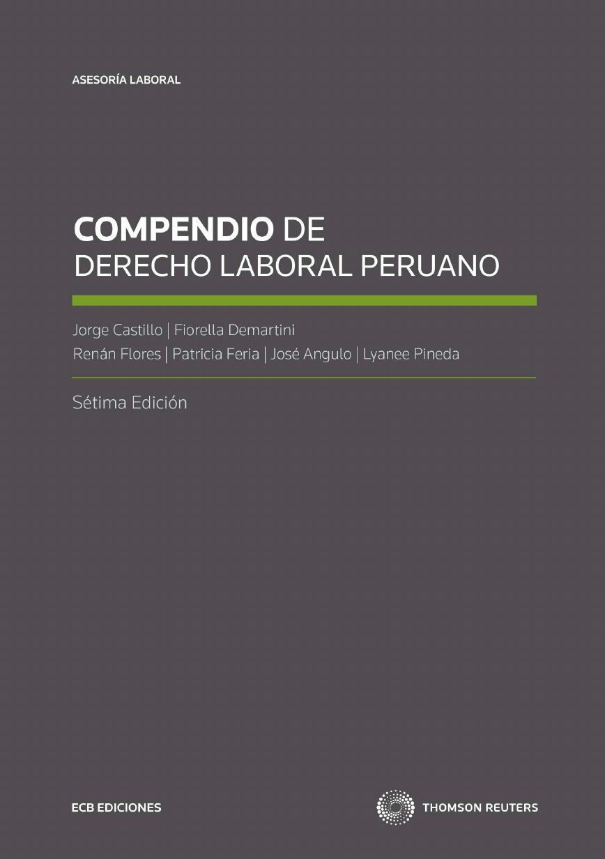 TAPÄ Compendio de Derecho Laboral Peruano © ECB Ediciones S.A.C. Año 2015 Derechos reservados D. Leg. N° 822 (22.04.96) www.thomsoreuters.com.pe www.alaboral.com.pe www.checkpoint.com.pe www.caballerobustamante.com.pe e-mail: tr.publicaciones@ thomsonreuters.com © Jorge Castillo Guzmán © Fiorella Demartini Rivera © Patricia Feria Valverde © José Angulo Jugo © Lyanee Pineda Abuhadba © Mariella Belleza Salazar Año 2015 – Derechos reservados D.Leg. N° 822 (22.04.96) Prohibida la reproducción total o parcial sin la autorización expresa del editor. Depósito Legal - Ley N° 26905 (20.12.97) Editor: ECB Ediciones S.A.C. Para su sello editorial: Domicilio: Av. Víctor Andres Belaunde 332, Oficina 302, San Isidro, Lima 27 - Perú Año 2015 - 1,000 ejemplares Hecho el Depósito Legal en la Biblioteca Nacional del Perú N° 2015-16364 Registro ISBN: 978-612-4293-16-0 Registro del Proyecto Editorial: 11501311501255 Primera edición - año 2009 Segunda edición - año 2010 Tercera edición - año 2011 Cuarta edición - año 2012 Quinta edición - año 2013 Sexta edición - año 2014 Sétima edición - año 2015 Artistas gráficos: Alfredo Armenta, Adrián Orozco, Omar Valvivia, Ángel Barajas, Celeste Arana Impresión y encuadernación: Editorial Tinco S.A. Calle Arquímedes N° 114 Urb. La Campiña - Chorrillos Este libro se terminó de imprimir en noviembre de 2015 en los Talleres Gráficos de Editorial Tinco S.A. Calle Arquímedes N° 114 Urb. La Campiña - Chorrillos Teléfonos: 719-1137 - 719-1139 Reseña y participación de los autores Jorge Castillo Guzmán Abogado de la Pontificia Universidad Católica del Perú. Especialista en Derecho Laboral. Di- rector de la revista Asesoría Laboral y jefe editorial del área laboral de Thomson Reuters - Caballero Bustamante. Ha publicado libros especializados en Derecho del Trabajo y Seguridad Social, tales como: Compendio del De- recho Laboral Peruano, Tratado del Nuevo Proceso Laboral Peruano, La Compensación por Tiempo de Servicios, el Manual de Prestaciones de la Seguridad Social y del Sistema Privado de Pensiones, Manual del Litigante, Remuneraciones, jurisprudencia Laboral, SOS Laboral, entre otros. Consultor de empresas públicas y privadas, conferencista y docente en congresos y seminarios de la especialidad. Participación: responsable general de la obra, tuvo a su cargo todo el título I; el capítulo 14 del Título III y los capítulos del Título VII. Fiorella Demartini Rivera Abogada de la Universidad de Lima. Analista laboral de Thomson Reuters - Caballero Bustamante y miembro del comité editorial de la revista Asesoría Laboral e Informativo Caballero Bustamante. Ha publicado libros especializados en Derecho del Trabajo, tales como: Compendio del Derecho Laboral Peruano, Libro de Remuneraciones, libro de Infracciones Laborales, Compensación por Tiempo de Servicios, SOS Laboral. También se desempeña como capacitadora y conferencista en temas de Derecho Laboral y de la Seguridad Social. Participación: coordinadora de la obra, tuvo a su cargo los capítulos: 14, 15, 18, 19, 20, 21, 22, 25, 26, 27, 28 y 31 del Título II. Renán Flores Buendía Abogado por la Universidad San Cristóbal de Huamanga, recibió el premio a la Excelencia Académica en Derecho José León Barandiarán Hart - SUNARP (2009), fue becado en los Cursos de Extensión Universitaria de OSIPTEL (2010) e INDECOPI (2011). Se desempeñó como asesor laboral en el Estudio Caballero Bustamante y ha ocupado cargos en jefaturas de asesoría legal y recursos humanos en entidades públicas. Coautor del libro Empleo Público y gestión de recursos humanos en la administración pública (2013) y colaborador permanente de las revistas Asesoría Laboral e Informativo Caballero Bustamante de Thomson Reuters. Participación: los capítulos del Título IV. Patricia Feria Valverde Especialista en Derecho del Trabajo y de la Seguridad Social, cursó sus estudios de derecho en la Pontificia Universidad Católica del Perú. Colaboradora de Thomson Reuters - Caballero Bustamante y miembro del comité editorial de las revistas Asesoría Laboral e Informativo Caballero Bustamante. Ha publicado libros especializados en Derecho del Trabajo, tales como: Compendio del Derecho Laboral Pe- ruano, Remuneraciones, Prácticos de Estudio, entre otros. Participación: Capítulos 13, 17, 24, 30 y 32 del Título III y; y los capítulos del Título III. José Angulo Jugo Magister (LLM) en Derecho del Trabajo por la Universidad van Tilburg – Holanda. Con cursos avanzados de especialización en Derecho del Trabajo en la Katholieke Universiteit Leuven – Bélgica, en el HQ de la Organiza- ción Internacional de Trabajo (OIT) – Suiza, en el V.V. Giri National Labour Institute - India y en la Universidad de Sevilla - España. Abogado colegiado por la Pontificia Universidad Católica del Perú (PUCP). Con varios años de experiencia laboral en instituciones privadas, públicas y organizaciones internacionales de manera nacional e internacional, en las áreas del Derecho del Trabajo y Gestión de Recursos Humanos. Experiencia como docente universitario del curso Derecho del Trabajo y conferencista eventual en Thompson Reuters sobre temas de trabajo. Autor de diversos artículos de investigación. Participación: los capítulos del Título V. Lyanee Pineda Abuhadba Abogada, egresada de la Facultad de Derecho de la Pontificia Universidad Católica del Perú. Tiene estudios de especialización en Derecho Laboral, Procesal Laboral y Recursos Humanos. Inició su formación profesional en el Estudio Caballero Bustamante, siendo asesora laboral. Ha sido asociada del área laboral del Estudio Carrera, Pinatte & Baca-Álvarez, actualmente se desempeña como abogada laboral del Grupo IBT, empresa transnacional con actividad en los sectores de salud, energía y construcción civil. Cuenta con experiencia en asesoría empresarial en temas de obligaciones laborales, procedimientos de fisca- lización