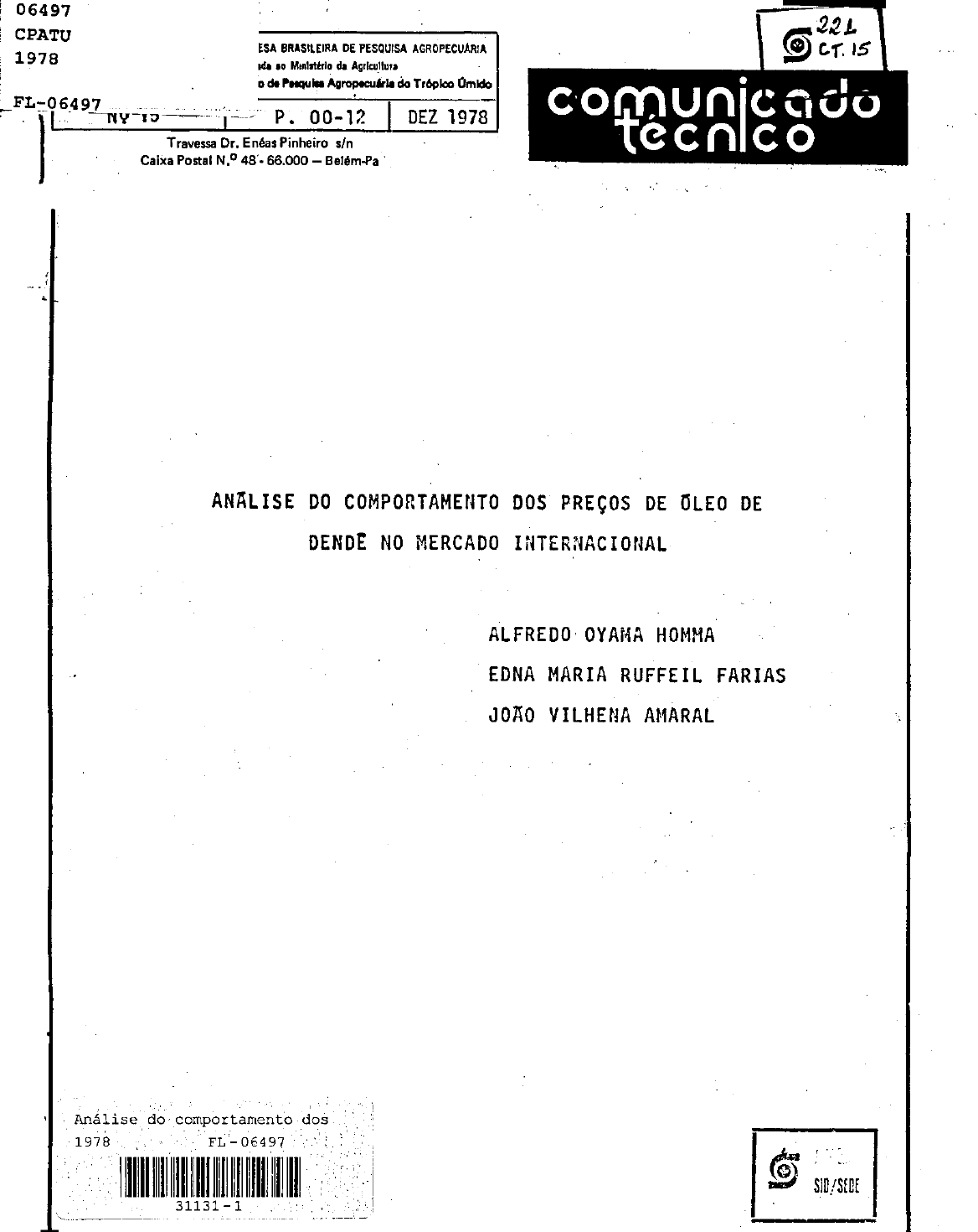06497 CPATtJ 1978 SA BRASILEIRA DE PESQUISA AGROPECUARrA IdI lo Mrnlrérlo da AgricolIu,. ad. Pnok. Arop.cukIa So tr6pIoQ úmIdo P. 00-12 1 DEZ 1978 Travessa Dr. Enéas Pinheiro s/n Caixa Postal N.° 48 - 66.000— Detém-Pa ANALISE DO COMPORTAMENTO DOS PREÇOS DE OLEO DE DENDE NO MERCADO INTERNACIONAL ALFREDO OYA1A FIOMMA EDNA MARIA RUFFEIL FARIAS JO)O VILHENA AMARAL tIO/tECE j W1STRO SÃ AGIUCVLTtSL Alyssn Pautall! ?resicbnte di COMPATLR fluia Af..s. Rosa. Diret.ria Encutiva ia EIaRAPÃ Jo.é Iriucu Cibral - Presidente Alrtro Dlunsjei. - tretu Eãmunjo da Foatwuia Gastai - Drctsr Eliseu flobczto dc Audr4de Alv2s - Pretas CkVa da CPATU Crist. izaré £arbna dø Nascixnnt. - CheM Virgiflo. rorreira LbuiSt - Ckaia Adjaata .&aic• José Fuijas Júnr - Ckef e Atjusto le Anjo EMBRAPA CENTRO DE PESQUISA AGROPECUARIA DO TRÓPICO UNIDO COMUNICADO TECNICO 119 15 ANALISE DO COMPORTAMENTO DOS PREÇOS DE ÓLEO DE DENDE 1W MERCADO INTERNACIONAL ALFREDO OYAFIA HOMMA EngQ AgrQ, M.S. em Economia Rural, Pesquisador do CPATU EDNA.MARIA RUFFEIL FARIAS . JÕAÔVILHENÃ AMARAL Eng os. Agr os. BELEM CPATU dezembro dc 1978 Houta, Alfredo Oyawa An&lisedo comportamento dos preços de 6leo de dende no mercado internacional. Bel&m, CPATU, 1978. -. ilust. (Comunicado Tcni co, 15) - 1. Dend - Aspectos econtmicos. 2. Óleo de den de - Preços. 1. Farias, Edna Maria Ruffeil. II. Ama ral, Joao Vilhena. III. Srie. IV. Titulo. CDD: 382.41385 OU: 633.852:382.003.13 ANALISE DO COMPORTAMENTO DOS PREÇOS DE OLEO DE DENDE NO MERCADO INTERNACIONAL SUMARIO P. 1 - INTRODUÇAO. .............................................. 1 2 - MATERIAL E MflODOS ......................................2 3 - RESULTADOS E DISCUSS1O ..................................3 4 - COUCLUSOES ..............................................5 5-ANEXOS ..................................................7 5.1 - PREÇOS MEDIOS MENSAIS DE OLEO DE DENDE NOS PORTOS EURO PEUS (L12240 ib) - 1960/76 ...........................7 5.2 - DESVIOS PADRUES, INDICES ESTACIONAIS, LIMITES SUPERIO RES E INFERIORES DA VARIAÇAO ESTACIONAL DOS PREÇOS M DIOS DE OLEO DE DENDE NOS PORTOS EUROPEUS - 1960-69 . . . 8 5.3 - DESVIOS PADRUES, INDICES ESTACIONAIS, LIMITES SUPERIO RES E INFERIORES DA VARIAÇAO ESTACIONAL DOS PREÇOS ME DIOS DE OLEO DE DENDE NOS PORTOS EUROPEUS - 1970-76 ... 9 5.4 - TNDICES DE VARIAÇAO ESTACIONAL DOS PREÇOS MEDIOS DE OLEO DE DENDE NOS PORTOS EUROPEUS (U2240 ib) - 1960-69 10 5.5 - INDICES pE VARIAÇAO ESTACIONAL DOS PREÇOS MEDIOS DE OLEO DE DENDÊ NOS PORTOS EUROPEUS (/2240 ib) - 1970-76 10 5.6 - PREÇOS CORRENTES DE ÓLEO DE DENDE NOS PORTOS EUROPEUS E SUA TENDÊNCIA - 1960-76 ............................... 1 1 5.7 - PREÇO CORRENTE IIENSAIS NOS PORTOS EUROPEUS (12240 ib) - 1960-76 ............................................. 11 6 - FONTES CONSULTADAS ......................................12 ANALISE DO COMPORTAMENTO DOS PREÇOS DE OLEO DE DENDE NO MERCADO INTERNACIONAL RESUMO: O comportamento dos preços de ólco de dendÔ no mercado internacional no pe nodo 1960-76 foi analisado pelo ntodo do Total Móvel de 12 Meses. A análise evi denciou duas fases distintas, uma de 1960 72 e a outra de 1973-76. Na primeira, os preços mantiveran-se quase num mesmo pata mar, com oscilaç3es de 23,84% em torno da média. Na segunda fase, os preços apresen taraxa uma súbita elevaçao de 48,82% em re lação à módia da fase anterior. O ciclo módio completo de preço foi de aproximada mente 6 anos. - INTRODUÇ7O As principais áreas produtoras de dendó estão situadas no Sudeste Asiático (Malásia e Indonésia) e na Âfrica (Congo, Ni96 ria, Costa do Marfim, Daomó e Mcçaxnbique). A produção mundial de éleo de dendô (polpa) e palmiste (an8ndoa) eleva-se a 2.700.000 to neladas, correspondentes a 8% da produção mundial de óleos cgatais e a 6% de corpos gordurosos de todas as origens. A América do Sul não chega a 3% do total mundial, sendo que a produção brasileira não atinge a 0,25% com a reduzida participação de 6.500 toneladas (v.6-1, 6-5 e 6-4). O dendezeiro apresenta-se como cultura ao maior rendiraen to de óleo por hectare e a Região lmazônica, face possuir áreas que apresentara condiç6es ecológicas favoráveis para o desenvolvi manto da cultura, pode ocupar lugar de destaque no mercado interna cional de matórias primas oleaginosas. 2 Os óleos dc dendô extraídos da polpa e amôndoa apresen tan cores vermelho-alaranjada e branca, respectivaxnente. O primei ro destina-se à indústria siderúrgica (chapas de flandres, lamina gani a frio); ã indústria de margarina (em conjunto com o óleo da palmiste, de copra e de amendoim); à fabricação de óleo de mesa por fracionamento pelo frio; à indústria de sabão, com óleos do baixa qualidade e alta acidez, detergentes e diversos produtos de limpeza; e à indústria farmac&utica, por extração do caroteno ou pró-vitamina A. o óleo de pa]nista, por sua vez, tem emprego nas indús trias de margarina e sabo. O presente trabalho tem por finalidade analisar os pre ços de óleo de dend5 no rercado internacional e seu comportamento, no período 1960-76, a fim de revelar aspectos, que poderão ser úteis, se considerados na formulação de política de preços, tanto para países consumidores, corno para produtores com vistas à sua possível expansão, conto no caso particular da Região Amazônica. Es tes aspectos baseian-se nas tendências dos preços a longo prazo, variação estacional e tarb&zt seus ciclos. 2 - MATERIAL E METODOS O método usado para a estimativa da variação estacional dos preços de óleo dc dondô foi o denominado Total. Móvel de 12 Me ses, onde cada preço mensal ó expresso como porcentagem de urna ten dncia. A utilização deste rntodo permitiu calcular um índice ajus tado, onde foram eliminadas as influancias distorcidas da 1nflaço, das variaç3es cíclicas o de outras discrepàncias, deixando era cvi dncia a variação estacional e outras causas não raensurv