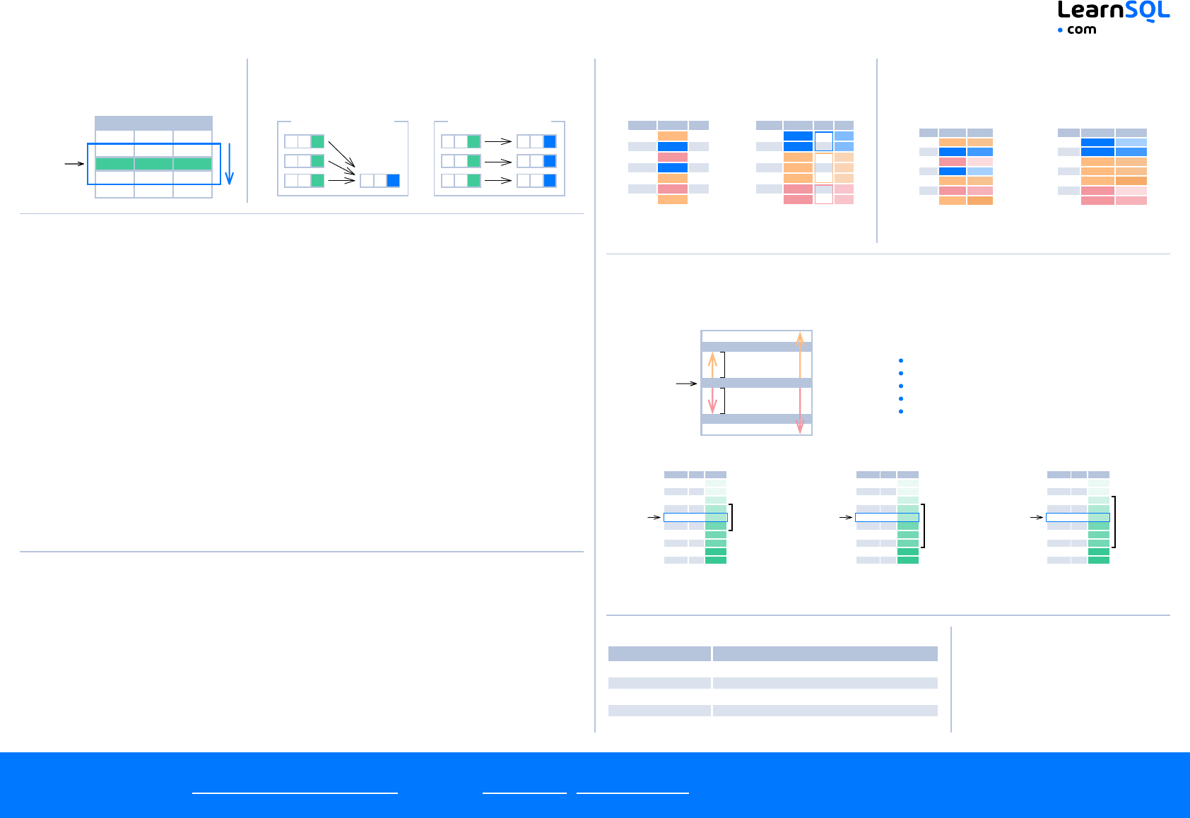 SQL Window Functions Cheat Sheet WINDOW FUNCTIONS Window functions compute their result based on a sliding window frame, a set of rows that are somehow related to the current row. current row AGGREGATE FUNCTIONS VS. WINDOW FUNCTIONS Unlike aggregate functions, window functions do not collapse rows. ∑ ∑ ∑ ∑ Aggregate Functions Window Functions SYNTAX SELECT city, month, SUM(sold) OVER ( PARTITION BY city ORDER BY month RANGE UNBOUNDED PRECEDING) total FROM sales; SELECT <column_1>, <column_2>, <window_function> OVER ( PARTITION BY <...> ORDER BY <...> <window_frame>) <window_column_alias> FROM <table_name>; NAMED WINDOW DEFINITION SELECT country, city, RANK() OVER country_sold_avg FROM sales WHERE month BETWEEN 1 AND 6 GROUP BY country, city HAVING sum(sold) > 10000 WINDOW country_sold_avg AS ( PARTITION BY country ORDER BY avg(sold) DESC) ORDER BY country, city; SELECT <column_1>, <column_2>, <window_function>() OVER <window_name> FROM <table_name> WHERE <...> GROUP BY <...> HAVING <...> WINDOW <window_name> AS ( PARTITION BY <...> ORDER BY <...> <window_frame>) ORDER BY <...>; PARTITION BY, ORDER BY, and window frame definition are all optional. LOGICAL ORDER OF OPERATIONS IN SQL 1. FROM, JOIN 2. WHERE 3. GROUP BY 4. aggregate functions 5. HAVING 6. window functions 7. SELECT 8. DISTINCT 9. UNION/INTERSECT/EXCEPT 10. ORDER BY 11. OFFSET 12. LIMIT/FETCH/TOP You can use window functions in SELECT and ORDER BY. However, you can't put window functions anywhere in the FROM, WHERE, GROUP BY, or HAVING clauses. PARTITION BY divides rows into multiple groups, called partitions, to which the window function is applied. month city sold 1 Rome 200 2 Paris 500 1 London 100 1 Paris 300 2 Rome 300 2 London 400 3 Rome 400 PARTITION BY city month city sold sum 1 Paris 300 800 2 Paris 500 800 1 Rome 200 900 2 Rome 300 900 3 Rome 400 900 1 London 100 500 2 London 400 500 Default Partition: With no PARTITION BY clause, the entire result set is the partition. ORDER BY ORDER BY specifies the order of rows in each partition to which the window function is applied. sold city month 200 Rome 1 500 Paris 2 100 London 1 300 Paris 1 300 Rome 2 400 London 2 400 Rome 3 PARTITION BY city ORDER BY month sold city month 300 Paris 1 500 Paris 2 200 Rome 1 300 Rome 2 400 Rome 3 100 London 1 400 London 2 Default ORDER BY: With no ORDER BY clause, the order of rows within each partition is arbitrary. WINDOW FRAME A window frame is a set of rows that are somehow related to the current row. The window frame is evaluated separately within each partition. <ROWS | RANGE | GROUPS> BETWEEN lower_bound AND upper_bound N PRECEDING CURRENT ROW M FOLLOWING N ROWS M ROWS UNBOUNDED PRECEDING UNBOUNDED FOLLOWING The bounds can be any of the five options: UNBOUNDED PRECEDING n PRECEDING CURRENT ROW n FOLLOWING UNBOUNDED FOLLOWING The lower_bound must be BEFORE the upper_bound. ROWS BETWEEN 1 PRECEDING AND 1 FOLLOWING city sold month Paris 300 1 Rome 200 1 Paris 500 2 Rome 100 4 Paris 200 4 Paris 300 5 Rome 200 5 London 200 5 London 100 6 Rome 300 6 current row 1 row before the current row and 1 row a�er the current row RANGE BETWEEN 1 PRECEDING AND 1 FOLLOWING city sold month Paris 300 1 Rome 200 1 Paris 500 2 Rome 100 4 Paris 200 4 Paris 300 5 Rome 200 5 London 200 5 London 100 6 Rome 300 6 current row values in the range between 3 and 5 ORDER BY must contain a single expression GROUPS BETWEEN 1 PRECEDING AND 1 FOLLOWING city sold month Paris 300 1 Rome 200 1 Paris 500 2 Rome 100 4 Paris 200 4 Paris 300 5 Rome 200 5 London 200 5 London 100 6 Rome 300 6 current row 1 group before the current row and 1 group a�er the current row regardless of the value As of 2024, GROUPS is only supported in PostgreSQL 11 and up. ABBREVIATIONS ABBREVIATION MEANING UNBOUNDED PRECEDING BETWEEN UNBOUNDED PRECEDING AND CURRENT ROW n PRECEDING BETWEEN n PRECEDING AND CURRENT ROW CURRENT ROW BETWEEN CURRENT ROW AND CURRENT ROW n FOLLOWING BETWEEN CURRENT ROW AND n FOLLOWING UNBOUNDED FOLLOWING BETWEEN CURRENT ROW AND UNBOUNDED FOLLOWING DEFAULT WINDOW FRAME If ORDER BY is specified, then the frame is RANGE BETWEEN UNBOUNDED PRECEDING AND CURRENT ROW. Without ORDER BY, the frame specification is ROWS BETWEEN UNBOUNDED PRECEDING AND UNBOUNDED FOLLOWING. Try out the interactive Window Functions course or explore all LearnSQL.com courses. LearnSQL.com is owned by Vertabelo SA vertabelo.com | CC BY-NC-ND Vertabelo SA https://learnsql.com/course/window-functions?utm_source=cheatsheet&utm_medium=pdf&utm_campaign=windowf_a4 https://learnsql.com/course-explorer?filter=all&level=all&sort=popularity&utm_source=cheatsheet&utm_medium=pdf&utm_campaign=windowf_a4 https://learnsql.com/?utm_source=cheatsheet&utm_medium=pdf&utm_campaign=windowf_a4 https://vertabelo.com/?utm_source=cheatsheet&utm_medium=pdf&utm_campaign=windowf_a4 SQL Window Functions Cheat Sheet LIST OF WINDOW FUNCTIONS Aggregate Functions avg() count() max() min() sum() Ranking Functions row_number() rank() dense_rank() Distribution Functions percent_rank() cume_dist() Analytic Functions lead() lag() ntile() first_value() last_value() nth_value() AGGREGATE FUNCTIONS avg(expr) – average value for rows within the window frame count(expr) – count of values for rows within the window frame max(expr) – maximum value within the window frame min(expr) – minimum value within the window frame sum(expr) – sum of values within the window frame ORDER BY and Window Frame: Aggregate functions do not require an ORDER BY. They accept window frame definition (ROWS, RANGE, GROUPS). RANKING FUNCTIONS row_number() – unique number for each row within partition, with different numbers for tied values rank() – ranking within partition, with gaps and same ranking for tied values dense_rank() – ranking within partition, with no gaps and same ranking for tied values city price row_number rank dense_rank over(order by price) Paris 7 1 1 1 Rome 7 2 1 1 London 8.5 3 3 2 Berlin 8.5 4 3 2 Moscow 9 5 5 3 Madrid 10 