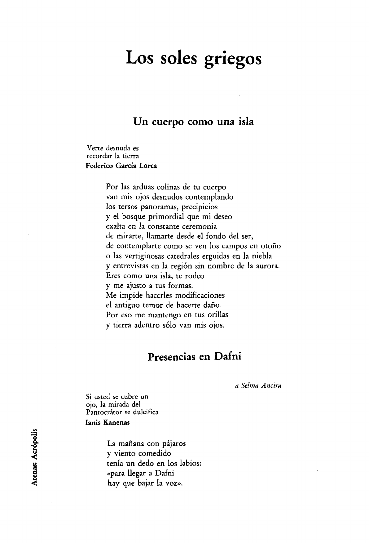 Los soles griegos Un cuerpo como una isla Verte desnuda es recordar la tierra Federico García Lorca Por las arduas colinas de tu cuerpo van mis ojos desnudos contemplando los tersos panoramas, precipicios y el bosque primordial que mi deseo exalta en la constante ceremonia de mirarte, llamarte desde el fondo del ser, de contemplarte como se ven los campos en otoño o las vertiginosas catedrales erguidas en la niebla y entrevistas en la región sin nombre de la aurora. Eres como una isla, te rodeo y me ajusto a tus formas. Me impide hacerles modificaciones el antiguo temor de hacerte daño. Por eso me mantengo en tus orillas y tierra adentro sólo van mis ojos. Presencias en Dafni a Selma Ancira Si usted se cubre un ojo, la mirada del Pantocrátor se dulcifica Ianis Kanenas «5 "o x©1 La mañana con pájaros já y viento comedido a tenía un dedo en los labios: g «para llegar a Dafni < hay que bajar la voz». 26 Piedras grises, mosaicos ardiendo bajo el sol. El alto Pantocrátor fulminando sin furia. Nace el señor, la virgen, presentada en el templo, tiene en las manos tensas algo premonitorio. En los muros, la historia de los tiempos judíos se ponía los colores y rostros de Bizancio. Afuera, el dios Apolo danza entre las columnas; en las aguas del pozo su canción sumergida. Arde Dafní en el día, el Pantocrátor rige, se despereza Apolo y una brisa de albahaca nos llega de la tierra. La mañana en Andros El viento recorrió toda la noche su invisible camino, gimió, rompió ventanas, abrió puertas. Era el viento del este, un viento turco cargado de iracundia. La isla navega con su azul cicládico en las dulces ventanas. No hay un momento en que no asome el mar. Todo es mar, es cielo reflejando la presencia del mar. Un mar tan suave que ni el viento logra inquietar sus entrañas, un mar que muestra todos sus secretos y los daños causados por el hombre. Andros se queja del amargo viento, pero respira en calma en los brazos del mar. Pasando por Meteora De pronto, de pronto el frenesí nos dejará, cesará de correr por esos canales rojos de nuestra vi da que con tanta frecuencia ha recorrido, y otra clase de gusano roerá esa gran vid de la cual se nutría. Thomas Wolfe Como si al despertar no conociéramos el cuerpo que nos une con la tierra; como si al caminar ya no escucháramos nuestros antiguos pasos; como si al saludar ya no encontráramos la certidumbre del conocimiento; como si nuestra casa, de repente, fuera una circunstancia hostil y muda; como si nuestras gentes, con súbita actitud, nos olvidaran... Así unos días del año nos sentimos y bajamos los ojos e inclinamos el torso, nuestras manos se aferran a los muros del aire. Flotamos... y la vida nos deja en la caída. ¿Hacia dónde caemos? ¿en qué agujero inmenso se hundirá nuestro cuerpo? ¿y quién podrá salvarnos? ¿quién, en esta mañana y en esta tierra ajenas nos tenderá las manos, detendrá la caída? Nadie. Sólo nosotros, sólo lo que hemos sido, los días acumulados con sus flores serenas, con las santas muchachas de mirada segura, los paseos por el bosque, las sabias madrugadas descubriendo el suntuoso resplandor de la carne. El frenesí esta muerto y las manos lo extrañan, pero no volverá. ¿Vendrá después el viento a destrozar las ramas, quedará sólo el miedo con sus garfios nocturnos? No... no sabemos nada... tan sólo que la vida sabe lo que ignoramos. Nuestros pasos olvidan las curvas del camino. Perplejos, agotados, mas con ganas de vida, ese viento incesante nos lleva entre sus manos. Delfos, la voz cambiada En memoria de Yorgos Seferis Más que el templo de los atenienses o las columnas truncas o el graderío extendido en lo alto de los montes aquí reinan los ecos. Las montañas dramáticas repiten sin cesar esas palabras que lanzamos al viento. Regresa nuestra voz y no es la misma. Algo en el viaje le cambió el sonido. No es la misma palabra y no entendemos la que regresa el eco. Ahí, en esa palabra cambiada por los montes, está la predicción. Mujer dormida Nuestras vidas son los ríos Jorge Manrique Desde aquí veo tu casa rodeada por el aire de esta mañana'lívida. Veo tu puerta cerrada y el balcón entreabierto, siempre entreabierto para librarte de los sueños malos. Me asomo y veo tu cuerpo entre las sábanas, siento su respiración lenta. Todo está vivo. La sangre cumple su trabajo y transcurre sin prisa por tus sienes para que tú te duermas. Miles de vidas viven en un solo, prodigioso segundo de ese tiempo tan diferente al tiempo que nos manda a la calle y nos dicta sus leyes, nos obliga a correr y va pasando como pasan los ríos. Siento tu desnudo creciendo en la cama. Un cuerpo dormido nos entrega la paz del mundo. Me voy sin hacer ruido. Te dejo en el país construido por el sueño. Al irme siento que sonríes. Los ángeles del otoño, con un dedo en los labios, le ordenan a la vida que no te despierte. Lunes de invierno La noche y los maduros corazones con esa oscura carga de todo lo omitido, pesan sobre las almas. Una luna violenta se oculta entre los árboles. Esta visitación nos sobresalta. No es época de luna y nada espera el corazón que pesa y no se calma. Atenas está llena de luna en este invierno suave. Ay, otras lunas vieron los ojos jóvenes, otras lunas violentas, sumergidas en las nubes de fuego. Esta luna nos pesa y los maduros corazones recuentan sus pasiones incumplidas. Hugo Gutiérrez Vega