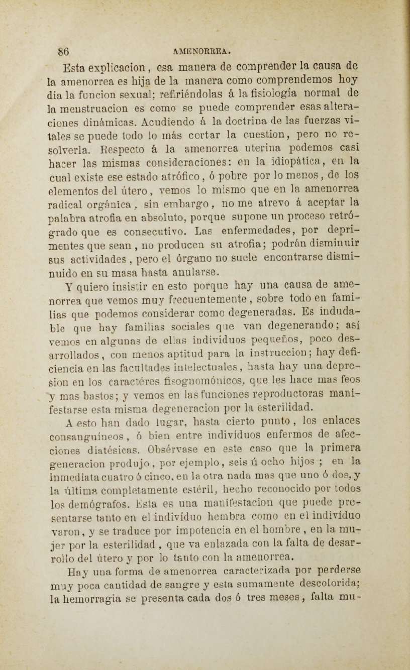 <p>86 AMENORREA.</p><p>Esta explicacion , esa manera de comprender la causa de</p><p>la amenorrea es hija de la manera como comprendemos hoy</p><p>dia la funcion sexual; refiriéndolas á la fisiología normal de</p><p>la meustruacion es como se puede comprender esas altera</p><p>ciones dinámicas. Acudiendo á la doctrina de las fuerzas vi</p><p>tales se puede todo lo más cortar la euestion , pero no re</p><p>solverla. Respecto á la amenorrea uterina podemos casi</p><p>hacer las mismas consideraciones: en la idiopática , en la</p><p>cual existe ese estado atrófico , ó pobre por lo menos, de los</p><p>elementos del útero, vemos lo mismo que en la amenorrea</p><p>radical orgánica, sin embargo, no me atrevo á aceptar la</p><p>palabra atrofia en absoluto, porque supone un proceso retró</p><p>grado que es consecutivo. Las enfermedades, por depri</p><p>mentes que sean, no producen su atrofia ; podrán disminuir</p><p>sus actividades, pero el órgano no suele encontrarse dismi</p><p>nuido en su masa hasta anularse.</p><p>Y quiero insistir en esto porque hay una causa de ame</p><p>norrea que vemos muy frecuentemente, sobre todo en fami</p><p>lias que podemos considerar como degeneradas. Es induda</p><p>ble que hay familias sociales que van degenerando ; así</p><p>vemos en algunas de ellas individuos pequenos, poco des</p><p>arrollados, con menos aptitud para la instruccion ; hay defi</p><p>ciencia en las facultades intelectuales, hasta hay una depre</p><p>sion en los caracteres fisognomónicos, que les hace mas feos</p><p>'y mas bastos; y vemos en las funciones reproductoras mani</p><p>festarse esta misma degeneracion por la esterilidad.</p><p>A esto han dado lugar, hasta cierto punto, los enlaces</p><p>consanguíneos, ó bien entre individuos enfermos de afec</p><p>ciones diatésicas. Obsérvase en este caso que la primera</p><p>generacion produjo, por ejemplo, seis ú ocho hijos ; en la</p><p>inmediata cuatro 6 cinco, en la otra nada mas que uno ó dos, y</p><p>la última completamente estéril, hecho reconocido por todos</p><p>los demógrafos. Esta es una manifestacion que puede pre</p><p>sentarse tanto en el individuo hembra como en el individuo</p><p>varon, y se traduce por impotencia en el hombre, en la mu</p><p>jer por la esterilidad, que va enlazada con la falta de desar</p><p>rollo del útero y por lo tanto con la amenorrea.</p><p>Hay una forma de amenorrea caracterizada por perderse</p><p>muy poca cantidad de sangre y esta sumamente descolorida;</p><p>la hemorragia se presenta cada dos 6 tres meses, falta mu</p><p>AMENORREA. 87</p><p>chas veces, y el resultado es una funcion mermada é incom</p><p>pleta.</p><p>Tal es lo que podemos considerar como fisiología patoló</p><p>gica de las diferentes clases de amenorrea. Esta enfermedad</p><p>se presenta de dos maneras distintas: ó bien ab initio cons</p><p>tituyendo lo que se llama amenorrea primitiva, ó retardo en</p><p>la presentacion de la pubertad, ó bien se presenta en una</p><p>mujer que habia menstruado bien por espacio de algun</p><p>tiempo y se llama secundaria ó consecutiva. Yo creo justificada</p><p>esta opinion de Raciborski , que reserva el nombre de ame</p><p>norrea á la verdadera supresion patológica de la menstrua</p><p>cion , y denomina retardos, tanto al hecho de presentarse</p><p>tardía la primera menstruacion , como á la excesiva prolon</p><p>gacion de los períodos intermenstruales. Por egemplo : si la</p><p>menstrnacion , en vez de presentarse á los catorce ó quince</p><p>afros, se presenta á los diez y seis ó diez y siete, no la llama</p><p>amenorrea, sino retardo menstrual; si en vez de presentarse</p><p>cada mes se presenta cada tres ó cuatro meses, la llama tam</p><p>bien retardo; si la mujer cuando ha parido y no lacta, tarda</p><p>la menstruacion á presentarse mucho más tiempo de lo re</p><p>gular, la llama retardo y no amenorrea : en estos casos, se</p><p>trata únicamente de una especie de pereza, una falta de acti</p><p>vidad, que casi siempre reconoce pura y simplemente una</p><p>pobreza de la sangre , caso distinto de cuando se suspende</p><p>por causa orgánica, ó deja de presentarse en absoluto, y la</p><p>mujer llega á los veinte ó veinte y cinco arios sin haber visto</p><p>esa funcion sexual.</p><p>Hay una amenorrea que parece que se separa de las que</p><p>hemos estudiado, que es la que Raciborski llama por causa</p><p>psíquica: es la que podríamos llamar tambien imaginaria.</p><p>El hecho se presenta de la manera siguiente: una mujer</p><p>bien menstruada, que no tiene en sus funciones nada que</p><p>pueda explicar la supresion de la menstruacion, tiene un</p><p>desliz, 6 entra en una de esas situaciones sociales, en las que</p><p>el estar embarazada 6 supone una mancha en su reputacion,</p><p>ó afecta profundamente á sus intereses. Esa idea hiere su</p><p>imaginacion, y basta esto para que la menstruacion deje de</p><p>presentarse, sin haber gestacion, y sin que haya pasado en</p><p>su organismo cosa alguna que pueda motivar aquella supre</p><p>sion.</p><p>88 AMENORREA.</p><p>En este caso se trata de un estado psicológico como úni</p><p>co causante de la amenorrea, ha bastado una idea fija en la</p><p>imaginacion para producirla, sin intervencion del embarazo</p><p>que no ha existido.</p><p>El miedo, pues, puede producir una amenorrea que au</p><p>mentará las sospechas que la mujer pueda tener y empeo</p><p>rará su estado. No se comprende bien cómo una funcion ínti</p><p>mamente enlazada á una necesidad orgánica, que se desarro</p><p>lla independiente de la voluntad, puede estar influida por</p><p>una simple impresion de la imaginacion; sin embargo, es</p><p>una de las leyes que podemos llamar de Fisiología patológi</p><p>ca que la impresion que en el organismo produce una idea,</p><p>se deja sentir muy especialmente en el sistema nervioso,</p><p>vaso-motor; este, á su vez tiene un gran papel en la produc</p><p>cion de los procesos menstruales, si pues se h