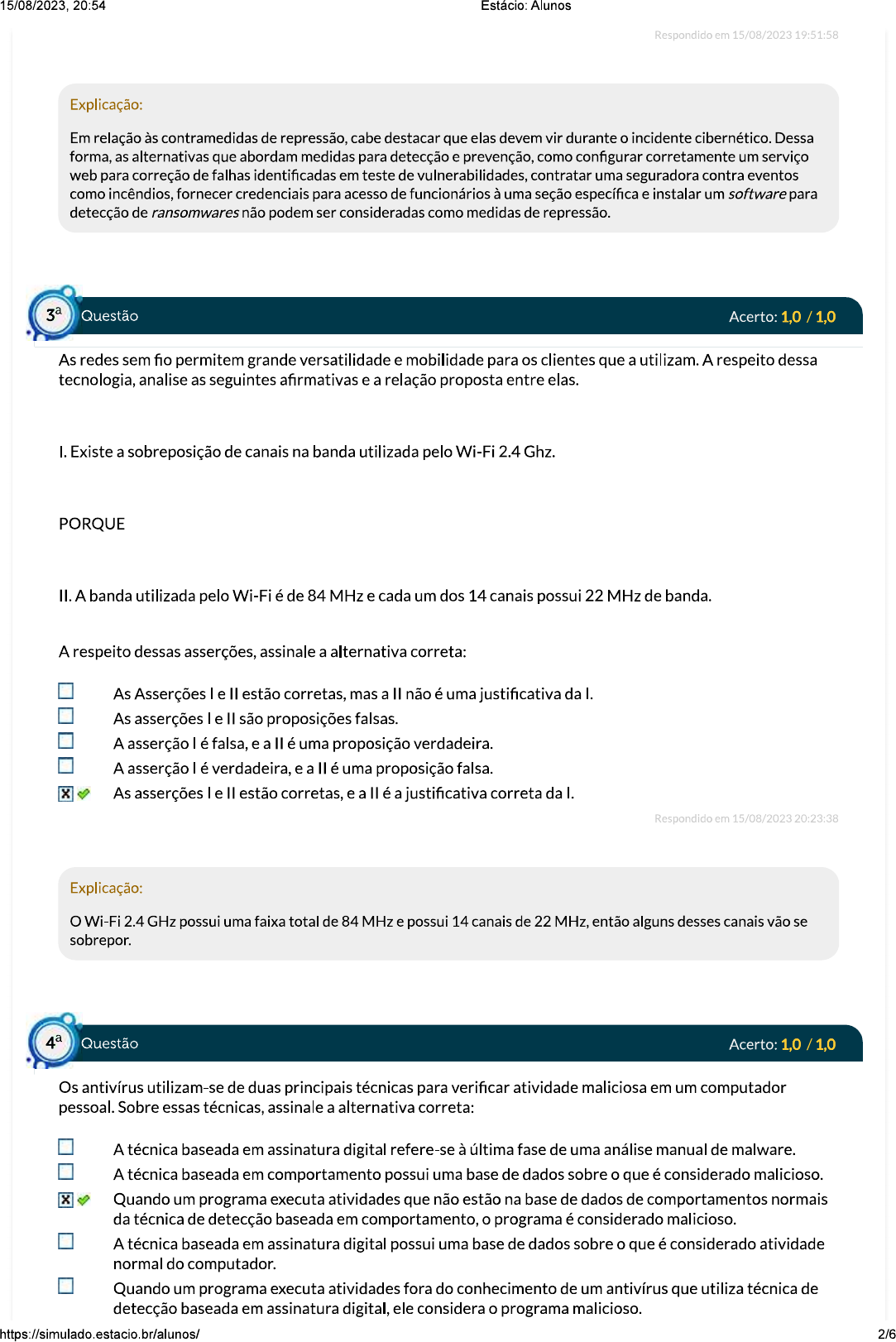 <p>15/08/2023, 20:54 Estácio: Alunos Respondido em 15/08/2023 19:51:58 Explicação: Em relação às contramedidas de repressão, cabe destacar que elas devem vir durante o incidente cibernético. Dessa forma, as alternativas que abordam medidas para detecção e prevenção, como configurar corretamente um serviço web para correção de falhas identificadas em teste de vulnerabilidades, contratar uma seguradora contra eventos como incêndios, fornecer credenciais para acesso de funcionários à uma seção específica e instalar um software para detecção de ransomwares não podem ser consideradas como medidas de repressão. Questão Acerto: 1,0 / 1,0 As redes sem fio permitem grande versatilidade e mobilidade para os clientes que a utilizam. A respeito dessa tecnologia, analise as seguintes afirmativas e a relação proposta entre elas. I. Existe a sobreposição de canais na banda utilizada pelo Wi-Fi 2.4 Ghz. PORQUE II. A banda utilizada pelo Wi-Fi é de 84 MHz e cada um dos 14 canais possui 22 MHz de banda. A respeito dessas asserções, assinale a alternativa correta: As Asserções e estão corretas, mas a não é uma justificativa da I. As asserções I e são proposições falsas A asserção I é falsa, e a é uma proposição verdadeira. A asserção é verdadeira, e a é uma proposição falsa. As asserções e estão corretas, e a é a justificativa correta da I. Respondido em 15/08/2023 20:23:38 Explicação: O Wi-Fi 2.4 GHz possui uma faixa total de 84 MHz e possui 14 canais de 22 MHz, então alguns desses canais vão se sobrepor. Questão Acerto: 1,0 / 1,0 Os antivírus utilizam-se de duas principais técnicas para verificar atividade maliciosa em um computador pessoal. Sobre essas técnicas, assinale a alternativa correta: A técnica baseada em assinatura digital refere-se à última fase de uma análise manual de malware. A técnica baseada em comportamento possui uma base de dados sobre o que é considerado malicioso. Quando um programa executa atividades que não estão na base de dados de comportamentos normais da técnica de detecção baseada em comportamento, o programa é considerado malicioso. A técnica baseada em assinatura digital possui uma base de dados sobre o que é considerado atividade normal do computador. Quando um programa executa atividades fora do conhecimento de um antivírus que utiliza técnica de detecção baseada em assinatura digital, ele considera o programa malicioso. https://simulado.estacio.br/alunos/ 2/6</p><p>15/08/2023, 20:54 Estácio: Alunos Respondido em 15/08/2023 20:25:16 Explicação: A técnica baseada em comportamento tem uma base de dados com o que é considerado normal. Se algum software executar atividades fora desse escopo, é considerado malicioso. Questão Acerto: 1,0 / 1,0 A exposição de dados sensíveis acontece no seguinte caso: & Quando o invasor tem acesso a dados na qual ele não deveria ter, como dados pessoais de usuários. Quando uma aplicação de exemplo é colocada no servidor web sem necessidade. Quando, após uma invasão, o sistema web fica indisponível. Quando o invasor consegue realizar um acesso remoto ao servidor web e, inclusive, executar comandos remotos como usuário root. Quando é possível realizar uma Injeção de Commando. Respondido em 15/08/2023 20:47:55 Explicação: A característica principal da vulnerabilidade de exposição de dados sensíveis é que o invasor ou atacante tem acesso a dados no qual ele não deveria ter. Claro que após uma injeção de Comando, uma possibilidade é que dados sejam exfiltrados, mas de fato explorar a vulnerabilida de Injeção de Comando em si não acarreta, necessariamente, na exposição de dados sensíveis. Questão Acerto: 1,0 / 1,0 Durante a monitoração de registro de eventos de uma aplicação web que se encontra no servidor superservidor.com.br, um administrador percebeu que a seguinte requisição estava presente: http://superservidor.com.br/dss/sistemas/registro.php? Com base nesta informação, assinale o que é mais provável com relação a esta requisição: que esta é uma tentativa de se verificar se é possível fazer cross-site scripting que esta solução se caracteriza pelo início de um ataque de força bruta que o invador está tentanto realizar a quebra do mecanismo de autenticação que o link para a página registro.php? presente na aplicação web que esta requisição é uma mensagem de alerta de alguma solução de segurança implantada na rede. Respondido em Explicação: Se prestarmos atençao no parâmetro passado, apesar de ele estar codificado com o URLEncode (o que é comum na transmissão de informação por método GET), podemos identificar as palavras script, alert Testando. Isso sugere que é um script em JavaScript. De fato, se decodificarmos o mesmo, teremos: Portanto, esta é muito provavelmente uma tentativa do invasor de verificar se a página registro.php é a iniciar um ataque de cross-site scripting. https://simulado.estacio.br/alunos/ 3/6</p><p>15/08/2023, 20:54 Estácio: Alunos Questão Acerto: Sobre o HTTP e o HTTPS, avalie as seguintes assertivas: - HTTPS é a operação do HTTP simples, com todos os seus métodos e respostas, sobre uma camada de sessão segura. II - HTTPS é a operação do HTTP com o protocolo de criptografia e autenticação SSL embutido. III Com o HTTPS o servidor é obrigado a possuir um certificado digital. IV Com o HTTPS o servidor pode optar apenas pela criptografia, apenas autenticação, ou ambas. V - Apesar de não ser obrigatório, o HTTPS suporta o uso do certificado digital pelo cliente, aumentando ainda mais a segurança. É correto apenas o que afirma em: I, e IV I, e III III, IV e V I, III e V II, IV e V Respondido em 15/08/2023 20:19:59 Explicação: Gabarito: I, III e V Justificativa: Assertivas incorretas O SSL e o TLS são definições de uma camada de sessão, onde são negociados entre cliente e servidor os parâmetros, algoritmos e chaves criptológicas de ac