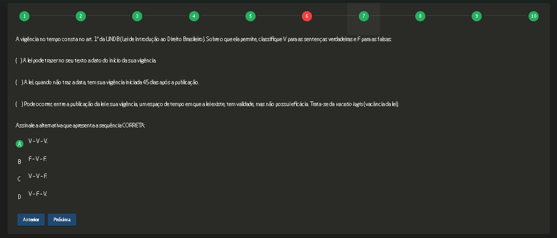 <p>1 2 3 4 5 6 7 8 9 10 A vigência no tempo consta no art UNDB(Leide Introdução ao Direito Brasileiro) queek permite, classifique V para as sentenças F para as ( lei pode seu texto adato do início da sua vigência ( quando não traz adata temsua iniciada 45dias após a entre a publicação da sua vigência umespaço de tempo emque a tem mas não Trata-se da vacatio legis (vacância da aaltemativa que apresenta a sequênc CORRETA V-V-V F-V F F D V-F-V Anterior</p>