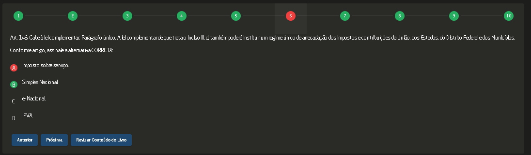 <p>1 2 3 4 5 6 7 8 9 146 Cabe à leicomplementar Parágrafo único A de que tratao inciso d também poderá instituirum regime único de arrecadação dos impostos da União, dos do Distrito Federaledos Mu Conforme artigo, assinale a Imposto sobre serviço. Simples Nacional D Anterior Próxima do</p>