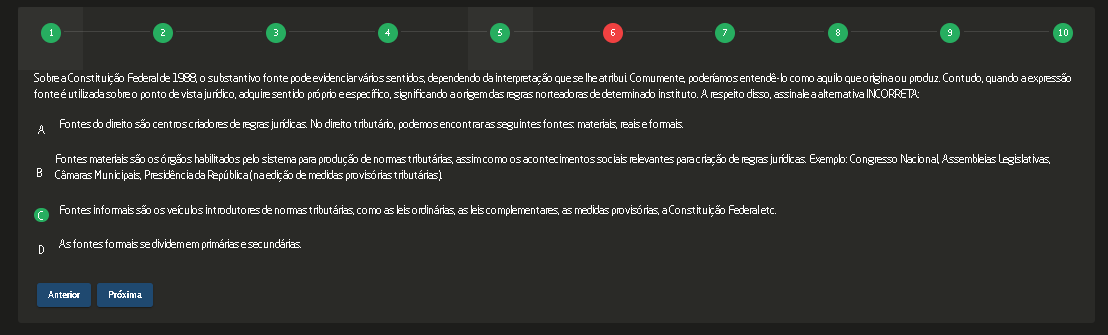 <p>1 2 3 4 5 6 7 8 9 10 Sobre aConstituição Federalde substantivo fonte pode dependendo da interpretação que: lhe atribui Comumente entendê- como queoriginaou produz. Contudo, quando a expressão fonteé utilizada: ponto de próprio significando origem das regras norteadoras de determinado A respeito disso, assinale aaltemativa INCORRETA A Fontes do direito centros criadores de No direito podemos encontraras seguintes fontes reais formais Fontes são os habilitados pelo sistema para produção de assimcomo os acontecimentos sociais relevantes para de regras Congresso Nacional Assembleias Legislativas, Câmaras Municipais Presidência da Republica (na edição de medidas tributárias) Fontes informais são introdutores de nomas como as leis as leis complementares, as medidas provisórias, Federaletc D Asfontes formais sedividem em primárias secundárias Anterior Próxima</p>