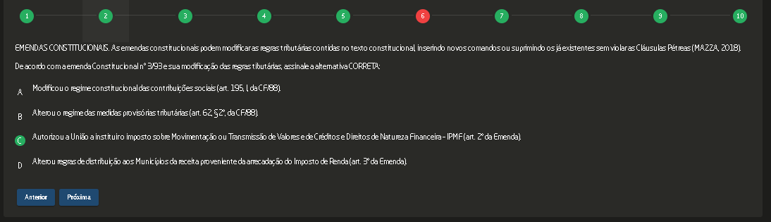 <p>1 2 3 4 5 6 7 8 9 10 EMENDAS As emendas constitucionais podem modificaras contidas no texto constitucional inserindo novos comandos ou suprimindo os sem violar as Cláusulas Pétreas (MAZZA 2018) De acordo com. emenda sua modificação das assinale a altemativa A regime constitucionaldas contribuições sociais 195 B Alterou regime das medidas provisórias tributárias (art. 6Z da Autorizou a União a instituiro imposto sobre Movimentação ou Transmissão de ede Créditos e Direitos de Natureza Financeira - IPMF(art. Z da Emenda) D Alterou regras de dist ribuição aos Municípios da receita proveniente da do Imposto de 3 da Emenda) Anterior Proxima</p>