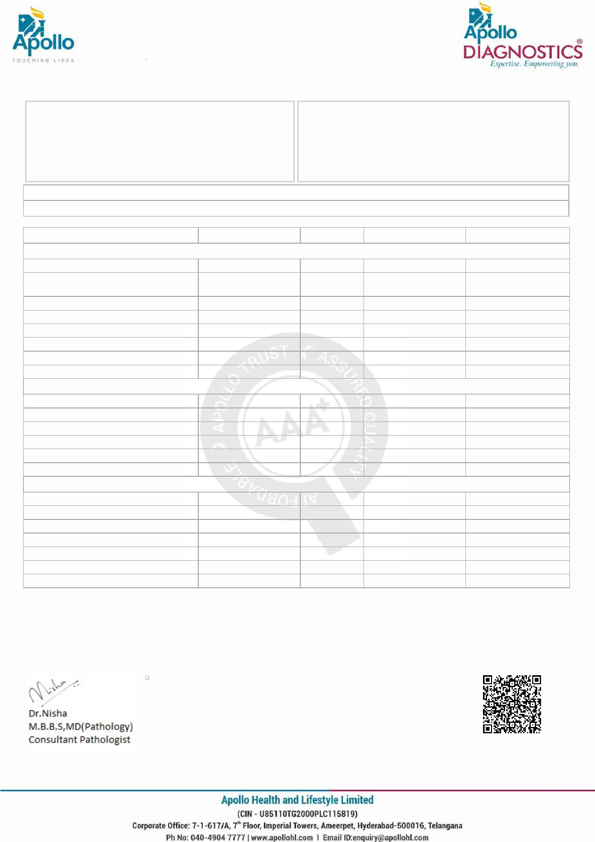 <p>Test Name Result Unit Bio. Ref. Range Method</p><p>COMPLETE BLOOD COUNT (CBC) , WHOLE BLOOD EDTA</p><p>HAEMOGLOBIN 8.4 g/dL 12-15 Spectrophotometer</p><p>PCV 28.50 % 36-46 Electronic pulse &</p><p>Calculation</p><p>RBC COUNT 4.79 Million/cu.mm 3.8-4.8 Electrical Impedence</p><p>MCV 59.4 fL 83-101 Calculated</p><p>MCH 17.5 pg 27-32 Calculated</p><p>MCHC 29.4 g/dL 31.5-34.5 Calculated</p><p>R.D.W 25.2 % 11.6-14 Calculated</p><p>TOTAL LEUCOCYTE COUNT (TLC) 6,850 cells/cu.mm 4000-10000 Electrical Impedance</p><p>DIFFERENTIAL LEUCOCYTIC COUNT (DLC)</p><p>NEUTROPHILS 63 % 40-80 Electrical Impedance</p><p>LYMPHOCYTES 31 % 20-40 Electrical Impedance</p><p>EOSINOPHILS 0.8 % 1-6 Electrical Impedance</p><p>MONOCYTES 4.5 % 2-10 Electrical Impedance</p><p>BASOPHILS 0.7 % <1-2 Electrical Impedance</p><p>CORRECTED TLC 6,850 Cells/cu.mm Calculated</p><p>ABSOLUTE LEUCOCYTE COUNT</p><p>NEUTROPHILS 4315.5 Cells/cu.mm 2000-7000 Calculated</p><p>LYMPHOCYTES 2123.5 Cells/cu.mm 1000-3000 Calculated</p><p>EOSINOPHILS 54.8 Cells/cu.mm 20-500 Calculated</p><p>MONOCYTES 308.25 Cells/cu.mm 200-1000 Calculated</p><p>BASOPHILS 47.95 Cells/cu.mm 0-100 Calculated</p><p>Neutrophil lymphocyte ratio (NLR) 2.03 0.78- 3.53 Calculated</p><p>PLATELET COUNT 219000 cells/cu.mm 150000-410000 Electrical impedence</p><p>Patient Name : Ms.JYOTI KRISHNA NAYAK</p><p>Age/Gender : 26 Y 10 M 11 D /F</p><p>UHID/MR No : ODB1.0000589458</p><p>Visit ID : DMNEOPV30070</p><p>Ref Doctor : Dr.SELF</p><p>IP/OP NO :</p><p>Collected : 14/Mar/2024 09:18AM</p><p>Received : 14/Mar/2024 12:40PM</p><p>Reported : 14/Mar/2024 01:34PM</p><p>Status : Final Report</p><p>Client Name : PUP 24X7_CREDIT</p><p>Patient location : Munnekola,Bangalore</p><p>DEPARTMENT OF HAEMATOLOGY</p><p>APOLLO FULL BODY CHECKUP - ADVANCE</p><p>SIN No:HA06644079</p><p>Page 1 of 14</p><p>Test Name Result Unit Bio. Ref. Range Method</p><p>ERYTHROCYTE SEDIMENTATION</p><p>RATE (ESR) , WHOLE BLOOD EDTA</p><p>20 mm at the</p><p>end of 1 hour</p><p>0-20 Modified Westergren</p><p>Result is rechecked. Kindly correlate clinically</p><p>Comment:</p><p>1. ESR is an acute phase reactant which indicates presence and severity of an inflammatory process. ESR is not diagnostic of any specific disease. ESR is a</p><p>screening test with low sensitivity. CRP has better sensitivity than ESR.</p><p>2. ESR Test is used to monitor the course or response to treatment of certain diseases.</p><p>3. ESR is an indirect measure of the extent of inflammation (infections, autoimmune disorders, certain anemias & malignancies).</p><p>4. There are many dieases such as typhoid in which ESR is not increased.</p><p>Patient Name : Ms.JYOTI KRISHNA NAYAK</p><p>Age/Gender : 26 Y 10 M 11 D /F</p><p>UHID/MR No : ODB1.0000589458</p><p>Visit ID : DMNEOPV30070</p><p>Ref Doctor : Dr.SELF</p><p>IP/OP NO :</p><p>Collected : 14/Mar/2024 09:18AM</p><p>Received : 14/Mar/2024 12:40PM</p><p>Reported : 14/Mar/2024 03:34PM</p><p>Status : Final Report</p><p>Client Name : PUP 24X7_CREDIT</p><p>Patient location : Munnekola,Bangalore</p><p>DEPARTMENT OF HAEMATOLOGY</p><p>APOLLO FULL BODY CHECKUP - ADVANCE</p><p>SIN No:HA06644079</p><p>Page 2 of 14</p><p>Test Name Result Unit Bio. Ref. Range Method</p><p>GLUCOSE, FASTING , NAF PLASMA 98 mg/dL 70-100 GOD - POD</p><p>Comment:</p><p>As per American Diabetes Guidelines, 2023</p><p>Fasting Glucose Values in mg/dL Interpretation</p><p>70-100 mg/dL Normal</p><p>100-125 mg/dL Prediabetes</p><p>≥126 mg/dL Diabetes</p><p><70 mg/dL Hypoglycemia</p><p>Note:</p><p>1.The diagnosis of Diabetes requires a fasting plasma glucose of > or = 126 mg/dL and/or a random / 2 hr post glucose value of > or = 200 mg/dL on at least 2</p><p>occasions.</p><p>2. Very high glucose levels (>450 mg/dL in adults) may result in Diabetic Ketoacidosis & is considered critical.</p><p>Test Name Result Unit Bio. Ref. Range Method</p><p>HBA1C (GLYCATED HEMOGLOBIN) , WHOLE BLOOD EDTA</p><p>HBA1C, GLYCATED HEMOGLOBIN 5.8 % HPLC</p><p>ESTIMATED AVERAGE GLUCOSE</p><p>(eAG)</p><p>120 mg/dL Calculated</p><p>Comment:</p><p>Reference Range as per American Diabetes Association (ADA) 2023 Guidelines:</p><p>REFERENCE GROUP HBA1C %</p><p>NON DIABETIC <5.7</p><p>PREDIABETES 5.7 – 6.4</p><p>DIABETES ≥ 6.5</p><p>DIABETICS</p><p>EXCELLENT CONTROL 6 – 7</p><p>FAIR TO GOOD CONTROL 7 – 8</p><p>UNSATISFACTORY CONTROL 8 – 10</p><p>POOR CONTROL >10</p><p>Note: Dietary preparation or fasting is not required.</p><p>1. HbA1C is recommended by American Diabetes Association for Diagnosing Diabetes and monitoring Glycemic</p><p>Patient Name : Ms.JYOTI KRISHNA NAYAK</p><p>Age/Gender : 26 Y 10 M 11 D /F</p><p>UHID/MR No : ODB1.0000589458</p><p>Visit ID : DMNEOPV30070</p><p>Ref Doctor : Dr.SELF</p><p>IP/OP NO :</p><p>Collected : 14/Mar/2024 09:18AM</p><p>Received : 14/Mar/2024 12:40PM</p><p>Reported : 14/Mar/2024 05:44PM</p><p>Status : Final Report</p><p>Client Name : PUP 24X7_CREDIT</p><p>Patient location : Munnekola,Bangalore</p><p>DEPARTMENT OF BIOCHEMISTRY</p><p>APOLLO FULL BODY CHECKUP - ADVANCE</p><p>SIN No:BI18791183</p><p>Page 3 of 14</p><p>Control by American Diabetes Association guidelines 2023.</p><p>2. Trends in HbA1C values is a better indicator of Glycemic control than a single test.</p><p>3. Low HbA1C in Non-Diabetic patients are associated with Anemia (Iron Deficiency/Hemolytic), Liver Disorders, Chronic Kidney Disease. Clinical Correlation</p><p>is advised in interpretation of low Values.</p><p>4. Falsely low HbA1c (below 4%) may be observed in patients with clinical conditions that shorten erythrocyte life span or decrease mean erythrocyte age.</p><p>HbA1c may not accurately reflect glycemic control when clinical conditions that affect erythrocyte survival are present.</p><p>5. In cases of Interference of Hemoglobin variants in HbA1C, alternative methods (Fructosamine) estimation is recommended for Glycemic Control</p><p>A: HbF >25%</p><p>B: Homozygous Hemoglobinopathy.</p><p>(Hb Electrophoresis is recommended method for detecti