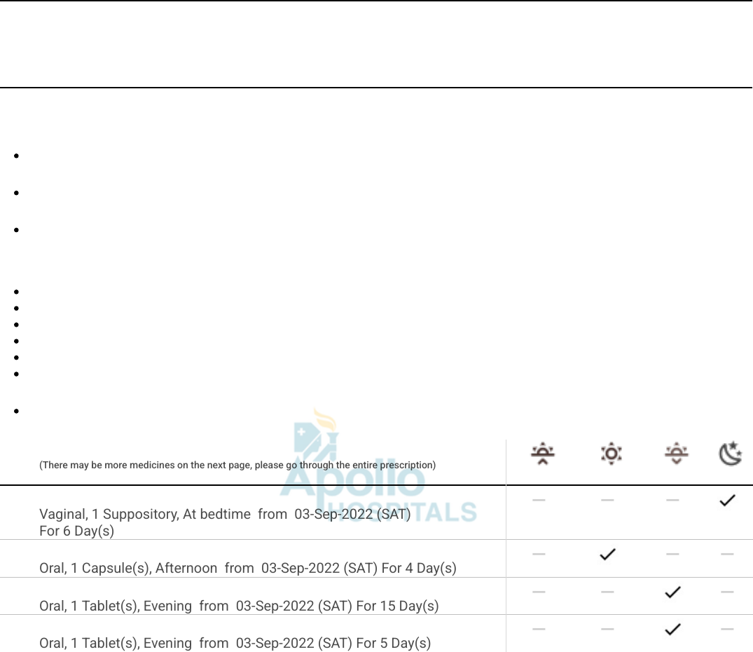 <p>ALLERGIES</p><p>No Known Allergy</p><p>PRESENTATION</p><p>Itching vula and vagina since 3days</p><p>HISTORY OF PRESENT ILLNESS</p><p>LMP-20/8/22 MH-RNF</p><p>VITALS</p><p>03-Sep-2022 09:36 AM</p><p>Weight : 58 kg</p><p>Pulse rate : 90 per minute</p><p>Blood pressure : 132/ 92 mmHg</p><p>Respiratory rate : 22 /min</p><p>SpO2 : 99 %</p><p>Fall Risk : Low Risk</p><p>PHYSICAL EXAMINATION</p><p>P/A-soft</p><p>Medicines</p><p>(There may be more medicines on the next page, please go through the entire prescription)</p><p>Morning Afternoon Evening Night</p><p>NEW CANDID CL SUPP (CLINDAMYCIN,CLOTRIMAZOLE)</p><p>Vaginal, 1 Suppository, At bedtime from 03-Sep-2022 (SAT)</p><p>For 6 Day(s)</p><p>Bedtime</p><p>NEW CANDIFORCE 200MG TAB (ITRACONAZOLE)</p><p>Oral, 1 Capsule(s), Afternoon from 03-Sep-2022 (SAT) For 4 Day(s)</p><p>NEW VIBACT DS CAP (LACTOBACILLUS)</p><p>Oral, 1 Tablet(s), Evening from 03-Sep-2022 (SAT) For 15 Day(s)</p><p>NEW LAVETA 10 TAB (LEVOCETIRIZINE)</p><p>Oral, 1 Tablet(s), Evening from 03-Sep-2022 (SAT) For 5 Day(s)</p><p>Dr. SHASHI SINGH</p><p>Regn. No. - 16590/2008 (Odisha)</p><p>Dr. SHASHI SINGH OUTPATIENT SUMMARY AND PRESCRIPTION</p><p>Obstetrics And Gynaecology</p><p>Ms. JYOTI KRISHNA NAYAK UHID : ODB1.0000589458</p><p>Female, DOB : 04-May-1997 (25y) OP Number - Visit ID : OP131152-1 Visit date : 03-Sep-2022</p><p>Address : VIM-627SAILASHREE VIHAR Bhubaneswar 751016 Odisha India</p><p>Phone : 91-8763022907 Email : nayakjk60@gmail.com</p><p>Page 1 of 1</p>