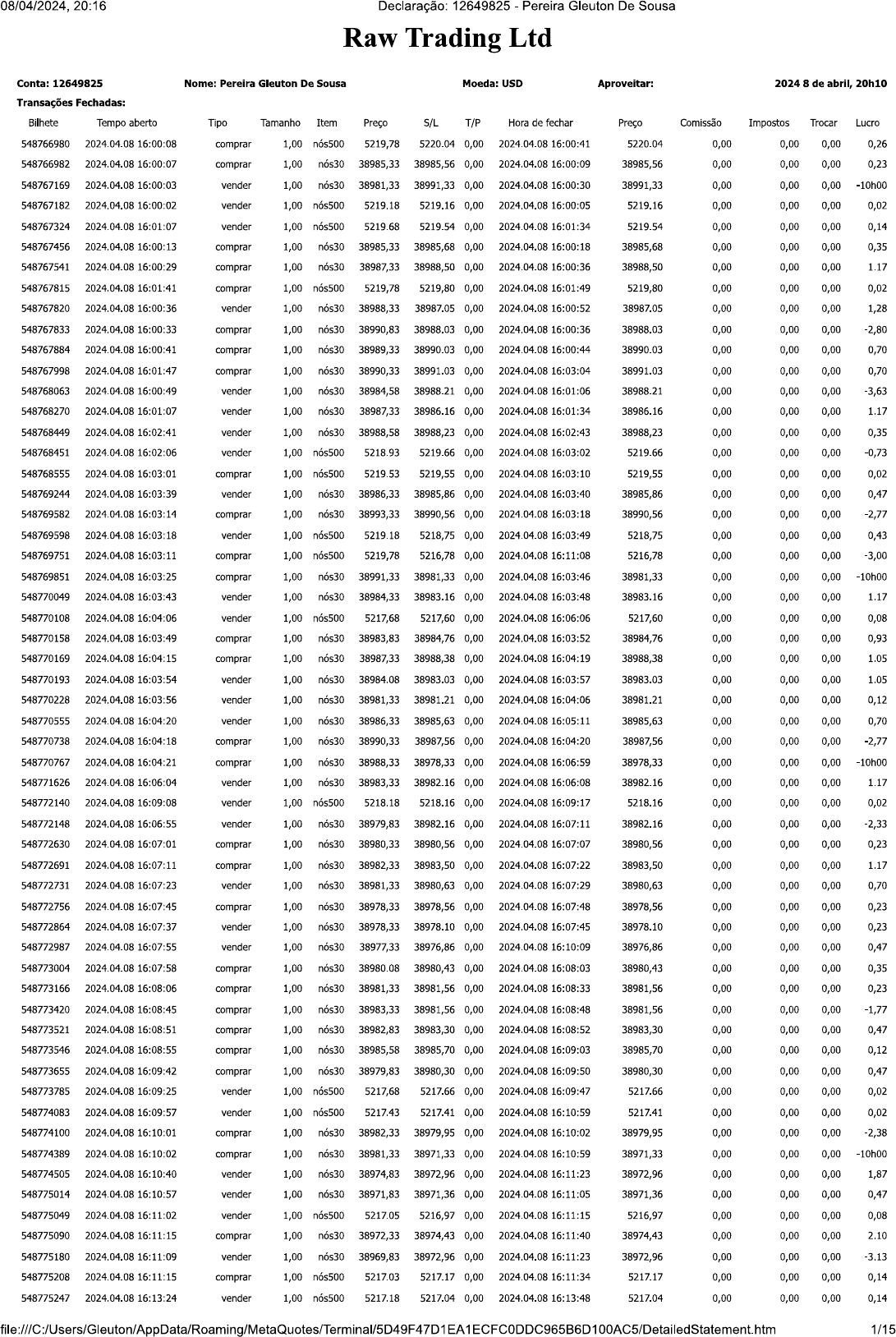<p>08/04/2024, 20:16 Declaração: Pereira Gleuton De Sousa Raw Trading Ltd Conta: 12649825 Nome: Pereira Gleuton De Sousa Moeda: USD Aproveitar: 2024 8 de abril, 20h10 Transações Fechadas: Bilhete Tempo aberto Tipo Tamanho Item Preço S/L T/P Hora de fechar Preço Comissão Impostos Trocar Lucro 548766980 2024.04.08 16:00:08 comprar 1,00 nós500 5219,78 5220.04 0,00 2024.04.08 16:00:41 5220.04 0,00 0,00 0,00 0,26 548766982 2024.04.08 16:00:07 comprar 1,00 nós30 38985,33 38985,56 0,00 2024.04.08 16:00:09 38985,56 0,00 0,00 0,00 0,23 548767169 2024.04.08 16:00:03 vender 1,00 nós30 38981,33 38991,33 0,00 2024.04.08 16:00:30 38991,33 0,00 0,00 0,00 -10h00 548767182 2024.04.08 16:00:02 vender 1,00 nós500 5219.18 5219.16 0,00 2024.04.08 16:00:05 5219.16 0,00 0,00 0,00 0,02 548767324 2024.04.08 16:01:07 vender 1,00 nós500 5219.68 5219.54 0,00 2024.04.08 16:01:34 5219.54 0,00 0,00 0,00 0,14 548767456 2024.04.08 16:00:13 comprar 1,00 nós30 38985,33 38985,68 0,00 2024.04.08 16:00:18 38985,68 0,00 0,00 0,00 0,35 548767541 2024.04.08 16:00:29 comprar 1,00 nós30 38987,33 38988,50 0,00 2024.04.08 16:00:36 38988,50 0,00 0,00 0,00 1.17 548767815 2024.04.08 16:01:41 comprar 1,00 nós500 5219,78 5219,80 0,00 2024.04.08 16:01:49 5219,80 0,00 0,00 0,00 0,02 548767820 2024.04.08 16:00:36 vender 1,00 nós30 38988,33 38987.05 0,00 2024.04.08 16:00:52 38987.05 0,00 0,00 0,00 1,28 548767833 2024.04.08 16:00:33 comprar 1,00 nós30 38990,83 38988.03 0,00 2024.04.08 16:00:36 38988.03 0,00 0,00 0,00 -2,80 548767884 2024.04.08 16:00:41 comprar 1,00 nós30 38989,33 38990.03 0,00 2024.04.08 16:00:44 38990.03 0,00 0,00 0,00 0,70 548767998 2024.04.08 16:01:47 comprar 1,00 nós30 38990,33 38991.03 0,00 2024.04.08 16:03:04 38991.03 0,00 0,00 0,00 0,70 548768063 2024.04.08 16:00:49 vender 1,00 nós30 38984,58 38988.21 0,00 2024.04.08 16:01:06 38988.21 0,00 0,00 0,00 -3,63 548768270 2024.04.08 16:01:07 vender 1,00 nós30 38987,33 38986.16 0,00 2024.04.08 16:01:34 38986.16 0,00 0,00 0,00 1.17 548768449 2024.04.08 16:02:41 vender 1,00 nós30 38988,58 38988,23 0,00 2024.04.08 16:02:43 38988,23 0,00 0,00 0,00 0,35 548768451 2024.04.08 16:02:06 vender 1,00 nós500 5218.93 5219.66 0,00 2024.04.08 16:03:02 5219.66 0,00 0,00 0,00 -0,73 548768555 2024.04.08 16:03:01 comprar 1,00 nós500 5219.53 5219,55 0,00 2024.04.08 16:03:10 5219,55 0,00 0,00 0,00 0,02 548769244 2024.04.08 16:03:39 vender 1,00 nós30 38986,33 38985,86 0,00 2024.04.08 16:03:40 38985,86 0,00 0,00 0,00 0,47 548769582 2024.04.08 16:03:14 comprar 1,00 nós30 38993,33 38990,56 0,00 2024.04.08 16:03:18 38990,56 0,00 0,00 0,00 -2,77 548769598 2024.04.08 16:03:18 vender 1,00 nós500 5219.18 5218,75 0,00 2024.04.08 16:03:49 5218,75 0,00 0,00 0,00 0,43 548769751 2024.04.08 16:03:11 comprar 1,00 nós500 5219,78 5216,78 0,00 2024.04.08 16:11:08 5216,78 0,00 0,00 0,00 -3,00 548769851 2024.04.08 16:03:25 comprar 1,00 nós30 38991,33 38981,33 0,00 2024.04.08 16:03:46 38981,33 0,00 0,00 0,00 -10h00 548770049 2024.04.08 16:03:43 vender 1,00 nós30 38984,33 38983.16 0,00 2024.04.08 16:03:48 38983.16 0,00 0,00 0,00 1.17 548770108 2024.04.08 16:04:06 vender 1,00 nós500 5217,68 5217,60 0,00 2024.04.08 16:06:06 5217,60 0,00 0,00 0,00 0,08 548770158 2024.04.08 16:03:49 comprar 1,00 nós30 38983,83 38984,76 0,00 2024.04.08 16:03:52 38984,76 0,00 0,00 0,00 0,93 548770169 2024.04.08 16:04:15 comprar 1,00 nós30 38987,33 38988,38 0,00 2024.04.08 16:04:19 38988,38 0,00 0,00 0,00 1.05 548770193 2024.04.08 16:03:54 vender 1,00 nós30 38984.08 38983.03 0,00 2024.04.08 16:03:57 38983.03 0,00 0,00 0,00 1.05 548770228 2024.04.08 16:03:56 vender 1,00 nós30 38981,33 38981.21 0,00 2024.04.08 16:04:06 38981.21 0,00 0,00 0,00 0,12 548770555 2024.04.08 16:04:20 vender 1,00 nós30 38986,33 38985,63 0,00 2024.04.08 16:05:11 38985,63 0,00 0,00 0,00 0,70 548770738 2024.04.08 16:04:18 comprar 1,00 nós30 38990,33 38987,56 0,00 2024.04.08 16:04:20 38987,56 0,00 0,00 0,00 -2,77 548770767 2024.04.08 16:04:21 comprar 1,00 nós30 38988,33 38978,33 0,00 2024.04.08 16:06:59 38978,33 0,00 0,00 0,00 -10h00 548771626 2024.04.08 16:06:04 vender 1,00 nós30 38983,33 38982.16 0,00 2024.04.08 16:06:08 38982.16 0,00 0,00 0,00 1.17 548772140 2024.04.08 16:09:08 vender 1,00 nós500 5218.18 5218.16 0,00 2024.04.08 16:09:17 5218.16 0,00 0,00 0,00 0,02 548772148 2024.04.08 16:06:55 vender 1,00 nós30 38979,83 38982.16 0,00 2024.04.08 16:07:11 38982.16 0,00 0,00 0,00 -2,33 548772630 2024.04.08 16:07:01 comprar 1,00 nós30 38980,33 38980,56 0,00 2024.04.08 16:07:07 38980,56 0,00 0,00 0,00 0,23 548772691 2024.04.08 16:07:11 comprar 1,00 nós30 38982,33 38983,50 0,00 2024.04.08 16:07:22 38983,50 0,00 0,00 0,00 1.17 548772731 2024.04.08 16:07:23 vender 1,00 nós30 38981,33 38980,63 0,00 2024.04.08 16:07:29 38980,63 0,00 0,00 0,00 0,70 548772756 2024.04.08 16:07:45 comprar 1,00 nós30 38978,33 38978,56 0,00 2024.04.08 16:07:48 38978,56 0,00 0,00 0,00 0,23 548772864 2024.04.08 16:07:37 vender 1,00 nós30 38978,33 38978.10 0,00 2024.04.08 16:07:45 38978.10 0,00 0,00 0,00 0,23 548772987 2024.04.08 16:07:55 vender 1,00 nós30 38977,33 38976,86 0,00 2024.04.08 16:10:09 38976,86 0,00 0,00 0,00 0,47 548773004 2024.04.08 16:07:58 comprar 1,00 nós30 38980.08 38980,43 0,00 2024.04.08 16:08:03 38980,43 0,00 0,00 0,00 0,35 548773166 2024.04.08 16:08:06 comprar 1,00 nós30 38981,33 38981,56 0,00 2024.04.08 16:08:33 38981,56 0,00 0,00 0,00 0,23 548773420 2024.04.08 16:08:45 comprar 1,00 nós30 38983,33 38981,56 0,00 2024.04.08 16:08:48 38981,56 0,00 0,00 0,00 -1,77 548773521 2024.04.08 16:08:51 comprar 1,00 nós30 38982,83 38983,30 0,00 2024.04.08 16:08:52 38983,30 0,00 0,00 0,00 0,47 548773546 2024.04.08 16:08:55 comprar 1,00 nós30 38985,58 38985,70 0,00 2024.04.08 16:09:03 38985,70 0,00 0,00 0,00 0,12 548773655 2024.04.08 16:09:42 comprar 1,00 nós30 38979,83 38980,30 0,00 2024.04.08 16:09:50 38980,30 0,00 0,00 0,00 0,47 548773785 2024.04.08 16:09:25 vender 1,00 nós500 5217,68 5217.66 0,00 2024.04.08 16:09:47 5217.66 0,00 0,00 0,00 0