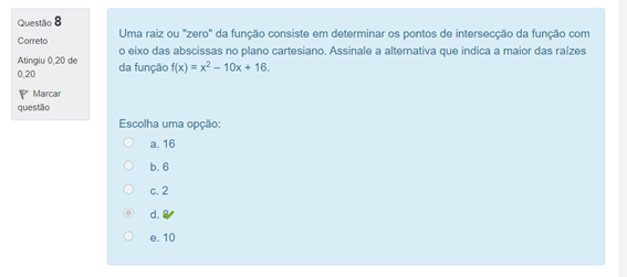 <p>Questão 8 Uma raiz ou "zero" da função consiste em determinar os pontos de intersecção da função com Correto eixo das abscissas no plano Assinale a alternativa que indica a maior das Atingiu 0,20 de da função f(x) = x2 - 0,20 Marcar questão Escolha uma opção: a. 16 b. 6 2 d.</p>