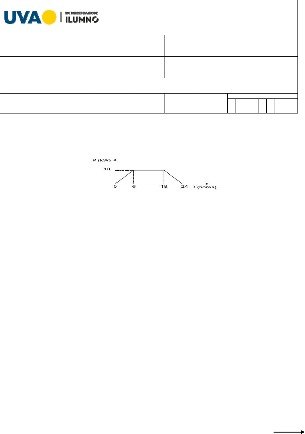 <p>FOLHA DE QUESTÕES (A)</p><p>CURSO: DISCIPLINA:</p><p>ASS.: NOME:</p><p>Professor : Rita de Cassia Azevedo de Figueiredo</p><p>DATA: Nº de ordem GRAU: PROVA: TURMA MATRÍCULA:</p><p>24/09/2015</p><p>P1</p><p>1- (2,0) Um consumidor industrial, que também é um autoprodutor de energia, tem uma</p><p>curva de carga diária, fornecida pela distribuidora que o atende, conforme a figura</p><p>abaixo. A produção de energia diária desse consumidor pode ser representada por</p><p>uma potência constante de 3 KW durante as 24 horas do dia.</p><p>Considerando o consumo total da instalação durante as 24 horas do dia, o consumo de</p><p>energia diário (kWh), a demanda média (kW) e o fator de carga, são, respectivamente,</p><p>(a) 180,0 - 4,5 - 0,45 (b) 180,0 - 4,5 - 0,80 (c) 180,0 - 7,5 - 0,75</p><p>(d) 252,0 - 4,5 - 0,80 (e) 252,0 - 10,5 - 0,80</p><p>2- (2,0) Uma central de potência base tem o fator de carga mensal igual a 75%.</p><p>A reserva mantida e acima do pico de carga é 8500 kW.</p><p>Qual o número de horas que a central operou?</p><p>(a) 267 h (b) 370 h (c) 720 h (d) 158 h (e) 520 h</p><p>3- (1,5) A carga conectada é de 260 kW. A energia consumida no trimestre é de 99 MWh.</p><p>O fator de carga é 25%. Qual é o fator de demanda e o de capacidade?</p><p>(a) 0,88 - 0,18 (b) 0,45 - 0,85 (c) 0,70 - 0,88 (d) 0,50 - 0,85 (e) 0,70 - 0,18</p><p>4- (1,5) Considerando o fator de carga de um circuito igual a 0,5 e que sua carga máxima</p><p>é de 100 kW, com um fator de potência igual a 1, determine a potência média e a</p><p>energia consumida em um dia.</p><p>(a)200kW e 4800kWh. (b)100kW e 2400kWh. (c)50kW e 1200kWh.</p><p>(d) 50kW e 2400kWh. (e) 100kW e 4800kWh.</p><p>Vire</p><p>Felipe Meirelles Coelho</p><p>Rectangle</p><p>5- (1,5) Um consumidor residencial tem uma carga que apresenta demanda instantânea</p><p>de 1 KW, que se mantém constante durante três minutos, ao fim dos quais passa</p><p>bruscamente para 1,2 KW, mantém-se constante durante três minutos e assim</p><p>continua de 0,2 em 0,2 KW até atingir 4 KW, quando se mantém constante por três</p><p>minutos ao fim dos quais cai abruptamente para 1 KW e repete o ciclo. Determinar a</p><p>demanda dessa carga no intervalo de tempo de 22 minutos.</p><p>(a) 53 (b) 160 (c) 36 (d) 27 (e) 220</p><p>6- (1,5) Suponha que, ao iniciar uma medição de consumo de energia em t=0, o medidor</p><p>marcava 10 kW e, após 10 horas de consumo, a demanda passou, linearmente, para</p><p>60 kW. A energia consumida foi de:</p><p>(a) 250 kWh (b) 300 kWh (c) 35 kWh (d) 25kWh (e) 350 kWh</p><p>Boa Sorte!</p>