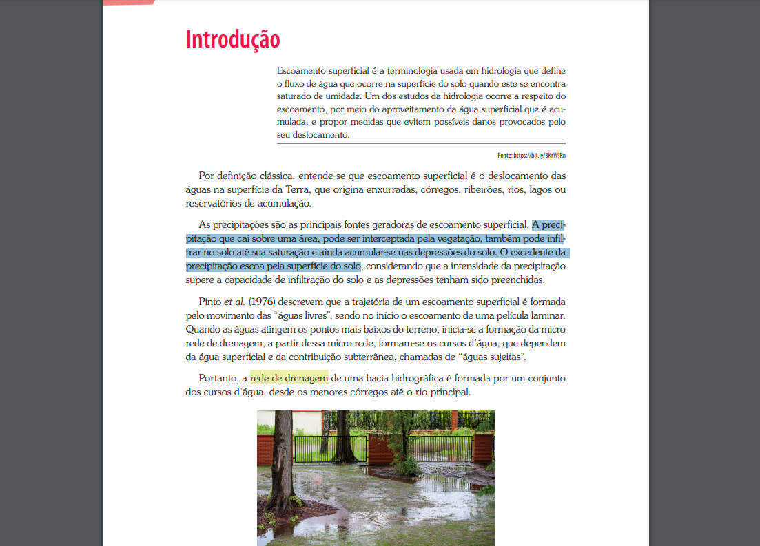 <p>Introdução Escoamento superficial é a terminologia usada em hidrologia que define fluxo de água que ocorre na superfície do solo quando este se encontra saturado de umidade. Um dos estudos da hidrologia ocorre a respeito do escoamento, por meio do aproveitamento da água superficial que é acu- mulada, e propor medidas que evitem possíveis danos provocados pelo seu Fonte: Por definição clássica, entende-se que escoamento superficial é O deslocamento das águas na superfície da Terra, que enxurradas, córregos, rios, lagos ou reservatórios de acumulação. As precipitações são as principais fontes geradoras de escoamento superficial. A preci- pitação que cai sobre uma pode ser interceptada pela vegetação, também pode infil- trar no solo até sua saturação e ainda acumular-se nas depressões do solo. excedente da precipitação escoa pela superfície do solo. considerando que a intensidade da precipitação supere a capacidade de infiltração do solo e as depressões tenham sido preenchidas. Pinto et al. (1976) descrevem que a trajetória de um escoamento superficial é formada pelo movimento das livres", sendo no início escoamento de uma película laminar. Quando as águas atingem os pontos mais baixos do terreno, inicia-se a formação da micro rede de drenagem, a partir dessa micro rede, formam-se os cursos d'água, que dependem da água superficial e da contribuição subterrânea, chamadas de sujeitas". Portanto, a rede de drenagem de uma bacia é formada por um conjunto dos cursos d'água, desde os menores córregos até rio principal.</p>