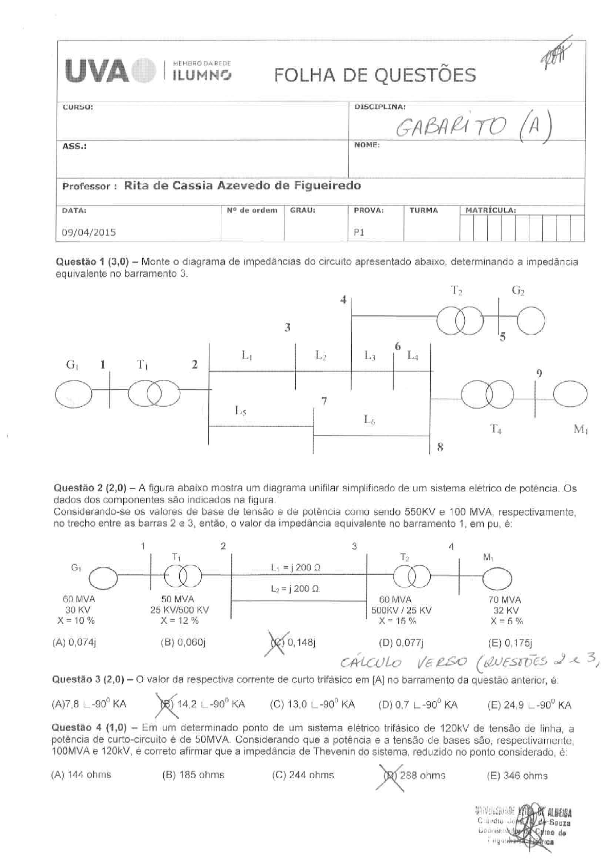 <p>UVA MEMBRO DA REDE ILUMNO FOLHA DE QUESTÕES CURSO: DISCIPLINA: GABARITO (A) NOME: Professor Rita de Cassia Azevedo de Figueiredo DATA: N° de ordem GRAU: PROVA: TURMA 09/04/2015 P1 Questão 1 (3,0) Monte diagrama de impedâncias do circuito apresentado abaixo, determinando a impedância equivalente no barramento 3. T2 G2 4 3 5 6 L L2 L3 L4 G 1 T 2 9 7 T4 M 8 Questão 2 (2,0) - A figura abaixo mostra um diagrama unifilar simplificado de um sistema elétrico de potência. Os dados dos componentes são indicados na figura Considerando-se os valores de base de tensão e de potência como sendo 550KV e 100 MVA, respectivamente, no trecho entre as barras 2 e 3, então, valor da impedância equivalente no barramento em pu, 1 2 3 4 M 60 MVA 50 MVA 60 MVA 70 MVA 30 KV 25 KV/500 KV 500KV / 25 KV (A) (B) (D) 0,077 (E) CALCULO VERSO (QUESTOES 3, Questão 3 (2,0) valor da respectiva corrente de curto trifásico em [A] no barramento da questão anterior, (A)7,8 KA -90° KA (C) 13,0 L -90° KA (D) 0,7 KA (E) 24,9 KA Questão 4 (1,0) Em um determinado ponto de um sistema elétrico trifásico de 120kV de tensão de linha, a potência de curto-circuito é de Considerando que a potência e a tensão de bases 100MVA e é correto afirmar que a impedância de Thevenin do sistema, reduzido no ponto considerado, (A) 144 ohms (B) 185 ohms (C) 244 ohms 288 ohms (E) 346 ohms ALMEIDA de</p><p>Questão 5 (1,0) A figura abaixo mostra diagrama unifilar de um sistema elétrico de potência, qual contém os dados dos seus principais equipamentos elétricos. Considere que o sistema opera em regime permanente com tensão nominal e que as correntes de carga nesta condição são frente às correntes de Suponha que as reatâncias de cada equipamento são informadas e que as resistências são Considerando as informações acima, a base de potência igual a 100 MVA e a base de tensão no gerador igual a 13,8 julgue os itens Havendo uma falta trifásica no lado de baixa tensão do transformador gerador G3 contribuirá para a corrente de falta. Ou seja, a sua presença no circuito afetará a intensidade da corrente de curto-circuito no lado de baixa tensão do transformador T1 Certo ( ) Errado D. de 50 MVA T 13.8 138 Questão 6 (1,0) De acordo com as informações abaixo, e supondo que o gerador está operando com tensão de 25 o valor do módulo da corrente que passa pela linha, em valores por unidade (pu) na base da linha, é 0,5 (B) 1,0 (C) 1,5 (D) 2,0 (E) 3,0 T. T. A figura acima mostra diagrama de parte de um sistema elétrico de circuito é composto por um gera- dor, dois transformadores uma linha de e uma Para trecho entre dois trans- como valores de base a potência de 100 MVA a nominal da linha de 500 Os dados de cada componente são apresentados no quadro abaixo, em respectivas Componente Potência Base Tensão Base Gerador 10 MVA 25 KV T. 0.05 50 MVA 100 kV Transformador 10,10 100 MVA 500 KV/100 KV Linha de Transmissão 0,05 100 MVA 500 KV Carga 0,20 100 MVA Boa Sorte! (A) BE do Souza</p><p>= 550KV Sb = 100 HVA 25 = VbLT 500 500 27,5 KV = jo,s 30 60 j0,12 50 XLTF j 100 = pu = pu = 25 x 100 = = 32 2 100 = = 27,5 70 letra (c) pu Icc(pu) = = Sb = (B) Icc 167 X 2099.45 14.21-90 KA</p><p>4 100 HVA = Sb 120 KV = Scc (pu) = = 500 = Sb 100 Icc(pu) = 0,5 pu = (pu) Icc (pu) = Vo Zeq = Vo = = Icc 0,5 = = 2 x (120)2 288 = 100 6 : XLT Xc 500K VG look = 25 = 0,25 XG(pu) = 100 25 100 10 = 10,05 pu = 10,05 100 50 XL (pu) jo,os pu XTOTAL XT2(pu) = pu pu Xc pu I = 0,25 on Z J0,45 0,25</p>