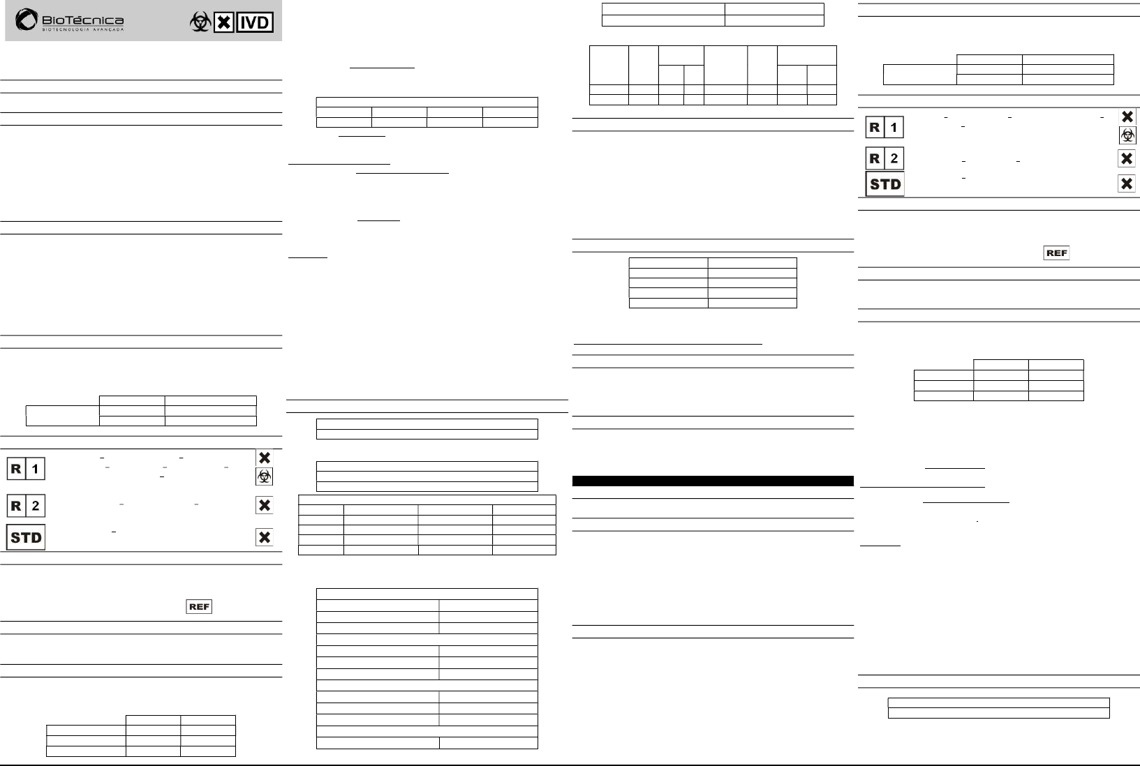 <p>BIOTÉCNICA IND.COM. LTDA - CNPJ: 025340690001/20. Avenida Washington Ribeiro, 200 - Industrial Miguel de Luca</p><p>CEP 37072-030 Varginha-MG BRASIL Tel/fax: +55 35 3214 4646 www.biotecnica.ind.br Revisão/Revision/Revisión: 00 – 13/03/2023</p><p>Ureia UV VET</p><p>Urea UV VET / Urea UV VET</p><p>Ref. 90.011.00</p><p>Responsável Técnico:</p><p>Dr. Gilson Sério Pizzo</p><p>CRF MG – 5310</p><p>FINALIDADE</p><p>Kit destinado à determinação de ureia em amostras de soro e plasma. Uso em diagnóstico</p><p>veterinário in vitro.</p><p>CONDIÇÕES DE ARMAZENAMENTO, MANUSEIO E PREPARO DO PRODUTO</p><p> Conservar de 2 a 8 °C, permanecendo fora da temperatura especificada somente o</p><p>tempo necessário para a realização dos testes. Manter ao abrigo da luz.</p><p> Após aberto, o produto em uso é estável até a validade impressa no rótulo, desde que</p><p>seguidas as condições de armazenamento recomendadas (2 a 8 °C).</p><p> Não usar reagentes cuja data de validade tenha expirado.</p><p> Reagente de Trabalho (RT): misturar na proporção de 4 partes de R1 + 1 parte de R2.</p><p>Homogeneizar suavemente. O reagente de trabalho é estável por 4 semanas, desde</p><p>que seguidas as condições de preparo e armazenamento recomendadas (2 a 8 °C). A</p><p>leitura de absorbância para o reagente inferior a 0,900, em espectrofotômetro zerado</p><p>com água purificada em 340 nm, indica a sua deterioração.</p><p>PRINCÍPIO DE FUNCIONAMENTO</p><p>Método: Enzimático UV</p><p>A ureia da amostra é hidrolisada pela enzima urease com produção de gás carbônico e</p><p>íons amônio. Estes são captados por uma segunda enzima, a glutamato desidrogenase,</p><p>que em presença dos substratos NADH e -cetoglutarato produz NAD+ e glutamato. A taxa</p><p>de diminuição da concentração de NADH no meio pode ser espectrofotometricamente</p><p>determinada em 340 nm, sendo proporcional à concentração de ureia na amostra.</p><p>Uréia + H2O ⎯⎯⎯ 2 NH4</p><p>+ + CO2</p><p>NH4</p><p>+ + -cetoglutarato + NADH + H+</p><p>⎯⎯⎯⎯⎯⎯⎯⎯⎯⎯⎯⎯⎯⎯⎯⎯⎯⎯⎯ Glutamato + NAD+</p><p>AMOSTRAS: TIPO, COLETA, MANUSEIO, PREPARO E PRESERVAÇÃO</p><p>Tipo de Amostra: soro, plasma (EDTA e heparina).</p><p>Coleta e Manuseio: realizar a coleta da amostra conforme as Boas Práticas de Laboratório</p><p>Clínico. Todas as amostras devem ser tratadas como material biológico potencialmente</p><p>infectante.</p><p>Preservação:</p><p>Temperatura Período de Estabilidade</p><p>Soro e Plasma*</p><p>4 a 8 °C 7 dias</p><p>-20 °C 1 ano</p><p>* Os anticoagulantes citrato, fluoreto e oxalato de sódio interferem na dosagem de ureia.</p><p>DESCRIÇÃO DO PRODUTO</p><p>Tampão TRIS > 100 mmol/L; EDTA > 1 mmol/L; ácido</p><p>alfacetoglutárico > 2 mmol/L; ADPK > 1 mmol/L; urease > 5000</p><p>U/L; glutamato desidrogenase > 1000 U/L; ativadores;</p><p>detergentes; estabilizantes; conservantes.</p><p>Tampão carbonato > 2 mmol/L; NADH > 0,5 mmol/L;</p><p>conservante.</p><p>Tampão fosfato > 2 mmol/L; conservante; ureia em</p><p>concentração equivalente a 70 mg/dL. Rastreável ao material</p><p>de referência NIST 912a.</p><p>CONTROLE DE QUALIDADE</p><p>O uso de controles deve ser prática rotineira no laboratório. Para Calibração e Controle</p><p>Interno de Qualidade Laboratorial, recomenda-se o uso do calibrador e dos controles</p><p>abaixo:</p><p>Calibrador - Autocal Vet</p><p>Controle Normal – Quantinorm Vet</p><p>Controle Patológico – Quantialt Vet</p><p>90.039.00</p><p>90.040.00</p><p>90.041.00</p><p>MATERIAL NECESSÁRIO PARA REALIZAÇÃO DO ENSAIO</p><p> Espectrofotômetro ou fotômetro para leitura em 340 nm.</p><p> Banho de água termostatizado a 37 °C e tubos de ensaio.</p><p> Pipetas de vidro e/ou automáticas, relógio ou cronômetro.</p><p>PROCEDIMENTO DE ENSAIO, CÁLCULOS E INTERPRETAÇÃO</p><p>A) PROCEDIMENTO DE ENSAIO</p><p>1. Pré-aquecer o reagente de trabalho durante 3 minutos a 37 °C.</p><p>2. Zerar o equipamento de leitura com água purificada em 340 nm.</p><p>3. Pipetar em tubos de ensaio:</p><p>STD Amostra</p><p>STD 10 L -</p><p>Amostra - 10 L</p><p>Reagente de Trabalho 1,0 mL 1,0 mL</p><p>4. Homogeneizar e inserir nas porta-cubetas termostatizadas a 37ºC. Acionar o</p><p>cronômetro.</p><p>5. Medir a absorbância em 340 nm aos 30 segundos (A1) e aos 120 segundos (A2), da</p><p>amostra e do padrão.</p><p>B) CÁLCULOS</p><p>Ureia UV (mg/dL) = (A1 - A2) da Amostra x Concentração do STD (mg/dL)</p><p>(A1 - A2) do STD</p><p>Exemplo:</p><p>Concentração do Padrão = 70 mg/dL</p><p>Leituras de Absorbância</p><p>Amostra A1 Amostra A2 STD A1 STD A2</p><p>1,348 1,243 1,350 1,160</p><p>Ureia (mg/dL) = (1,348 – 1,243) x 70 = 38,7 mg/dL</p><p>(1,350 – 1,160)</p><p>Utilizando o Fator de Calibração:</p><p>Fator de Calibração = Concentração do STD (mg/dL)</p><p>(A1 - A2) do STD</p><p>Ureia (mg/dL) = (A1 - A2) da Amostra x Fator de Calibração</p><p>Exemplo:</p><p>Fator de Calibração = 70 = 368,4</p><p>1,350 - 1,160</p><p>Ureia (mg/dL) = (1,348 – 1,243) x 368,4 = 38,7 mg/dL</p><p>Automação: Este procedimento pode ser aplicado na maioria dos analisadores</p><p>automatizados. Os protocolos estão disponíveis em www.biotecnica.ind.br.</p><p>C) INTERPRETAÇÃO</p><p>A uréia é sintetizada no fígado através da arginase e é o principal produto do catabolismo</p><p>proteico. A uréia é eliminada através do filtrado glomerular, em concentração igual à do</p><p>sangue. Quando há maior velocidade de fluxo há menor absorção de uréia e vice-versa.</p><p>Em situações em que ocorre baixa filtração glomerular, observa-se maior retenção da</p><p>uréia. Isso ocasiona um aumento da concentração sanguínea. A concentração de uréia é</p><p>alterada por fatores extra-renais como ingesta proteica aumentada e jejum prolongado.</p><p>Devido a essas interferências, a ureia não é um bom marcador do funcionamento renal se</p><p>analisada