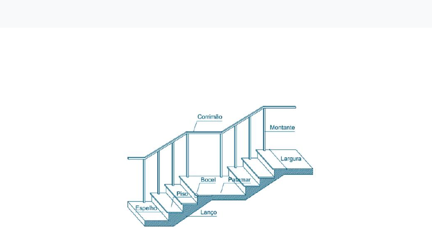 <p>Escadas</p><p>Condições de conclusão</p><p>Concluído</p><p>A escada é um elemento arquitetônico que visa proporcionar a circulação vertical entre</p><p>dois ou mais pisos de diferentes níveis. Devem-se considerar no projeto de uma escada</p><p>os seguintes elementos: degrau, piso, espelho, bocel, corrimão, montante, guarda-corpo,</p><p>lanço, patamar e largura.</p><p>Figura 1 - Elementos de uma escada</p><p>Fonte: CTISM</p><p>Descrição da imagem: Desenho de uma escada indicando seus componentes: a largura, montante (escora que sustenta o corrimão), patamar, corrimão, bocel, lanço, piso e espelho.</p><p>• Degrau é o conjunto de dois elementos: piso e espelho.</p><p>• O lanço de uma escada é uma sequência ininterrupta de degraus.</p><p>• O guarda-corpo é formado pelos montantes e corrimão. Recomenda-se que a</p><p>altura do corrimão varie entre 80 e 92 cm.</p><p>• O bocel é a borda saliente do degrau (mínimo: 1,5 cm e máximo: 2,5 cm).</p><p>• O patamar é um trecho horizontal para descanso intermediário.</p><p>Há a necessidade de um patamar intermediário quando a altura a vencer for superior a 3</p><p>m.</p><p>Tipos de escadas</p><p>As escadas podem ser soltas ou engastadas. A escada engastada é a que se encontra</p><p>entre duas paredes paralelas. Em relação à forma, as escadas podem ser de lanço reto,</p><p>curvo ou misto.</p><p>Figura 2 - Tipos de escadas</p><p>Fonte: CTISM</p><p>Descrição da imagem: Desenho de 3 tipos de escada. A escada engastada que fica entra duas paredes paralelas, em formato de "U", a escada solta apoiada em uma parede, em formato de "L"; e</p><p>a escada com três lanços retos que inicia com uma lanço e depois de subdivide em duas escadas uma para cada lado, em formato de "T".</p><p>A escada helicoidal (ou caracol) é um tipo de escada curva que se desenvolve em hélice</p><p>em torno de um eixo. O vão central de uma escada helicoidal é chamado de bomba.</p><p>Quando o núcleo central for maciço, ele recebe o nome de pião.</p><p>Figura 3 - Escada helicoidal</p><p>Fonte: CTISM</p>
