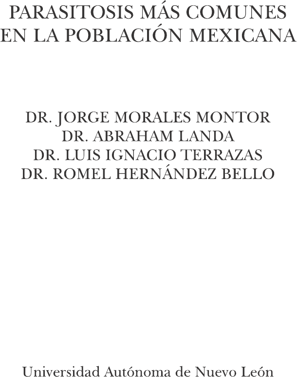 <p>PARASITOSIS MÁS COMUNES EN LA POBLACIÓN MEXICANA DR. JORGE MORALES MONTOR DR. ABRAHAM LANDA DR. LUIS IGNACIO TERRAZAS DR. ROMEL HERNÁNDEZ BELLO Universidad Autónoma de Nuevo León</p><p>UANL CASA UNIVERSITARIA DEL LIBRO EDITORIAL UNIVERSITARIA UANL UNIVERSIDAD AUTÓNOMA DE NUEVO LEÓN R Rogelio Garza Rivera Rector Carmen del Rosario de la Fuente García Secretaria General Celso José Garza Acuña Secretario de Extensión y Cultura Antonio Ramos Revillas Director de Editorial Universitaria Santos Guzmán López Facultad de Medicina Casa del Libro. Padre Mier 909 poniente, esquina con Vallarta Centro, Monterrey, Nuevo León, México, C.P. 64440 Teléfono: (5281) 8329 4111 / Fax: (5281) 8329 4095 Correo electrónico: publicaciones@uanl.mx Página web: www.uanl.m/publicaciones Primera edición, 2016 C Universidad Autónoma de Nuevo León C Jorge Morales Montor, Abraham Landa, Luis Ignacio Terrazas y Romel Bello ISBN 978-607-27-0110-6 Impreso en Monterrey, México Printed in Monterrey, Mexico</p><p>Prólogo e acuerdo a estadísticas de la Organización Mun- D dial de la Salud, dos terceras partes de la pobla- ción mundial están expuestas a diferentes tipos de parásitos, que ponen en peligro la salud. Los países en vías de desarrollo, cómo México son los más afec- tados por factores como el ambiente, el clima, la situación económica, política y social, que permiten el desarrollo de una amplia gama de enfermedades parasitarias. Por otra parte, el aumento de la migración por la globalización, fa- vorece la propagación de estas enfermedades y el cambio climático está contribuyendo a la aparición de helmintiasis en las zonas que anteriormente no eran endémicas. Es por ello que, un gran número de científicos e instituciones en el mundo, y particularmente en nuestro país, están intere- sados en la investigación en parasitología. campo de investigación ha tenido un progreso importante durante la última década, y las publicaciones científicas aumentaron en casi cien por ciento en las últimas dos décadas. A pesar de los enormes esfuerzos realizados por los cien- 7</p><p>tíficos nacionales e internacionales, aún no se ha podido erradicar éste flagelo de la salud mundial, ni se ha llegado a desarrollar una vacuna, ni nuevos fármacos contra ninguna enfermedad parasitaria que afecta a los humanos. Este he- cho hace prioritario estudiar a dichos parásitos con el fin de prevenir y diseñar mejores medicamentos, lo cual no será posible sin investigación y sin el financiamiento para el de- sarrollo de ésta. Es de resaltar que este volumen temático sobre las para- sitosis más comunes, es el resultado del apoyo de la Univer- sidad Autónoma de Nuevo León, quien con su interés por la academia, investigación y divulgación de la cultura ha per- mitido la publicación de esta obra con la participación de varios investigadores especialistas en el tema. El presente libro cuenta con contribuciones de líderes na- cionales y mundiales en el campo de la parasitología médica y pretende ser un manual de cabecera para la gente que es- tudia los diversos problemas de infecciones parasitarias en humanos, y esperamos que cumpla cabalmente su cometido. Los Editores 8</p><p>LEISHMANIASIS Santiago Rodrigo Gabriela Saúl Daniel E. Rebeca G. y Luis E. Florencio-Martínez Introducción a leishmaniasis constituye un grupo de enferme- L dades que presentan manifestaciones clínicas muy diversas y que son producidas por parásitos proto- zoarios del género Leishmania. Las principales va- riedades clínicas son la leishmaniasis cutánea, mucocutánea y visceral. Las distintas manifestaciones de la enfermedad se deben a las más de 20 especies diferentes de Leishmania que son capaces de infectar al humano, a través de la picadura de 1 Unidad de Biomedicina, Facultad de Estudios Superiores Iztacala, Univer- sidad Nacional Autónoma de México. Av. de los Barrios 1, Col. Los Reyes Iztacala, Tlalnepantla, Edo. de México, CP 54090, México. Tel: (52) (55) 5623-1333 ext. 39782. 2 Departamento de Biomedicina Molecular, Centro de Investigación y de Estudios Avanzados del IPN. Av. IPN 2508, Col San Pedro Zacatenco, México D.F. C.P. 07360, México. * Autor de correspon- dencia 413</p><p>un insecto díptero, la mosca de la arena. Se estima que en el mundo hay actualmente 12 millones de personas que padecen alguna de las variedades de la leishmaniasis. En los últimos 10 años se han logrado avances importantes en el tratamiento, diagnóstico y prevención de la leishmaniasis, y se ha reducido el costo de medicamentos. Sin embargo, los programas de con- trol regional y/o nacional son todavía escasos y poco eficientes, por lo que la mortalidad y la morbilidad causadas por la leish- maniasis continúan incrementándose a nivel mundial. Morfología y ciclo de vida de Leishmania En 1903 William Leishman y Charles Donovan describieron de manera independiente a Leishmania, aunque los parásitos fueron observados previamente por David D. Cuningham en 1885 y Peter Borovsky en 1898 (Row, 1912). El parásito fue cul- tivado por primera vez en 1904 por Leonard Rogers (Thom- son and Sinton, 1921). Las células de Leishmania poseen los organelos típicos presentes en células de eucariontes superio- res, aunque presentan ciertas características exclusivas. Por ejemplo, contienen una mitocondria única que se extiende a lo largo de toda la célula, y cuyo DNA (llamado cinetoplasto) está formado por una red compleja de moléculas circulares concatenadas (Figura 1). Además, estos parásitos contienen un organelo exclusivo, el glicosoma (relacionado evolutivamente con el peroxisoma), que contiene las enzimas involucradas en varias rutas metabólicas, incluyendo las primeras siete enzimas de la glucólisis. Otro de los rasgos característicos de Leishmania 414</p><p>y otros tripanosomátidos es la presencia de un citoesqueleto formado exclusivamente por una capa de microtúbulos locali- zada debajo de la