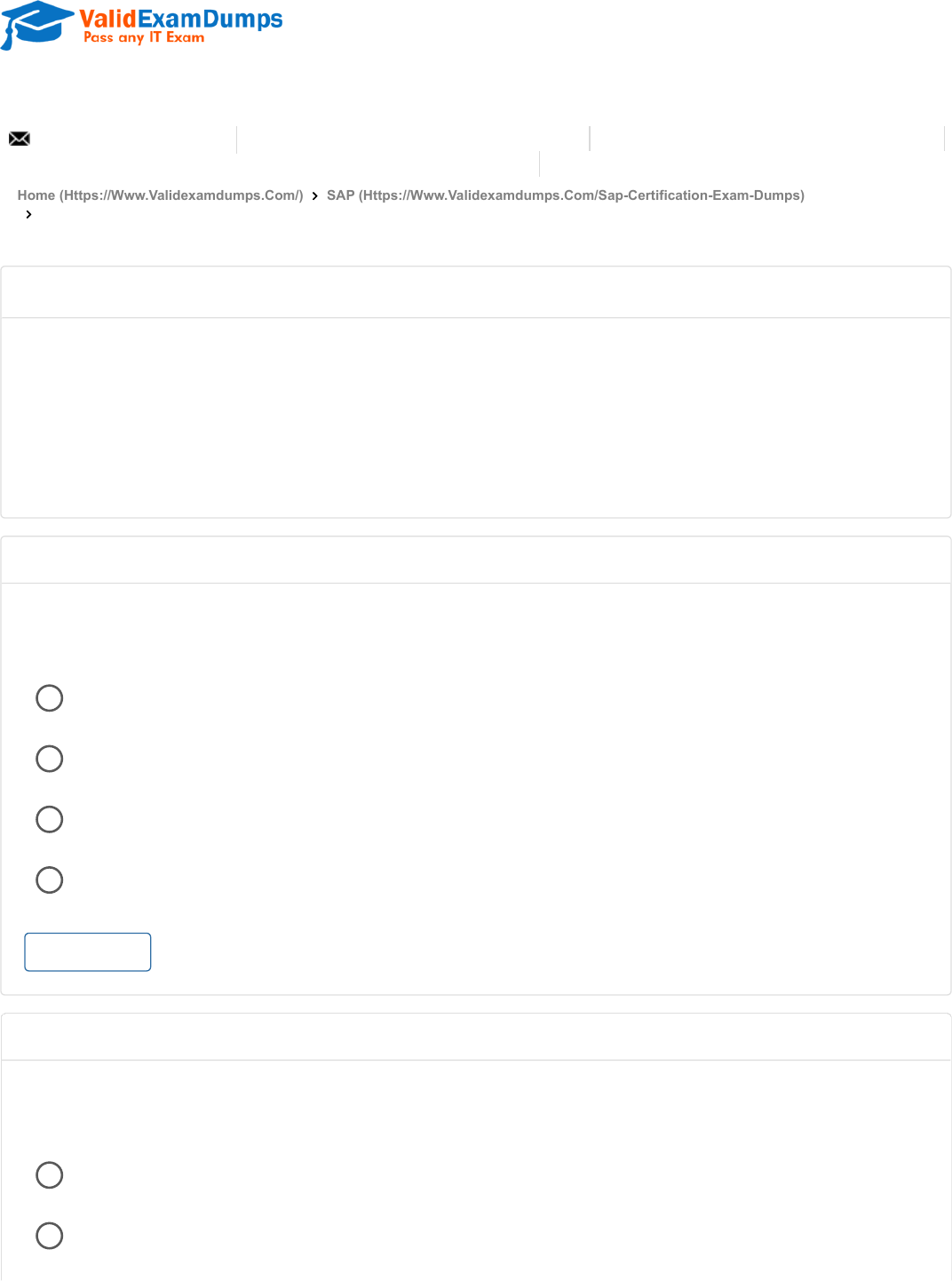 <p>9/26/24, 1:57 PM Free SAP C_S4CPR_2408 Actual Exam Questions</p><p>https://www.validexamdumps.com/sap/c-s4cpr-2408-exam-questions 1/4</p><p></p><p> C_S4CPR_2408 Exam Questions</p><p>(HTTPS://WWW.VALIDEXAMDUMPS.COM/)</p><p>support@validexamdumps.com About Us (https://www.validexamdumps.com/about-us) Contact Us (https://www.validexamdumps.com/contact)</p><p>FAQs (https://www.validexamdumps.com/faqs)</p><p>Home (Https://Www.Validexamdumps.Com/) SAP (Https://Www.Validexamdumps.Com/Sap-Certification-Exam-Dumps)</p><p>Free SAP C_S4CPR_2408 Exam Actual Questions</p><p>The questions for C_S4CPR_2408 were last updated On Sep 22, 2024</p><p>GET ALL 80 QUESTIONS (HTTPS://WWW.VALIDEXAMDUMPS.COM/SAP/C-S4CPR-2408-</p><p>DUMPS)</p><p></p><p>Question No. 1</p><p>You need to create purchasing groups in your SAP S/4HANA Cloud Public Edition system that are relevant to</p><p>your company. Which of the following assignments for purchasing groups is required?</p><p>Show Answer</p><p>Purchasing group is not assigned to any organizational unit in the company structureA</p><p>You must assign the purchasing group to the plantB</p><p>You must assign the purchasing group to the company codeC</p><p>You must assign the purchasing group to the responsible purchasing organizationD</p><p>Question No. 2</p><p>You are recording actions for a custom process step in a test automate. When do you press the "Read" button</p><p>on the recording panel? Note: There are 2 correct answers to this question.</p><p>To capture a static label on the screen that should be checked during test execution.A</p><p>To capture an error message on the screen that can be used later.B</p><p>https://www.validexamdumps.com/</p><p>https://www.validexamdumps.com/about-us</p><p>https://www.validexamdumps.com/contact</p><p>https://www.validexamdumps.com/faqs</p><p>https://www.validexamdumps.com/</p><p>https://www.validexamdumps.com/sap-certification-exam-dumps</p><p>https://www.validexamdumps.com/sap/c-s4cpr-2408-dumps</p><p>javascript:void();</p><p>9/26/24, 1:57 PM Free SAP C_S4CPR_2408 Actual Exam Questions</p><p>https://www.validexamdumps.com/sap/c-s4cpr-2408-exam-questions 2/4</p><p>Show Answer</p><p>To capture text in a message screen that can be used for data binding later.C</p><p>To capture a value in a text field that should be stored as a variable.D</p><p>Question No. 3</p><p>What provides a foundation for the SAP Cloud ERP where integrations and extensions live?</p><p>Show Answer</p><p>SAP Discovery CenterA</p><p>SAP Business Accelerator HubB</p><p>SAP ABAP EnvironmentC</p><p>SAP Business Technology PlatformD</p><p>Question No. 4</p><p>Which of the following analyses can you create from the Manage KPIs and Reports app? Note: There are 3</p><p>correct answers to this question.</p><p>Show Answer</p><p>Review BookletsA</p><p>Lumira DashboardsB</p><p>Multidimensional ReportsC</p><p>SAC StoriesD</p><p>Object ViewsE</p><p>Question No. 5</p><p>javascript:void();</p><p>javascript:void();</p><p>javascript:void();</p><p>9/26/24, 1:57 PM Free SAP C_S4CPR_2408 Actual Exam Questions</p><p>https://www.validexamdumps.com/sap/c-s4cpr-2408-exam-questions 3/4</p><p>If you cannot find a prepackaged solution process that addresses integration requirements in SAP Signavio</p><p>Process Navigator, where do you look next?</p><p>Show Answer</p><p>SAP Cloud ALMA</p><p>SAP Business Accelerator HubB</p><p>SAP Discovery CenterC</p><p>SAP Business Technology PlatformD</p><p>GET ALL 80 QUESTIONS (HTTPS://WWW.VALIDEXAMDUMPS.COM/SAP/C-S4CPR-2408-</p><p>DUMPS)</p><p>Explore Other SAP Exams (https://www.validexamdumps.com/sap-certification-exam-dumps)</p><p></p><p>HOT VENDORS</p><p>Microsoft (https://www.validexamdumps.com/microsoft-certification-</p><p>exam-dumps)</p><p>Oracle (https://www.validexamdumps.com/oracle-certification-exam-</p><p>dumps)</p><p>Cisco (https://www.validexamdumps.com/cisco-certification-exam-</p><p>dumps)</p><p>HP (https://www.validexamdumps.com/hp-certification-exam-dumps)</p><p>IBM (https://www.validexamdumps.com/ibm-certification-exam-dumps)</p><p>CUSTOMER SERVICES</p><p>Home (https://www.validexamdumps.com/)</p><p>FAQ (https://www.validexamdumps.com/faqs)</p><p>Contact Us (https://www.validexamdumps.com/contact)</p><p>ABOUT STORE</p><p>About Us (https://www.validexamdumps.com/about-us)</p><p>Disclaimer (https://www.validexamdumps.com/disclaimer)</p><p>SECURITY & PRIVACY</p><p>Privacy Policy (https://www.validexamdumps.com/privacy-policy)</p><p>Terms & Conditions (https://www.validexamdumps.com/terms-and-</p><p>conditions)</p><p>javascript:void();</p><p>https://www.validexamdumps.com/sap/c-s4cpr-2408-dumps</p><p>https://www.validexamdumps.com/sap-certification-exam-dumps</p><p>https://www.validexamdumps.com/microsoft-certification-exam-dumps</p><p>https://www.validexamdumps.com/oracle-certification-exam-dumps</p><p>https://www.validexamdumps.com/cisco-certification-exam-dumps</p><p>https://www.validexamdumps.com/hp-certification-exam-dumps</p><p>https://www.validexamdumps.com/ibm-certification-exam-dumps</p><p>https://www.validexamdumps.com/</p><p>https://www.validexamdumps.com/faqs</p><p>https://www.validexamdumps.com/contact</p><p>https://www.validexamdumps.com/about-us</p><p>https://www.validexamdumps.com/disclaimer</p><p>https://www.validexamdumps.com/privacy-policy</p><p>https://www.validexamdumps.com/terms-and-conditions</p><p>9/26/24, 1:57 PM Free SAP C_S4CPR_2408 Actual Exam Questions</p><p>https://www.validexamdumps.com/sap/c-s4cpr-2408-exam-questions 4/4</p><p>TESTED 26th Sep</p><p>SEARCH</p><p>Exams code , certifications, vendor or keywords</p><p>PAYMENT METHOD</p><p>search... SEARCH</p>
