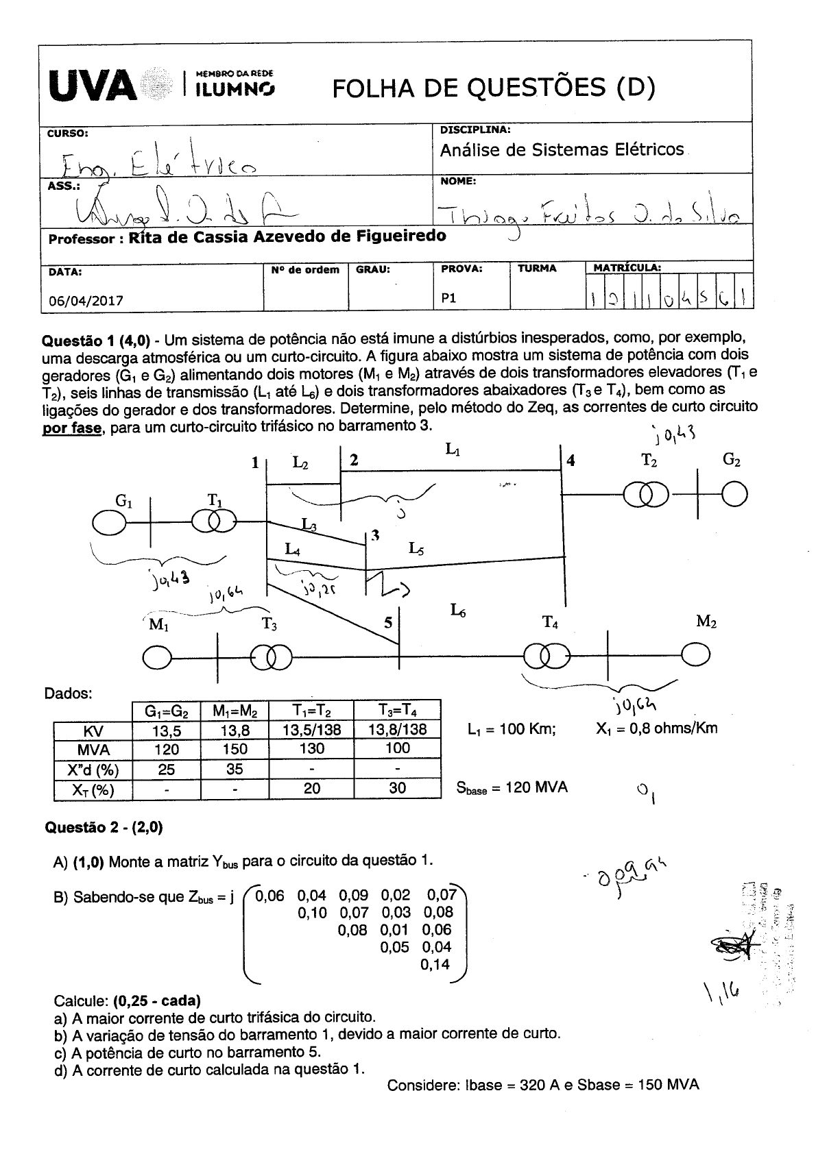 <p>UVA MEMBRO DA REDE ILUMNO FOLHA DE QUESTÕES (D) CURSO: DISCIPLINA: Análise de Sistemas Elétricos ASS.: NOME: Fruitos Professor : Rita de Cassia Azevedo de Figueiredo DATA: de ordem GRAU: PROVA: TURMA 06/04/2017 P1 I S Questão 1 (4,0) Um sistema de potência não está imune a distúrbios inesperados, como, por exemplo, uma descarga atmosférica ou um curto-circuito. A figura abaixo mostra um sistema de potência com dois geradores e G2) alimentando dois motores (M1 e M2) através de dois transformadores elevadores (T1 e T2), seis linhas de transmissão (L1 até e dois transformadores abaixadores T4), bem como as ligações do gerador e dos Determine, pelo método do Zeq, as correntes de curto circuito por fase, para um curto-circuito trifásico no barramento 3. 1 L2 2 4 T2 G2 G1 T1 3 L4 L5 L6 M1 T3 5 T4 M2 Dados: G1=G2 T1=T2 T3=T4 KV 13,5 13,8 13,5/138 13,8/138 L1 = 100 Km; X1 = 0,8 ohms/Km MVA 120 150 130 100 X"d (%) 25 35 - - X- (%) - - 20 30 = 120 MVA Questão 2 - (2,0) A) (1,0) Monte a matriz Ybus para o circuito da questão 1. B) Sabendo-se que Zbus 0,06 0,04 0,09 0,02 0,07 0,10 0,07 0,03 0,08 0,08 0,01 0,06 0,05 0,04 0,14 Calcule: (0,25 cada) 1,16 a) A maior corrente de curto trifásica do circuito. b) A variação de tensão do barramento 1, devido a maior corrente de curto. c) A potência de curto no barramento 5. d) A corrente de curto calculada na questão 1. Considere: Ibase = 320 A e Sbase = 150 MVA</p><p>Questão 3 (2,0) - Monte o diagrama de impedâncias do circuito abaixo, determinando a impedância equivalente no barramento 3. T1 1 3 T3 G1 L1 L5 4 L2 X4 2 T2 L3 5 T4 M2 L4 X3 a Questão 4 (2,0) - Dois geradores trifásicos, ligados a um mesmo barramento, estão conectados ao lado de baixa tensão de um trafo trifásico como mostrado na figura abaixo. gerador 1 apresenta tensão nominal de 13,8 kV e potência nominal de 50MVA. o gerador 2 apresenta tensão nominal de 13,8 kV e potência nominal de 25MVA. Cada gerador tem reatância sub-transitória de 25%, considerando seus respectivos valores nominais. trafo tem potência nominal de 75MVA e tensões nominais de 13,8/69 kV com reatância de 10%. 13,8 F G1 Y G2 Antes de ocorrer a falta trifásica (ponto F), a tensão de operação no lado de alta tensão do transformador é 66 kV, e a corrente de carga é desprezada (trafo em vazio). Assim. considerando como base, no circuito de alta tensão, 69 kV e 75MVA, calcule a corrente no local do curto trifásico; (A) ~1500,44 A. (B) ~1304,34 A. (C) ~1588,51 A. A (E) ~1454,18 A Boa Sorte!!!</p><p>UVA MEMBRO DA REDE ILUMNO Folha de Prova Curso: Disciplina: Ass.: Nome: Things Freitos Data: N° de Ordem: Graun Conceite: Prova Turma: Matrícula: 06/04/17 121104561 SL= 120 MVA = = = 150 fo 120x156 130 = ZLT fv 100 A B 4 10,43 40 3 41 10125 - 3 = 11,25 -0,28 = j0,16 11,H 10,25 jim - 2,981-90 1501-90 KA KA</p><p>2 1 2 4 A 3 -j2 = 5 -j2 t +(-j2) (-j2) Y332 ysu = (-j2) + - = - (-j2) y43 10,32 4 0 -2 4 2 6,32 5,12</p><p>B Pv = A b) Vth 0,4 pu = 187,2 0,25 IL 320 i - is = 1072,5 MVA all = 502A 3 = ZL3 = X4 1 3 X4 20 / D 3 X6 X4 4 =</p><p>4 - Vo = V6 SL = jops jo, 37 ICC = 0,95 So 10,35 = = 75x106 = = ICC Letra D</p>