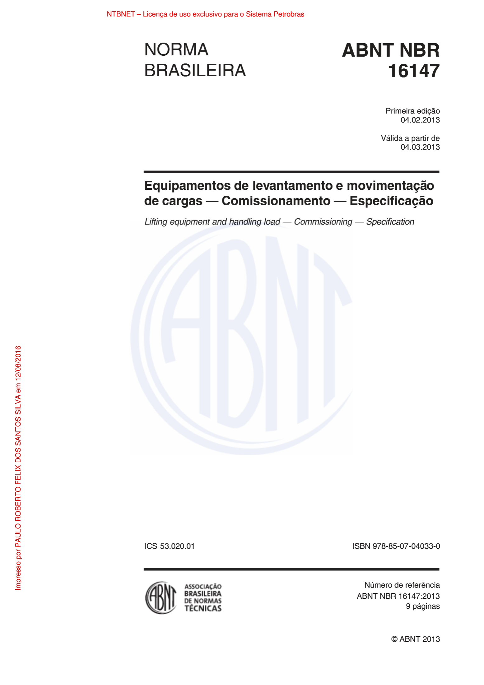 <p>NTBNET - Licença de uso exclusivo para o Sistema Petrobras NORMA ABNT NBR BRASILEIRA 16147 Primeira edição 04.02.2013 Válida a partir de 04.03.2013 Equipamentos de levantamento e movimentação de cargas - Comissionamento - Especificação Lifting equipment and handling load - Commissioning - Specification ICS 53.020,01 ISBN 978-85-07-04033-0 por ASSOCIAÇÃO Número de referência BRASILEIRA ABNT NBR 16147:2013 DE NORMAS TÉCNICAS 9 páginas ABNT 2013</p><p>ABNT NBR 16147:2013 ABNT 2013 Todos os direitos reservados. A menos que especificado de outro modo, nenhuma parte desta publicação pode ser reproduzida ou utilizada por qualquer meio, eletrônico ou mecânico, incluindo fotocópia e microfilme, sem permissão por escrito da ABNT. ABNT Av. Treze de Maio, 13 - andar 20031-901 - Rio de Janeiro - RJ Tel.: + 55 21 3974-2300 por Fax: + 55 21 3974-2346 abnt@abnt.org.br www.abnt.org.br ABNT 2013 - Todos os direitos reservados ii</p><p>NTBNET - Licença de uso exclusivo para o Sistema Petrobras ABNT NBR 16147:2013 Sumário Página Prefácio iv 1 Escopo 1 2 Referência normativa 1 3 Termos e definições 1 4 Requisitos gerais 2 5 Verificações e equipamento parado 3 5.1 Parte elétrica 3 5.1.1 Verificações com o equipamento desenergizado 3 5.1.2 Verificações com o equipamento energizado 3 5.2 Parte mecânica 3 6 Verificações em funcionamento sem carga 4 6.1 Movimentos verticais 4 6.1.1 Parte elétrica 4 6.1.2 Parte mecânica 4 6.2 Movimentos horizontais 5 6.2.1 Parte elétrica 5 6.2.2 Parte mecânica 5 7 Verificações com da carga útil 5 7.1 Movimentos verticais 5 7.1.1 Parte elétrica 5 7.1.2 Parte mecânica 6 7.2 Movimentos horizontais 6 7.2.1 Parte elétrica 6 7.2.2 Parte mecânica 6 8 Verificações em 100 % da carga útil 6 8.1 Movimentos verticais 6 8.1.1 Parte elétrica 6 8.1.2 Parte mecânica 7 8.2 Movimentos horizontais 7 8.2.1 Parte elétrica 7 8.2.2 Parte mecânica 7 9 Verificações com sobrecargas 8 9.1 Ensaios dinâmicos com sobrecarga 8 9.2 Ensaio estático com sobrecarga 8 10 Término do comissionamento 9 por ABNT 2013 - Todos os direitos reservados iii</p><p>NTBNET - Licença de uso exclusivo para o Sistema Petrobras ABNT NBR 16147:2013 Prefácio A Associação Brasileira de Normas Técnicas (ABNT) é o Foro Nacional de Normalização. As Normas Brasileiras, cujo conteúdo é de responsabilidade dos Comitês Brasileiros (ABNT/CB), dos Organismos de Normalização Setorial (ABNT/ONS) e das Comissões de Estudo Especiais (ABNT/CEE), são elaboradas por Comissões de Estudo (CE), formadas por representantes dos setores envolvidos, delas fazendo parte: produtores, consumidores e neutros (universidades, laboratórios e outros). Os Documentos Técnicos ABNT são elaborados conforme as regras da Diretiva ABNT, Parte 2. A Associação Brasileira de Normas Técnicas (ABNT) chama atenção para a possibilidade de que alguns dos elementos deste documento podem ser objeto de direito de patente. A ABNT não deve ser considerada responsável pela identificação de quaisquer direitos de patentes. A ABNT NBR 16147 foi elaborada no Comitê Brasileiro de Máquinas e Equipamentos Mecânicos (ABNT/CB-04), pela Comissão de Estudo de Equipamentos de Elevação de Carga (CE-04:010.01). O Projeto circulou em Consulta Nacional conforme Edital n° 07, de 05.07.2012 a 03.09.2012, com o número de Projeto 04:010.01-003 O Escopo desta Norma Brasileira em inglês é o seguinte: Scope This Standard defines the set of tests and checks that must be submitted in lifting equipment and handling load, new, modernized, renovated and refurbished after its installation to verify compliance with the technical specifications and other relevant contractual documents. This Standard does not apply for portainer cranes, erection services cranes, harbour cranes, crawlers and rubber- tyred crane. Hoist in general and standardized, serial production, previously ensaiod by this rule are exempt from the repetition of the following tests since their test reports are an integral part of the commissioning report. por iv ABNT 2013 Todos os direitos reservados</p><p>NTBNET Licença de uso exclusivo para o Sistema Petrobras NORMA BRASILEIRA ABNT NBR 16147:2013 Equipamentos e levantamento e movimentação de cargas Comissionamento Especificação 1 Escopo 1.1 Esta Norma determina o conjunto de ensaios e verificações a que devem ser submetidos os equipamentos de levantamento e movimentação de cargas novos, modernizados, reformados e repotencializados após sua instalação, para verificar sua conformidade com as respectivas especifi- cações técnicas e demais documentos contratuais pertinentes. 1.2 Esta Norma não se aplica aos pórticos para transporte de contêineres, guindastes para serviço de montagem, guindastes portuários, guindastes montados sobre pneus ou lagartas. 1.3 Talhas em geral e carros padronizados, de produção seriada, previamente ensajados conforme esta Norma, estão dispensados da repetição dos mesmos em campo, desde que os respectivos rela- tórios de ensaios façam parte integrante do relatório de comissionamento. 2 Referência normativa documento relacionado a seguir é indispensável à aplicação deste documento. Para referências datadas, aplicam-se somente as edições citadas. Para referências não datadas, aplicam-se as edições mais recentes do referido documento (incluindo emendas). ABNT NBR 8400, Cálculo de equipamento para levantamento e movimentação de cargas Procedimento 3 Termos e definições Para os efeitos deste documento, aplicam-se os termos e definições da ABNT NBR 8400 e os seguintes: 3.1 carga de ensaio carga correspondente a porcentagem da carga nominal do equipamento. NOTA Na determinação do valor da carga de ensaio precisam estar incluídos todos os dispositivos necessários ao seu (lingas, olhais, plataformas etc.) 3.2 fornecedor empresa, ou consórcio de empresas, fabricante do equipamento por 3.3 cliente pessoa física e/ou empresa que adquire 