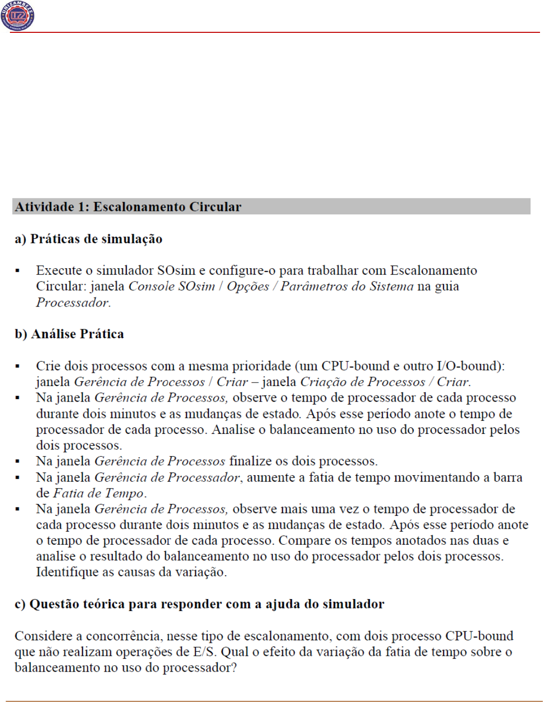<p>UniZambeze – U n i v e r s i d a d e Z a m b e z e Sistemas operativos e Redes de computadores</p><p>FCT - FCT – Faculdade de Ciências e Tecnologia Trabalho Laboratorial no 2: GESTAO DO PROCESSADOR</p><p>``</p><p>10 de setembro de 2024 - Curso e ano: Engenharia Mecatrónica 2º ano 4º semestre Docente: Eng. Essitone Lote Gimo pag. 1 de 3</p><p>Trabalho Laboratorial no 2: Gestão do Processador</p><p>OBJETIVOS</p><p>Esta atividade de laboratório tem por objectivo simular a gestão de processos com ajuda do Simulador SOsim.</p><p>Em síntese, objectiva-se:</p><p>1. Escalonamento Circular;</p><p>2. Escalonamento Circular com Prioridades Estáticas I;</p><p>3. Escalonamento Circular com Prioridades Estática II;</p><p>4. Escalonamento Circular com Prioridades Dinâmica;</p><p>UniZambeze – U n i v e r s i d a d e Z a m b e z e Sistemas operativos e Redes de computadores</p><p>FCT - FCT – Faculdade de Ciências e Tecnologia Trabalho Laboratorial no 2: GESTAO DO PROCESSADOR</p><p>``</p><p>10 de setembro de 2024 - Curso e ano: Engenharia Mecatrónica 2º ano 4º semestre Docente: Eng. Essitone Lote Gimo pag. 2 de 3</p><p>UniZambeze – U n i v e r s i d a d e Z a m b e z e Sistemas operativos e Redes de computadores</p><p>FCT - FCT – Faculdade de Ciências e Tecnologia Trabalho Laboratorial no 2: GESTAO DO PROCESSADOR</p><p>``</p><p>10 de setembro de 2024 - Curso e ano: Engenharia Mecatrónica 2º ano 4º semestre Docente: Eng. Essitone Lote Gimo pag. 3 de 3</p>