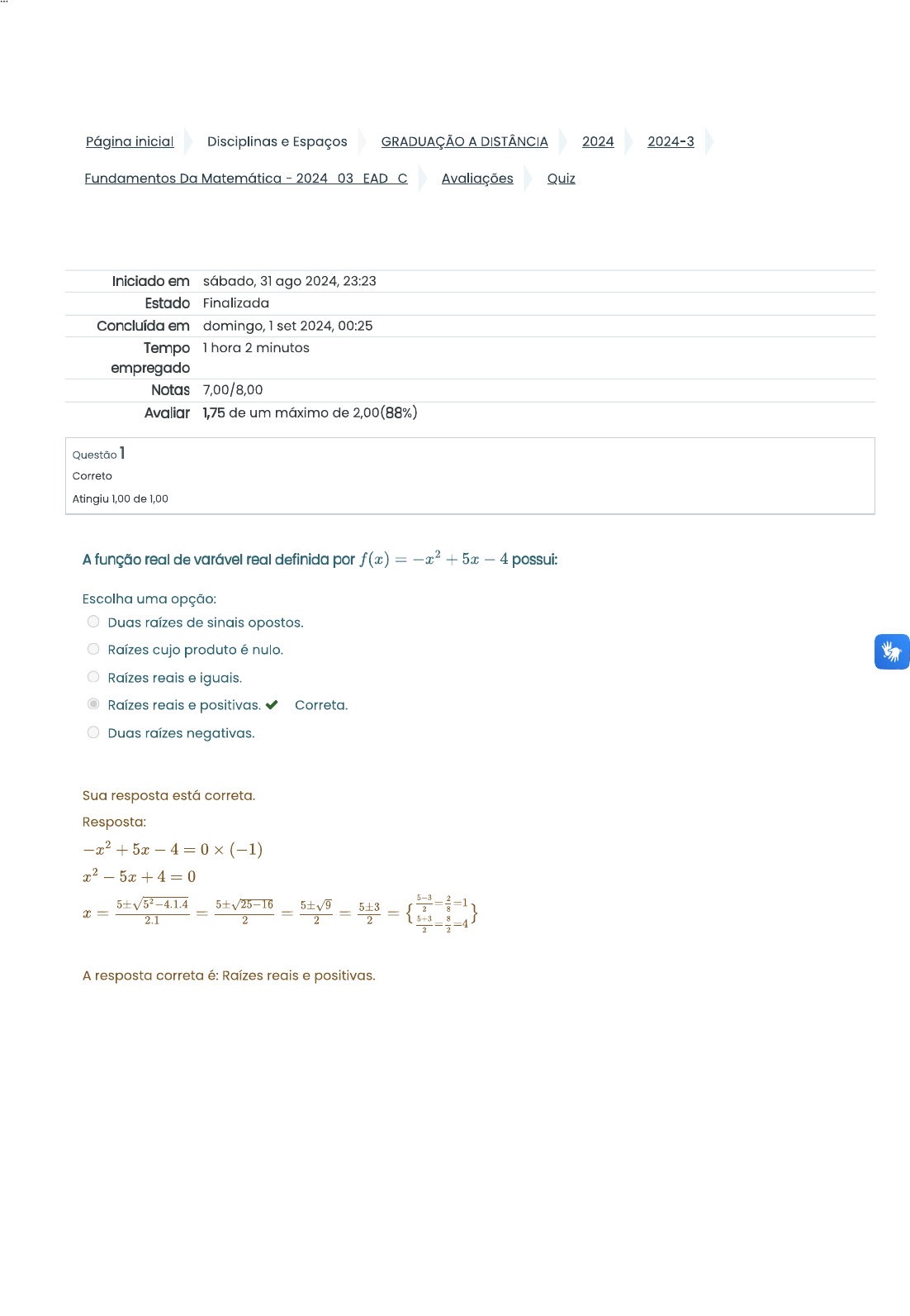 <p>Página inicial Disciplinas e Espaços GRADUAÇÃO A DISTÂNCIA 2024 2024-3 Fundamentos Da Matemática - 2024 03 EAD C Avaliações Quiz Iniciado em sábado, 31 ago 2024, 23:23 Estado Concluída em domingo, 1 set 2024, 00:25 Tempo 1 hora 2 minutos empregado Notas 7,00/8,00 1,75 de um máximo de 2,00(88%) Questão 1 Correto Atingiu 1,00 de 1,00 A função real de varável real definida por - 4 possui: Escolha uma opção: Duas raízes de sinais opostos. Raízes cujo produto é nulo. Raízes reais e iguais. Raízes reais e positivas. Correta. Duas raízes negativas. Sua resposta está correta. Resposta: -x2 x2 - 0 5-3 2 5+3 = =1 = = = { 2 8 = 2.1 2 2 2 5+3 8 = =4 2 2 A resposta correta é: Raízes reais e positivas.</p><p>Questão 2 Correto Atingiu 1,00 de 1,00 10 Simplificando a fração Escolha uma opção: 3 5. Correta. Sua resposta está correta. 3-1 A resposta correta é: Questão 3 Correto Atingiu 1,00 de 1,00 y solo x A figura representa o esboço da imagem capturada do lançamento, a partir do ponto O, de um objeto P antes que ele toque o solo. Supondo que a equação desse movimento seja + 30x, onde X (em metros) é a distância percorrida na horizontal e y (em metros) é a altura atingida pelo objeto, podemos afirmar que: Escolha uma opção: objeto atinge a altura máxima quando objeto toca solo novamente a uma distância de 30 m. Correta. objeto atinge o solo quando x>50 m. objeto começa a cair em direção ao solo quando 10 m. objeto P atinge altura máxima igual a 15 m. Sua resposta está correta. Resposta: objeto atinge solo onde y=0. Assim, x2 - 30x=0 - Logo objeto toca o solo novamente, após o lançamento a uma distância de 30 m do ponto O. A resposta correta é: objeto toca solo novamente a uma distância de 30 m.</p><p>Questão 4 Correto Atingiu 1,00 de 1,00 Para calcular a área total S de um paralelepípedo retângulo de arestas X, yez, emprega-se a fórmula s=2(xy+xz+yz). A área total de um paralelepípedo retângulo tal que x=5 cm,10 cm e 15 cm é igual a: Escolha uma opção: 550cm2 Correta. Sua resposta está correta. Resposta: A questão é uma aplicação de cálculo de valor numérico. Basta substituir os valores de x=5,10 e 15 na fórmula da área total do paralelepípedo. Assim, S=5x10+5x15+10x15=50+75+150=275 A resposta correta é: Questão 5 Correto Atingiu 1,00 de 1,00 A IR/f(x) 2x - tal que Escolha uma opção: 8 Correta. Sua resposta está correta. Resposta: 16 2 x 16 1 A resposta correta é:</p><p>Questão 6 Correto Atingiu 1,00 de 1,00 gráfico abaixo é de uma função do y o " r É correto afirmar que: Escolha uma opção: a.b<0 Correta. b<0 a>0 a.b=0 a+b=0 Sua resposto está correta. Resposta: A opção b<0 é falsa porque a reta corta eixo y acima da origem, daí seu coeficiente linear b>0. A opção a>0 é falsa porque que a reta r faz com sentido positivo do eixo X é obtuso, logo a<0. Como demonstrado nos dois parágrafos anteriores, a<0 e b>0, logo a opção correta está no item item é falso porque a #0 "e A opção a+b=0 é falsa porque não há garantia sobre os valores absolutos das parcelas a e b e, portanto, não se pode afirmar que sejam opostas. A resposta correta é: a.b<0</p><p>Questão 7 Incorreto Atingiu 0,00 de 1,00 simplificando a expressão obtém-se: a-b Escolha uma opção: 16. 17. x Incorreta. Sua resposta está incorreta. a-b a-b A resposta correta é: Questão 8 Correto Atingiu 1,00 de 1,00 Considere as sentenças abaixo: : É correto afirmar que: Escolha uma opção: O item III não está correto. Apenas item está certo. Há pelo menos dois itens errados. Os itens II, III e IV estão corretos. Correta. Os itens I, e IV estão errados. Sua resposta está correta. Resposta: Os itens corretos são: II, III e IV. O item errado é I: o item está errado, pois clássico de diferença de dois cubos. A resposta correta é: Os itens II, III e IV estão corretos.</p>