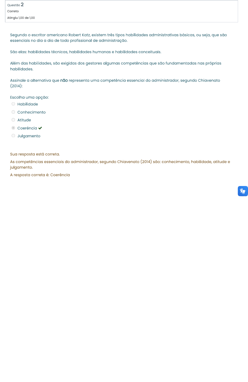 <p>Questão 2 Correto Atingiu 1,00 de 1,00 Segundo o escritor americano Robert Katz, existem três tipos habilidades administrativas ou seja, que são essenciais no dia a dia de todo profissional de administração. São elas: habilidades técnicas, habilidades humanas e habilidades conceituais. Além das habilidades, são exigidas dos gestores algumas competências que são fundamentadas nas próprias habilidades. Assinale a alternativa que não representa uma competência essencial do administrador, segundo Chiavenato (2014): Escolha uma opção: Habilidade Conhecimento Atitude Coerência Julgamento Sua resposta está correta. As competências essenciais do administrador, segundo Chiavenato (2014) são: conhecimento, habilidade, atitude e julgamento. A resposta correta é: Coerência</p><p>Questão 3 Incorreto Atingiu 0,00 de 1,00 A atividade empresarial é traduzida em atividades que são coordenadas entre si, com uma em comum. tipo de atividade prestada é que vai definir se a atividade é empresária ou não empresária. a alternativa do profissional que pode exercer atividade empresarial, pois não está impedido pela legislação: Escolha uma opção: Maior de 18 anos, brasileiro(a) ou estrangeiro(a), que se achar na livre administração de sua pessoa e bens Membros do Ministério Público Militares na ativa Leiloeiros x Estrangeiros não residentes no país Sua resposta está incorreta. Algumas pessoas, embora tenham plena capacidade civil, não podem atuar como empresários ou administradores de sociedades empresárias. Estão legalmente proibidos de empreender, independente da área de atuação pretendida. Estão proibidos de atuar como empresários ou administradores de sociedades empresárias: a) militares da ativa das três Forças Armadas e das Polícias Militares; b) servidores públicos civis (União, Estados, Territórios e Municípios); c) magistrados e os membros do Ministério Público; d) médicos, para o exercício simultâneo da medicina e farmácia, drogaria ou laboratório; e) estrangeiros não residentes no país; f) cônsules, salvo os nãos remunerados; g) corretores e leiloeiros; h) a pessoa física com débitos no INSS. A resposta correta é: Maior de 18 anos, brasileiro(a) ou estrangeiro(a), que se achar na livre administração de sua pessoa e bens</p>