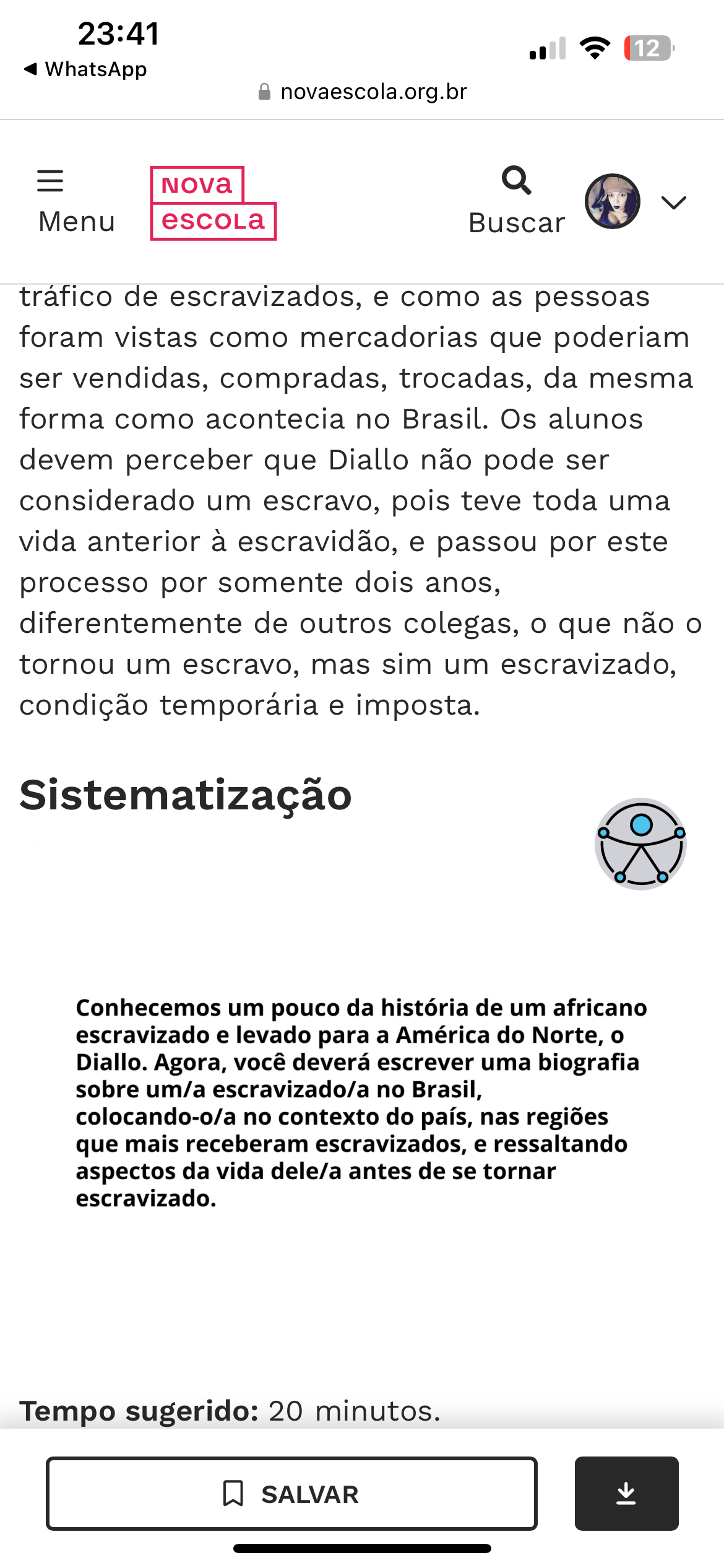 <p>23:41 12 WhatsApp novaescola. org. Q Menu escola Buscar tráfico de escravizados, e como as pessoas foram vistas como mercadorias que poderiam ser vendidas, compradas, trocadas, da mesma forma como acontecia no Brasil. Os alunos devem perceber que Diallo não pode ser considerado um escravo, pois teve toda uma vida anterior à escravidão, e passou por este processo por somente dois anos, diferentemente de outros colegas, que não o tornou um escravo, mas sim um escravizado, condição temporária e imposta. Sistematização Conhecemos um pouco da história de um africano escravizado e levado para a América do Norte, o Diallo. Agora, você deverá escrever uma biografia sobre um/a escravizado/a no Brasil, colocando-o/a no contexto do país, nas regiões que mais receberam escravizados, e ressaltando aspectos da vida dele/a antes de se tornar escravizado. Tempo sugerido: 20 minutos. SALVAR</p>