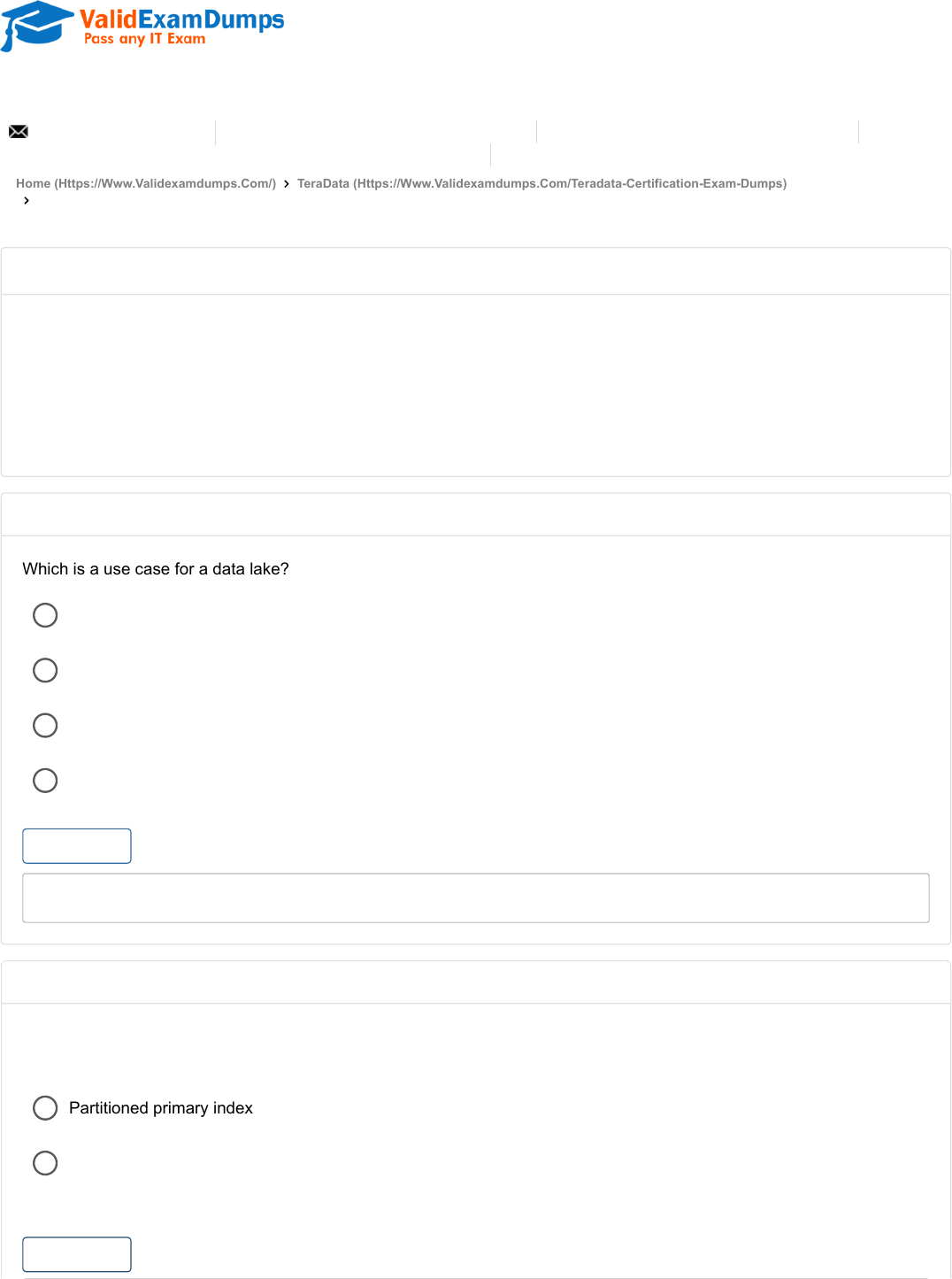 <p>9/30/24, 3:39 PM Free TeraData TDVCL2 Actual Exam Questions</p><p>https://www.validexamdumps.com/teradata/tdvcl2-exam-questions 1/3</p><p></p><p> TDVCL2 Exam Questions</p><p>(HTTPS://WWW.VALIDEXAMDUMPS.COM/)</p><p>support@validexamdumps.com About Us (https://www.validexamdumps.com/about-us) Contact Us (https://www.validexamdumps.com/contact)</p><p>FAQs (https://www.validexamdumps.com/faqs)</p><p>Home (Https://Www.Validexamdumps.Com/) TeraData (Https://Www.Validexamdumps.Com/Teradata-Certification-Exam-Dumps)</p><p>Free TeraData TDVCL2 Exam Actual Questions</p><p>The questions for TDVCL2 were last updated On Sep 27, 2024</p><p>GET ALL 51 QUESTIONS (HTTPS://WWW.VALIDEXAMDUMPS.COM/TERADATA/TDVCL2-</p><p>DUMPS)</p><p></p><p>Question No. 1</p><p>Which is a use case for a data lake?</p><p>Hide Answer</p><p>Correct Answer: B</p><p>Fixed-capacity pricingA</p><p>Self-service data explorationB</p><p>High-volume tactical workloadsC</p><p>Benefit from automatically modeled dataD</p><p>Question No. 2</p><p>Which index type is most efficient for range-based queries?</p><p>A Unique primary index</p><p>Hide Answer</p><p>Partitioned primary indexB</p><p>Non-unique primary index</p><p>D Unique secondary index</p><p>C</p><p></p><p>https://www.validexamdumps.com/</p><p>https://www.validexamdumps.com/about-us</p><p>https://www.validexamdumps.com/contact</p><p>https://www.validexamdumps.com/faqs</p><p>https://www.validexamdumps.com/</p><p>https://www.validexamdumps.com/teradata-certification-exam-dumps</p><p>https://www.validexamdumps.com/teradata/tdvcl2-dumps</p><p>javascript:void();</p><p>javascript:void();</p><p>9/30/24, 3:39 PM Free TeraData TDVCL2 Actual Exam Questions</p><p>https://www.validexamdumps.com/teradata/tdvcl2-exam-questions 2/3</p><p>Correct Answer: B</p><p>Question No. 3</p><p>Which Analytics Database component performs the work associated with generating an answer set?</p><p>Show Answer</p><p>ARCA</p><p>AMPB</p><p>DSAC</p><p>PDED</p><p>Question No. 4</p><p>Which statement is true about Native Object Store (NOS)?</p><p>Show Answer</p><p>Vantage can both read and write NOS.A</p><p>Vantage can neither read nor write NOS.B</p><p>Vantage can write, but not read NOS.C</p><p>Vantage can read, but not write NOS.D</p><p>Question No. 5</p><p>What is a reason for deploying a data lake architecture?</p><p>Show Answer</p><p>Secure the environment by restricting the analytic programming languages to R and Python.A</p><p>Ensure modeled and structured data is used to answer all business questions.B</p><p>Capability to access data with the latest open source and commercial analytic technologies.C</p><p>Eliminate data preparation required on alternative architectures for analytic model creation.D </p><p>javascript:void();</p><p>javascript:void();</p><p>javascript:void();</p><p>9/30/24, 3:39 PM Free TeraData TDVCL2 Actual Exam Questions</p><p>https://www.validexamdumps.com/teradata/tdvcl2-exam-questions 3/3</p><p>GET ALL 51 QUESTIONS (HTTPS://WWW.VALIDEXAMDUMPS.COM/TERADATA/TDVCL2-DUMPS)</p><p>Explore Other TeraData Exams (https://www.validexamdumps.com/teradata-certification-exam-dumps)</p><p></p><p>HOT VENDORS</p><p>Microsoft (https://www.validexamdumps.com/microsoft-certification-exam-</p><p>dumps)</p><p>Oracle (https://www.validexamdumps.com/oracle-certification-exam-dumps)</p><p>Cisco (https://www.validexamdumps.com/cisco-certification-exam-dumps)</p><p>HP (https://www.validexamdumps.com/hp-certification-exam-dumps)</p><p>IBM (https://www.validexamdumps.com/ibm-certification-exam-dumps)</p><p>CUSTOMER SERVICES</p><p>Home (https://www.validexamdumps.com/)</p><p>FAQ (https://www.validexamdumps.com/faqs)</p><p>Contact Us (https://www.validexamdumps.com/contact)</p><p>ABOUT STORE</p><p>About Us (https://www.validexamdumps.com/about-us)</p><p>Disclaimer (https://www.validexamdumps.com/disclaimer)</p><p>TESTED 30th Sep</p><p>SECURITY & PRIVACY</p><p>Privacy Policy (https://www.validexamdumps.com/privacy-policy)</p><p>Terms & Conditions (https://www.validexamdumps.com/terms-and-conditions)</p><p>SEARCH</p><p>Exams code , certifications, vendor or keywords</p><p>PAYMENT METHOD</p><p>search... SEARCH</p><p></p><p>https://www.validexamdumps.com/teradata/tdvcl2-dumps</p><p>https://www.validexamdumps.com/teradata-certification-exam-dumps</p><p>https://www.validexamdumps.com/microsoft-certification-exam-dumps</p><p>https://www.validexamdumps.com/oracle-certification-exam-dumps</p><p>https://www.validexamdumps.com/cisco-certification-exam-dumps</p><p>https://www.validexamdumps.com/hp-certification-exam-dumps</p><p>https://www.validexamdumps.com/ibm-certification-exam-dumps</p><p>https://www.validexamdumps.com/</p><p>https://www.validexamdumps.com/faqs</p><p>https://www.validexamdumps.com/contact</p><p>https://www.validexamdumps.com/about-us</p><p>https://www.validexamdumps.com/disclaimer</p><p>https://www.validexamdumps.com/privacy-policy</p><p>https://www.validexamdumps.com/terms-and-conditions</p>