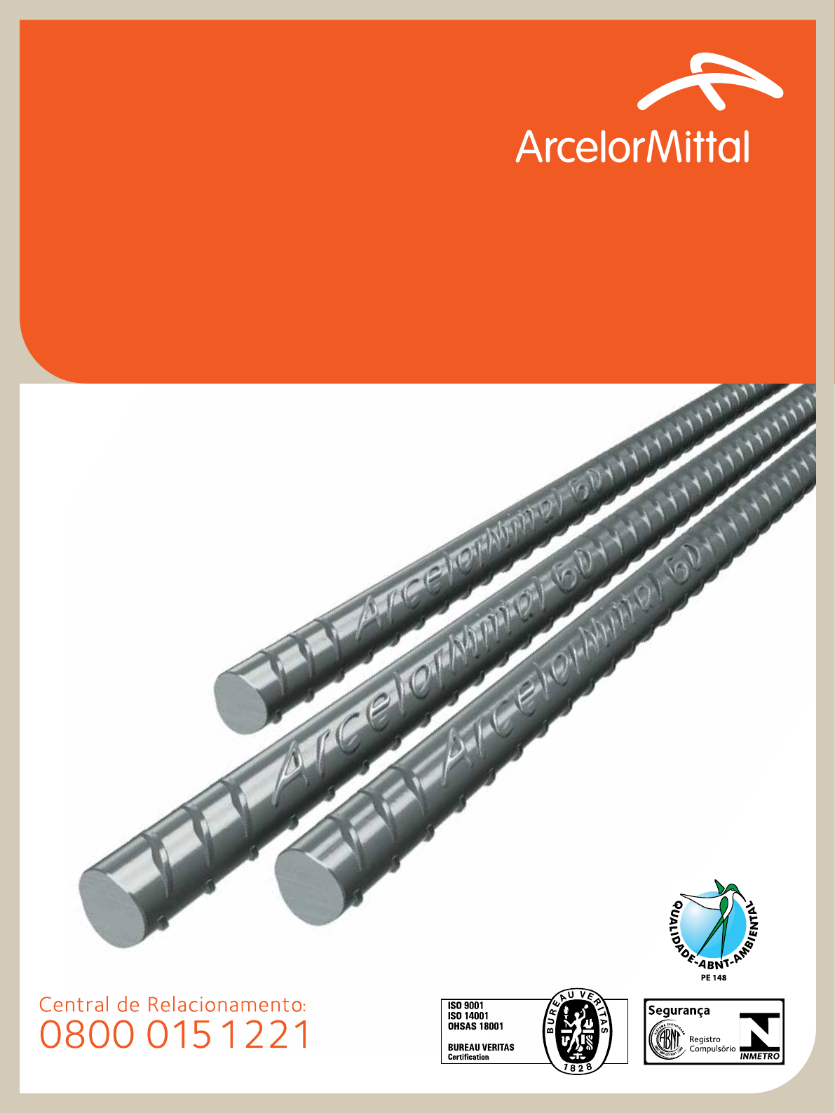 Aços Longos ArcelorMittal 60 Nervurado CA-60 longos.arcelormittal.com O fio de aço CA60 é produzido com aço de baixo teor de carbono, apresentando, portanto, ótima soldabilidade. Produto certificado pela ABNT e registrado no Inmetro. ArcelorMittal 60 Nervurado CA-60 A rc el or M it ta l 6 0 N er vu ra do - C A -6 0 - A go st o 2 0 1 7 4,2 5,0 6,0 7,0 8,0 9,5 Bitola (mm) 0,109 0,154 0,222 0,302 0,395 0,558 Massa nominal (kg/m) 6 6 6 6 6 6 +- +- +- +- +- +- Tolerância (%) Dobramento do aço CA 60 Categoria do aço Diâmetro do pino 5 x ø 6 x ø Uso no laboratório (NBR 7480) Diâmetro do pino Uso na obra (NBR 6118) Obs.: 1) ø = bitola. 2) Para estribos de bitolas ≤ 10 mm, o diâmetro do pino para uso na obra poderá ser de 3 x ø. PINO Pinos suporte DDiâmetro do pino de dobramento Diâmetro da barra bitola 4,2 5,0 54 38 Bitola (mm) No de barras em cada subfeixe Principais vantagens: • Gravação “ArcelorMittal 60” e bitola em relevo, que atestam a qualidade ArcelorMittal. • Maior aderência do aço ao concreto em razão das nervuras. • Melhor ancoragem nas estruturas. • Melhor combate à fissuração do concreto. • Produto de qualidade assegurada para a industrialização de telas, treliças e espaçadores ArcelorMittal. • Certificado com o Rótulo Ambiental ABNT, que atesta o compromisso da ArcelorMittal com a sustentabilidade. O ArcelorMittal 60 Nervurado é fornecido em rolos com pesos de 180 kg, 1.000 kg e 2.000 kg nos formatos estocador e carretel, em feixes de barras retas de 1.000 kg e 2.500 kg. Nas unidades da ArcelorMittal Distribuição, também são fornecidos feixes de barras dobradas. No caso das bitolas mais utilizadas no mercado, os feixes de barras de ArcelorMittal 60 Nervurado são compostos de subfeixes com número exato de barras, conforme tabela abaixo. Outras formas de acondicionamento e comprimentos especiais podem ser fornecidos mediante consulta. O ArcelorMittal 60 Nervurado é produzido conforme a NBR 7480. Produto certificado com o rótulo ABNT, que atesta o compromisso da ArcelorMittal com a sustentabilidade.