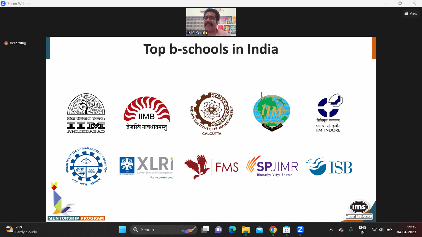 <p>Zoom Webinar X View IMS Kerala Recording Top b-schools in India IIMB OF AHMEDABAD IIM INDORE CALCUTTA OF MANAGEMENT XLRi FMS SPJIMR ISB Xavier School of Management Bharatiya Vidya Bhavan For the greater good IMS MENTORSHIP PROGRAM Trusted for Success 26°C Q Search O : Z ENG 19:35 Partly cloudy IN 04-04-2023 -</p>