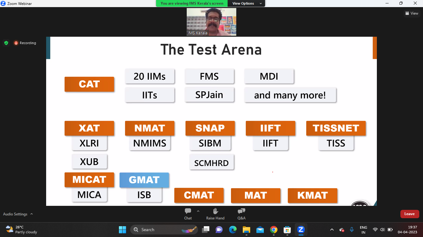 <p>zoom are viewing *** View IMS Kerala Recording The Test Arena 20 IIMs FMS MDI CAT IITs SPJain and many more! XAT NMAT SNAP IIFT TISSNET XLRI NMIMS SIBM IIFT TISS XUB SCMHRD MICAT GMAT MICA ISB CMAT MAT KMAT Audio Settings Leave Chat Raise Hand Q&A 26°C O Z ENG 19:37 Search Partly cloudy IN 04-04-2023 - -</p>