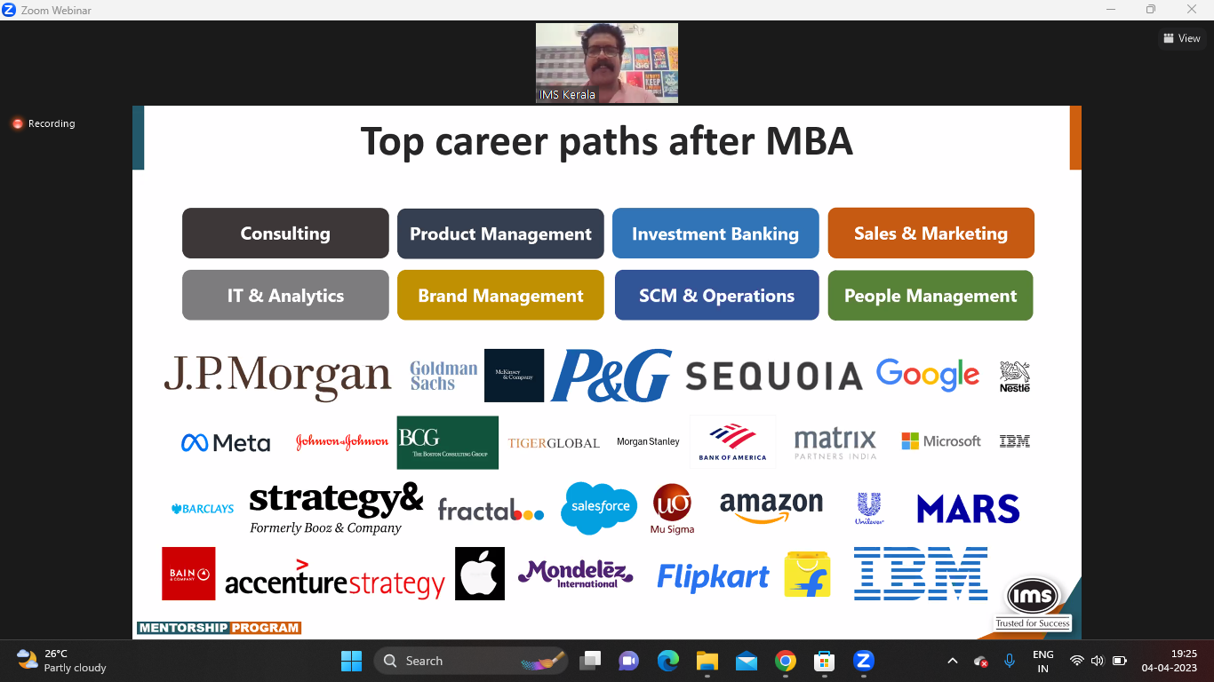 <p>IMS Kerala ding Top career paths after MBA Consulting Product Management Investment Banking Sales & Marketing IT & Analytics Brand Management SCM & Operations People Management J.P.Morgan Goldman Sachs & Company P&G SEQUOIA Google Nestle 8 Meta BCG TIGERGLOBAL Morgan Stanley matrix Microsoft BANK OF AMERICA PARTNERS INDIA BARCLAYS strategy& salesforce amazon MARS Unifever Formerly Booz & Company Mu Sigma BAIN accenturestrategy Mondelez International Flipkart MENTORSHIP PROGRAM Trusted for Success 6°C ENG 19:25 Q Search Z artly cloudy IN 04-04-2023</p>