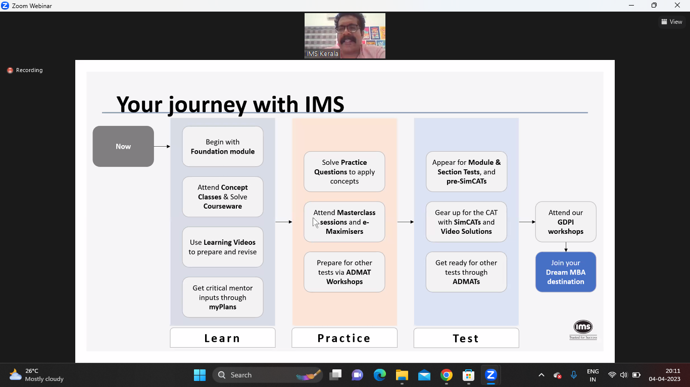 <p>Vi IMS Kerala Your journey with IMS Begin with Now Foundation module Solve Practice Appear for Module & Questions to apply Section Tests, and concepts pre-SimCATs Attend Concept Classes & Solve Courseware Attend Masterclass Gear up for the CAT Attend our sessions and e- with SimCATs and GDPI Maximisers Video Solutions workshops Use Learning Videos to prepare and revise Prepare for other Get ready for other Join your tests via ADMAT tests through Dream MBA Workshops ADMATs destination Get critical mentor inputs through myPlans IMS Learn Practice Test Trusted Success Z ENG 20:11 Search oudy IN 04-04-2023</p>