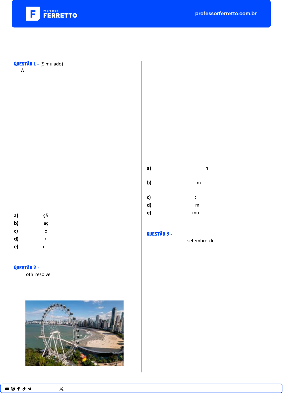 <p>Simuladão</p><p>Questão 1 - (Simulado)</p><p>À primeira vista, não há nada par�cularmente notável</p><p>nestes vermes. A forma em larva da mariposa Galleria</p><p>mellonella, também conhecida como traça do favo de</p><p>mel ou traça da cera, se alimenta da cera que as abelhas</p><p>usam para fazer seu favo de mel. Para os apicultores, são</p><p>pragas das quais tentam se livrar rapidamente, sem</p><p>pensar duas vezes. Mas em 2017, a bióloga molecular</p><p>Federica Bertocchini, que na época estava pesquisando o</p><p>desenvolvimento embrionário de vertebrados no</p><p>Conselho Nacional de Pesquisa Espanhol, se viu diante de</p><p>uma descoberta potencialmente revolucionária</p><p>ambientalmente envolvendo estas criaturas. Apicultora</p><p>amadora, Bertocchini se deparou com estas larvas por</p><p>acaso, quando estava limpando sua colmeia. “Coloquei os</p><p>vermes em um saco plás�co e, em pouco tempo, percebi</p><p>que eles estavam fazendo buracos (no plás�co)”, diz ela</p><p>em entrevista à BBC Earth.</p><p>BBC Future, 4 maio 2024.</p><p>Em relação ao plás�co, a descoberta da bióloga em</p><p>relação aos vermes pode ser ú�l para a:</p><p>a) bioprospecção.</p><p>b) biorremediação.</p><p>c) magnificação trófica.</p><p>d) eutrofização.</p><p>e) preservação ambiental.</p><p>Questão 2 - (Simulado)</p><p>Groth resolve ir a um parque de diversões com seu</p><p>amigo Pedro Rennó. Os dois resolvem dar uma volta na</p><p>roda gigante.</p><p>Considere o momento no qual a roda gigante está</p><p>girando com velocidade angular constante. Podemos</p><p>afirmar que:</p><p>– o módulo da força resultante que age sobre o corpo</p><p>é ____I____ zero;</p><p>– o vetor quan�dade de movimento ____II____ com</p><p>o tempo;</p><p>– o trabalho realizado pela força resultante é</p><p>____III____;</p><p>– a energia ciné�ca é ____IV____.</p><p>A opção que corresponde ao preenchimento correto das</p><p>lacunas (I), (II), (III) e (IV) é:</p><p>a) I – diferente de; II – não muda; III – nulo; IV –</p><p>constante.</p><p>b) I – diferente de; II – muda; III – diferente de zero; IV –</p><p>variável.</p><p>c) I – igual a; II – muda; III – nulo; IV – constante.</p><p>d) I – diferente de; II – muda; III – nulo; IV – constante.</p><p>e) I – igual a; II – não muda; III – constante; IV – variável.</p><p>Questão 3 - (Simulado)</p><p>Goiânia, 13 de setembro de 1987. Dois catadores de</p><p>recicláveis re�raram e desmontaram parte de um</p><p>aparelho de uma clínica abandonada. O objeto foi</p><p>vendido a um ferro-velho, onde mais pessoas terminaram</p><p>de desmontá-lo.</p><p>Dentro do cabeçote de chumbo do aparelho, os</p><p>trabalhadores encontraram uma cápsula com um pó que</p><p>ficava esbranquiçado de dia e brilhante de noite. A</p><p>substância radioa�va, chamada Césio-137, espalhou-se</p><p>pela cidade, ocasionou quatro mortes e deixou mais de</p><p>mil pessoas afetadas pela radiação. Foi o maior acidente</p><p>radiológico da história acontecido fora de uma usina</p><p>nuclear.</p><p>O tempo necessário para que metade da quan�dade</p><p>de césio-137 existente em uma fonte se transforme no</p><p>elemento não radioa�vo bário-137 é trinta anos.</p><p>1@professorferretto @prof_ferretto</p><p>Em relação a 1987, a fração de césio-137, em %, que</p><p>exis�rá na fonte radioa�va 120 anos após o acidente,</p><p>será, aproximadamente,</p><p>a) 3,1.</p><p>b) 6,3.</p><p>c) 12,5.</p><p>d) 25,0.</p><p>e) 50,0.</p><p>Questão 4 - (Simulado)</p><p>Pesquisadores da Universidade da Austrália Ocidental</p><p>e da Universidade Flinder descobriram, na costa da</p><p>Austrália, a maior planta do mundo. A Posidonia</p><p>australis foi localizada em Shark Bay, cerca de 800 km ao</p><p>norte da cidade Perth, e se estende por 180 km. A equipe</p><p>de cien�stas es�ma que a erva marinha tenha pelo</p><p>menos 4.500 anos.</p><p>h�ps://g1.globo.com/meio-</p><p>ambiente/no�cia/2022/06/01/maior-planta-do-mundo-</p><p>e-descoberta-na-australia.ghtml</p><p>Uma vez que se trata de uma planta marinha, espera-se</p><p>que Posidonia australis apresente</p><p>a) vasos condutores de seiva muito desenvolvidos.</p><p>b) tecidos de sustentação atrofiados.</p><p>c) epiderme impermeabilizante.</p><p>d) ausência de tecidos.</p><p>e) impossibilidade de produzir pólen.</p><p>Questão 5 - (Simulado)</p><p>O estetoscópio é usado por profissionais da área</p><p>médica para realizar o procedimento da ausculta. A</p><p>ausculta é um termo médico que significa “escutar”, ou</p><p>seja, é possível dizer que o estetoscópio possibilita</p><p>detectar qualquer �po de ruído vascular, respiratório ou</p><p>de outra origem em qualquer parte do organismo.</p><p>Esse instrumento consiste em uma peça auscultadora,</p><p>tubos condutores de som e peças auriculares, que se</p><p>adaptam ao canal audi�vo do médico.</p><p>Então, analise as afirma�vas:</p><p>I. Toda onda com frequência entre 20 Hz e 20.000 Hz</p><p>é uma onda sonora.</p><p>II. Onda é uma propagação que ocorre através da</p><p>vibração da energia.</p><p>III. Numa onda longitudinal mecânica, o meio oscila</p><p>ao longo da direção de propagação da onda.</p><p>Está(ão) corretas(s)</p><p>a) apenas I.</p><p>b) apenas II.</p><p>c) apenas I e II.</p><p>d) apenas III.</p><p>e) I, II e III.</p><p>Questão 6 - (Simulado)</p><p>Recentemente, cinco marcas de pães de forma foram</p><p>flagradas com níveis de álcool acima do permi�do,</p><p>gerando preocupação entre os consumidores. Para</p><p>esclarecer o assunto, a nutróloga do Hospital Sírio</p><p>Libanês Andrea Sampaio explicou à CNN Brasil o processo</p><p>de produção do pão e os riscos associados ao consumo</p><p>desses produtos.</p><p>h�ps://www.cnnbrasil.com.br/saude/alcool-em-paes-de-</p><p>forma-nutrologa-explica-a-cnn-riscos-e-processo-de-</p><p