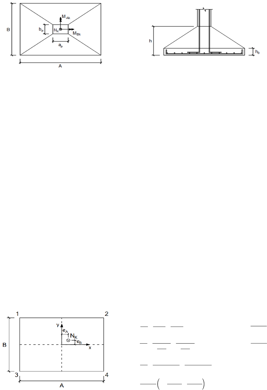 σadm,solo = 5,5 Kgf/cm² fck = 30 MPa fy = 500 MPa A = 1500 cm B = 1000 cm ap = 800 cm bp = 500 cm h = 300 cm h0 = 300 cm c = 5 cm γf = 1,4 γS = 1,15 Kmaj = 1,05 eA = 0,23 cm eB = 0,082696 cm As tensões que a sapata aplica no solo são provenientes da carga axial Nk e dos momentos fletores MAk e MBk. Elas podem ser obtidas para cada ponto do solo em contato com a base da sapata através da fórmula que será apresentada a seguir: OBS.: O Nk na fórmula que permite calcular a tensão no solo foi majorado pelo coeficiente Kmaj para que o peso da sapata e do solo acima da sapata sejam computados MBk = 1589 kNcm (Altura da extremidade da sapata) (Cobrimento da armadura) (Coeficiente utilizado para majorar os esforços e também para minorar a resistência do concreto) (Coeficiente utilizado para minorar a resistência do aço) OBS.: O valor desses coeficientes foram obtidos nos itens 11.7 e 12.4.1 da NBR 6118:2014 (Coeficiente para majorar a carga Nk com o objetivo de computar o peso próprio da sapata e do solo acima dela) • Cálculo das tensões no solo: Sapata SP1 (300x220) - Isolada com carga excêntrica Nk = 18300 kN (Valor característico da carga vertical que o pilar aplica na sapata) OBS.: A direção e sentido do vetor momento fletor são obtidos pela regra da mão direita. Se ele possuir sentido contrário ao indicado na ilustração acima seu valor será negativo (Menor dimensão da base da sapata) (Dimensão da seção transversal do pilar paralela ao lado A) (Dimensão da seção transversal do pilar paralela ao lado B) (Altura da sapata) • Coeficientes de ponderação: • Propriedade dos materiais: • Carregamento: • Propriedades geométricas da sapata: (Maior dimensão da base da sapata) 4379 kNcmMAk = (Momento fletor solicitante característico que tende a girar a sapata em torno de um eixo perpendicular ao lado A) (Momento fletor solicitante característico que tende a girar a sapata em torno de um eixo perpendicular ao lado B) (Tensão admissível do solo) (Resistência característica do concreto à compressão) (Tensão de escoamento do aço) 𝜎 = 𝜎𝑁 ± 𝜎𝑀𝐴𝑘 ± 𝜎𝑀𝐵𝑘 𝜎 = 𝑁𝑘 𝐴. 𝐵 ± 𝑀𝐴𝑘 . 𝑥 𝐼𝑦 ± 𝑀𝐵𝑘 . 𝑦 𝐼𝑥 𝜎 = 𝑁𝑘 𝐴. 𝐵 ± (𝑁𝑘 .𝑒𝐴). 𝑥 𝐵. 𝐴³ 12 ± (𝑁𝑘 .𝑒𝐵). 𝑦 𝐴. 𝐵³ 12 𝜎 = 𝑁𝑘 𝐴. 𝐵 ± 12 . (𝑁𝑘 .𝑒𝐴) . 𝑥 𝐵. 𝐴³ ± 12 . (𝑁𝑘 .𝑒𝐵) . 𝑦 𝐴. 𝐵³ 𝜎 = 𝐾𝑚𝑎𝑗. 𝑁𝑘 𝐴. 𝐵 1 ± 12. 𝑒𝐴. 𝑥 𝐴² ± 12. 𝑒𝐵. 𝑦 𝐵² 𝑒𝐴 = 𝑀𝐴𝑘 𝐾𝑚𝑎𝑗. 𝑁𝑘 𝑒𝐵 = 𝑀𝐵𝑘 𝐾𝑚𝑎𝑗. 𝑁𝑘 Se Se , e a fórmula para calcular a tensão nos vértices irá depender do sinal dos momentos MAk e MBk: (Tensão na base da sapata ao longo da aresta de lado B provocada pela carga Nk e pelo momento fletor MAk) σN = Tensão devido a carga axial Nk σMAk = Tensão devido ao momento fletor MAk σMBk = Tensão devido ao momento fletor MBk σ = Tensão no ponto de coordenadas x e y na base da sapata Iy = Momento de inércia em torno do eixo y Ix = Momento de inércia em torno do eixo x eA = Excentricidade da carga Nk na direção do lado A (Eixo x) eB = Excentricidade da carga Nk na direção do lado B (Eixo y) Procedendo de forma análoga obtem-se a fórmula para calcular σmáx,B (Tensão na base da sapata ao longo da aresta de lado A provocada pela carga Nk e pelo momento fletor MBk) Com o que foi apresentado até o momento já é possível calcular a tensão nos vértices da base da sapata. Para isso, é preciso verificar se a base da sapata está totalmente ou parcialmente comprimida OBS.: Para garantir a validade das fórmulas de σmáx,A e σmáx,B a ação em conjunto da carga Nk com o momento fletor MAk ou MBk deve produzir compressão em pelo menos metade da base da sapata. Entretanto, de acordo com a NBR 6122:2019 deve ser garantido que pelo menos 2/3 da área da base da sapata esteja comprimida (Condição para que Nk e MAk ou Nk e MBk, respectivamente, comprima pelo menos 2/3 da base) OBS.: O sinal ± na fórmula para o cálculo da tensão indica que as tensões geradas pelos momentos fletores podem ser de compressão (Positiva) ou de tração (Negativa). Nos pontos em que σ é negativo, a base da sapata está "desgrudada" do solo Outra condição para que exista o equilíbrio é a de que a carga Nk possua a mesma direção, a mesma intensidade e sentido aposto ao de R (Condição para que toda a base da sapata esteja comprimida) De acordo com a NBR 6122:2019, o dimensionamento geotécnico de uma fundação rasa solicitada por carregamento excêntrico deve ser feito considerando que o solo é um elemento não resistente à tração. Portanto, a fórmula para o cálculo das tensões apresentada anteriormente será utilizada apenas quando toda a base da sapata estiver comprimida, ou seja, quando as excentricidades estiverem dentro do núcleo central de inércia Quando parte da base da sapata estiver tracionada ("desgrudada" do solo), a tensão nos vértices da sapata será calculada conforme procedimento apresentado a seguir: Para MAk>0 e MBk>0: Para que exista o equílibrio na sapata, a carga Nk deve estar aplicada no mesmo ponto da reação de apoio do solo (R). Portanto, é possível constatar da figura ao lado que A/2 - eA = c/3 a tensão nos vértices deverá ser calculada com a fórmula 𝑒𝐴 𝐴 + 𝑒𝐵 𝐵 ≤ 1 6 𝑐 = 3. 𝐴 2 − 𝑒𝐴 𝐴 2 − 𝑒𝐴 = 𝑐 3 𝑁𝑘 = R 𝑁𝑘 = 𝜎𝑚á𝑥,𝐴 . 𝑐 . 𝐵 2 = 𝜎𝑚á𝑥,𝐴 . 3. 𝐴 2 − 𝑒𝐴 . 𝐵 2 𝜎𝑚á𝑥,𝐴 = 2 .𝑁𝑘 3. 𝐴 2 − 𝑒𝐴 . 𝐵 𝜎𝑚á𝑥,𝐵 = 2 .𝑁𝑘 3. 𝐵 2 − 𝑒𝐵 . 𝐴 𝑒𝐴 𝐴 + 𝑒𝐵 𝐵 ≤ 1 6 𝜎 = 𝐾𝑚𝑎𝑗. 𝑁𝑘 𝐴. 𝐵 1 ± 12. 𝑒𝐴. 𝑥 𝐴² ± 12. 𝑒𝐵. 𝑦 𝐵² 𝑒𝐴 𝐴 + 𝑒𝐵 𝐵 > 1 6 𝑒𝐴 𝐴 > 1 6 