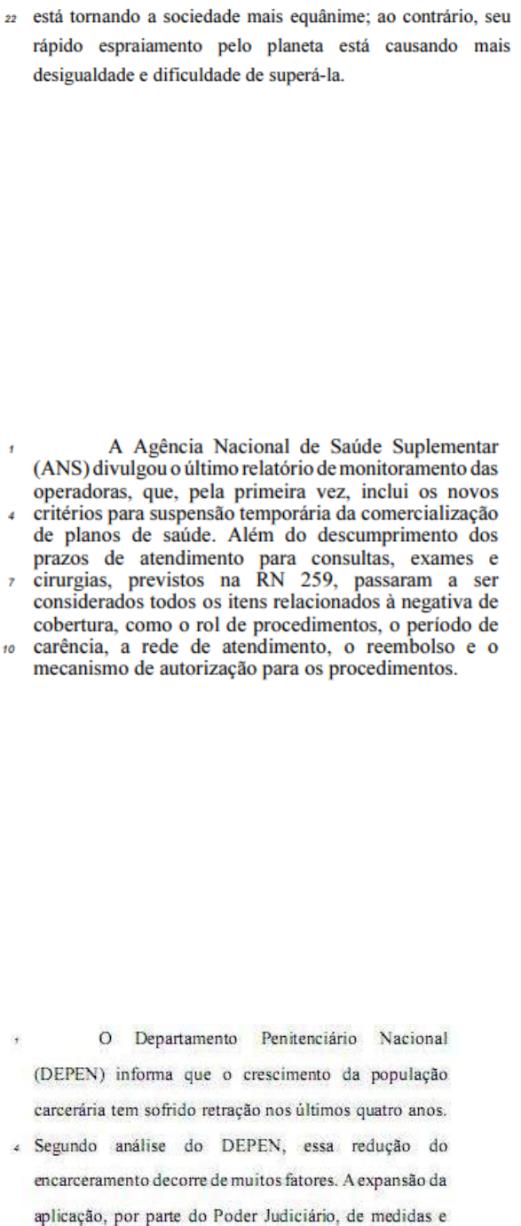 Página | 162 Julgue o item a seguir, relativo às estruturas linguísticas e à organização das ideias do texto acima. Os vocábulos “Político”, “hipótese” e “rápido” seguem a mesma regra de acentuação gráfica. ( ) Certo ( ) Errado 171ª/ Ano: 2021 / Banca: CESPE - CEBRASPE / Órgão: ANS / Especialista em Regulação de Saúde Suplementar Em relação às informações e estruturas linguísticas do texto acima, julgue o item que se segue. Os acentos gráficos empregados em “Agência" e em “Saúde" têm a mesma justificativa. ( ) Certo ( ) Errado 172ª/ Ano: 2021 / Banca: CESPE - CEBRASPE / Órgão: DEPEN / Técnico de Apoio - Assistência Penitenciária