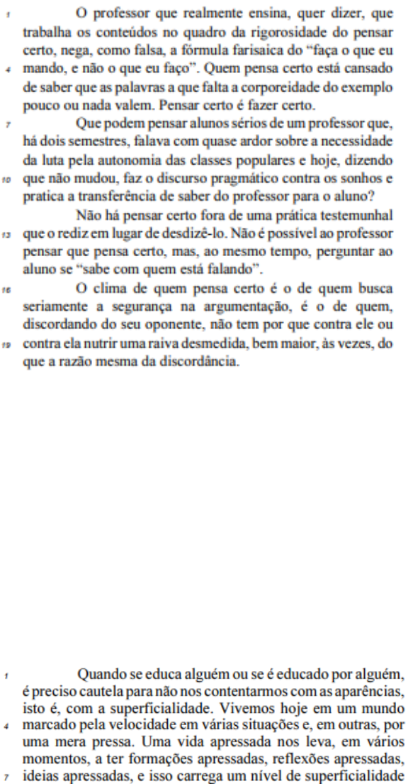 Página | 204 No período em que se insere, o trecho “Médicos (...) ameríndios” (l. 15 a 17) funciona como aposto enumerativo de “todo” (l.17), o que justifica o emprego do travessão no período. ( ) Certo ( ) Errado 219ª/ Ano: 2021 / Banca: CESPE - CEBRASPE / Órgão: Prefeitura de São Cristóvão - SE / Professor de Educação Básica – Português Acerca das ideias, dos sentidos e das propriedades linguísticas do texto anterior, julgue o item a seguir. A inserção de uma vírgula logo após “professor” (.1) alteraria os sentidos originais do texto. ( ) Certo ( ) Errado 220ª/ Ano: 2021 / Banca: CESPE - CEBRASPE / Órgão: Prefeitura de São Cristóvão - SE / Professor de Educação Básica – Português
