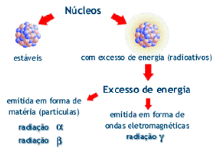 Radioatividade No ano de 1895, Roentgen descobriu um tipo de radiação que atravessava corpos opacos, apesar de serem absorvidos em parte por eles. Esses raios têm a propriedade de excitar substâncias fosforizastes ou fluorescentes, impressionam placas fotográficas e aumentam a condutividade elétrica do ar que atravessam (ionização). Como eram de natureza desconhecida, foram denominados Raios-X. A partir daí em 1896, o físico francês Becquerel através de experimentos descobriu que o urânio poderia deixar marcado um filme fotográfico mesmo na ausência de luz, que eram análogas aos Raios-X. De acordo com a história, a polonesa Marie Curie e seu marido Pierre Curie em 1897 comprovaram a partir de experimentos feitos com Urânio, a quantidade deste que existia em cada amostra determinava a intensidade da radiação, concluindo que a radioatividade era um fenômeno atômico. Os seres humanos sempre conviveram com a radioatividade que está presente em qualquer lugar, pois todos os corpos presente na natureza emitem algum tipo de radioatividade como o sol, as rochas, vegetais entre outros, por exemplo. No entanto, irá depender da intensidade que um elemento emite radiação para ser considerado de alto risco, portanto pode-se dizer que radioatividade ocorre quando um elemento instável tende a emitir energia na forma de partículas ou ondas eletromagnéticas, buscando a estabilidade. Um átomo é considerado instável quando o número de partículas do seu núcleo é grande, ou seja, quanto maior seu núcleo mais instável será, portanto ao emitir energia em forma de partículas diminui sua instabilidade, ou seja, o seu núcleo acaba diminuindo o tamanho, assim ficando mais estável. Entretanto um átomo não realiza essa atividade apenas uma vez, ele poderá continuar emitindo energia em forma de partículas ou de radiação eletromagnética para se tornar cada vez mais estável, porém no processo de emissão de partículas resultará na transformação de um elemento em outro de núcleo menor. O átomo é constituído basicamente por um núcleo onde se encontram os prótons e os nêutrons, já na região ao seu redor chamada de nuvem eletrônica é constituída apenas por elétrons. O termo isótopo muito comum na radioatividade significa basicamente que temos na natureza átomos com mesmo número de prótons, mas variam seu número de nêutrons, tendo como exemplo o urânio que pode ser U-235 ou U-238. O número atômico é determinado pela quantidade de prótons constituída no núcleo, este determina o elemento, já a massa atômica é determinada pela soma de prótons e nêutrons. No núcleo existem partículas com cargas positivas e outras partículas com cargas neutras. Como o núcleo de elementos químicos são formados de mais de uma partícula com cargas desse tipo, existem interações sobre elas e que são de fundamental importância. Atualmente se conhece quatro tipos de interações que atuam sobre os corpos: a força Eletromagnética, a gravitacional, a nuclear Forte e a nuclear Fraca. A força eletromagnética se baseia no principio de que os elementos com carga de sinais opostos se atraem e com cargas de sinais iguais se repelem. Os prótons no núcleo possuem cargas iguais e por isso se repelem, mas se somente isso acontecesse não haveria núcleo formado como conhecemos e com isso não haveria a formação dos elementos e com certa instabilidade consequentemente não haveria vida da forma que conhecemos. Assim, existe também uma força responsável por manter o núcleo estabilizado, que é a força nuclear forte. Essa força é responsável por não deixar as partículas se repelirem em um determinado raio em que o núcleo do elemento está compreendido, portanto, a força nuclear forte é uma força atrativa, mesmo entre prótons com carga de mesmo sinal. Esse processo compreende um raio muito pequeno, cerca de 10-15 m. O núcleo atômico é estável dentro desse raio, pois a força nuclear forte mantém o núcleo comprimido, sendo maior que a força eletromagnética. No entanto, quando a distância entre as partículas ultrapassa esse raio a força eletromagnética passa a ser mais intensa que a força nuclear forte, fazendo com que as partículas sejam repelidas, causando assim uma instabilidade no núcleo. Com a superação da força eletromagnética sobre a nuclear, o átomo emite partículas e energia, que são conhecidas como radiação, sendo elas alfa (), beta () e gama (). Uma maneira de um átomo cheio de energia se estabilizar é através da emissão de partículas alfa que é constituído de dois prótons, dois nêutrons e a energia a elas associada, conhecido como núcleo de hélio (gás nobre conhecido por não reagir quimicamente com outros elementos). Outra forma de se estabilizar é através da radiação beta, onde havendo um número maior de nêutrons em relação ao número de prótons, ocorre a emissão de uma partícula negativa, o elétron, proveniente da transformação de um nêutron em próton. No entanto também pode ocorrer do átomo conter mais prótons do que nêutrons, com isso há a emissão de partículas positiva, o pósitron, que resulta da conversão de um próton em nêutron. Portanto a radiação beta é originada de núcleos que transformam nêutrons em prótons (partícula ) ou prótons em nêutrons (partícula ) Após um átomo emitir as partículas alfa e beta, o núcleo que se formou ainda pode conter uma grande quantidade de energia, sendo assim, para o núcleo se estabilizar ele emite esse excesso de energia em forma de onda eletromagnética, da mesma natureza da luz, denominada radiação gama. Emissão de partícula alfa Emissão partículas beta ( e ) Emissão de raios gama Os elementos radioativos possuem característica, da forma que estas variam de um para o outro, a velocidade que um elemento se transmuta ou decai em outro é de característica própria. Devido a esse motivo cada elemento tem um tempo 