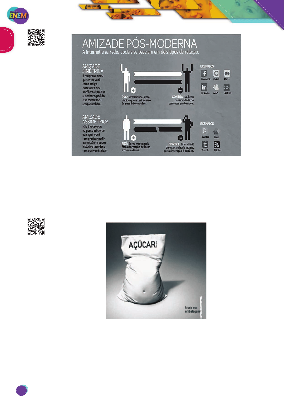 Língua PortuguesaLíngua Portuguesa Língua PortuguesaLíngua Portuguesa 34 104. (Enem-2011) (COSTA, C. Superinteressante. fev. 2011. Adaptado.) Os amigos são um dos principais indicadores de bem-estar na vida social das pessoas. Da mesma forma que em outras áreas, a internet também inovou as maneiras de vivenciar a amizade. Da leitura do infográfico, depreendem-se dois tipos de amizade virtual, a simétrica e a assimétrica, ambas com seus prós e contras. Enquanto a primeira se baseia na relação de reciprocidade, a segunda A) reduz o número de amigos virtuais, ao limitar o acesso à rede. B) parte do anonimato obrigatório para se difundir. C) reforça a configuração de laços mais profundos de amizade. D) facilita a interação entre pessoas em virtude de interesses comuns. E) tem a responsabilidade de promover a proximidade física. 105. (Enem-2011) (Disponível em: . Acesso em: 27 jul. 2010. Adaptado.) O texto é uma propaganda de um adoçante que tem o seguinte mote: “Mude sua embalagem”. A estratégia que o autor utiliza para o convencimento do leitor baseia-se no emprego de recursos expressivos, verbais e não verbais, com vistas a A) ridicularizar a forma física do possível cliente do produto anunciado, aconselhando-o a uma busca de mudanças estéticas. B) enfatizar a tendência da sociedade contemporânea de buscar hábitos alimentares saudáveis, reforçando tal postura. C) criticar o consumo excessivo de produtos industrializados por parte da população, propondo a redução desse consumo. D) associar o vocábulo “açúcar” à imagem do corpo fora de forma, sugerindo a substituição desse produto pelo adoçante. E) relacionar a imagem do saco de açúcar a um corpo humano que não desenvolve atividades físicas, incentivando a prática esportiva. PG18EA445SD00_QE_2018_MIOLO.indb 34 26/02/2018 16:41:33