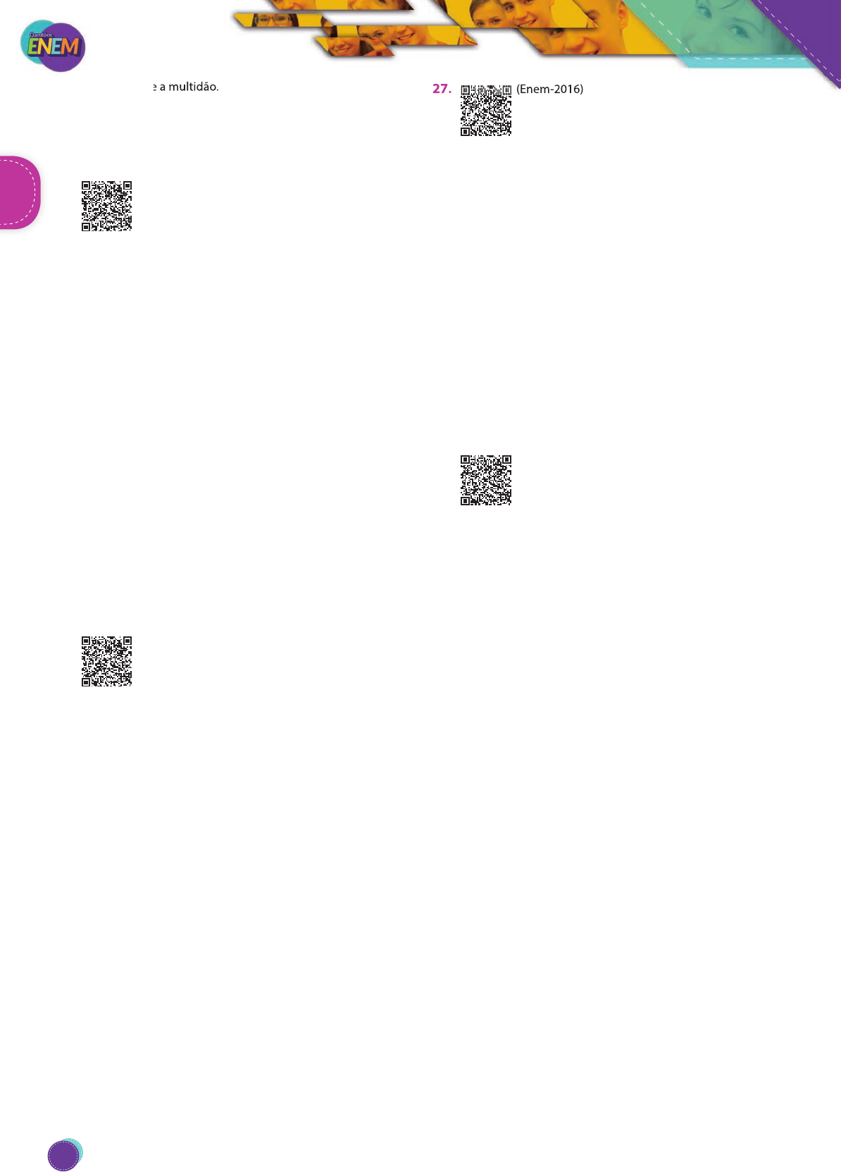 A) a solidão e a multidão. B) a carência e a satisfação. C) a mobilidade e a lentidão. D) a amizade e a indiferença. E) a mudança e a estagnação. 25. (Enem-2016) Descobrimento Abancado à escrivaninha em São Paulo Na minha casa da rua Lopes Chaves De sopetão senti um friúme por dentro. Fiquei trêmulo, muito comovido Com o livro palerma olhando pra mim. Não vê que me lembrei que lá no norte, meu Deus! Muito longe de mim, Na escuridão ativa da noite que caiu, Um homem pálido, magro de cabelos escorrendo nos olhos Depois de fazer uma pele com a borracha do dia, Faz pouco se deitou, está dormindo. Esse homem é brasileiro que nem eu... (ANDRADE, M. Poesias completas. São Paulo: Edusp, 1987.) O poema “Descobrimento”, de Mário de Andrade, marca a postura nacionalista manifestada pelos escritores modernistas. Recuperando o fato histórico do “descobrimento”, a construção poética problematiza a representação nacional a fim de A) resgatar o passado indígena brasileiro. B) criticar a colonização portuguesa no Brasil. C) defender a diversidade social e cultural brasileira. D) promover a integração das diferentes regiões do país. E) valorizar a Região Norte, pouco conhecida pelos brasileiros. 26. (Enem-2016) Casamento Há mulheres que dizem: Meu marido, se quiser pescar, pesque, mas que limpe os peixes. Eu não. A qualquer hora da noite me levanto, ajudo a escamar, abrir, retalhar e salgar. É tão bom, só a gente sozinhos na cozinha, de vez em quando os cotovelos se esbarram, ele fala coisas como “este foi difícil” “prateou no ar dando rabanadas” e faz o gesto com a mão. O silêncio de quando nos vimos a primeira vez atravessa a cozinha como um rio profundo. Por fim, os peixes na travessa, vamos dormir. Coisas prateadas espocam: somos noivo e noiva. (PRADO, A. Poesia reunida. São Paulo: Siciliano, 1991.) O poema de Adélia Prado, que segue a proposta moderna de tematização de fatos cotidianos, apresenta a prosaica ação de limpar peixes na qual a voz lírica reconhece uma A) expectativa do marido em relação à esposa. B) imposição dos afazeres conjugais. C) disposição para realizar tarefas masculinas. D) dissonância entre as vozes masculina e feminina. E) forma de consagração da cumplicidade no casamento. 27. (Enem-2016) Do amor à pátria São doces os caminhos que levam de volta à pátria. Não à pátria amada de verdes mares bravios, a mirar em berço esplêndido o esplendor do Cruzeiro do Sul; mas a uma outra mais íntima, pacífica e habitual – uma cuja terra se comeu em criança, uma onde se foi menino ansioso por crescer, uma onde se cresceu em sofrimentos e esperanças plantando canções, amores e filhos ao sabor das estações. (MORAES, V. Poesia completa e prosa. Rio de Janeiro: Nova Aguilar, 1987.) O nacionalismo constitui tema recorrente na literatura romântica e na modernista. No trecho, a representação da pátria ganha contornos peculiares porque A) o amor àquilo que a pátria oferece é grandioso e eloquente. B) os elementos valorizados são intimistas e de dimensão subjetiva. C) o olhar sobre a pátria é ingênuo e comprometido pela inércia. D) o patriotismo literário tradicional é subvertido e motivo de ironia. E) a natureza é determinante na percepção do valor da pátria. 28. (Enem-2016) Anoitecer A Dolores É a hora em que o sino toca, mas aqui não há sinos; há somente buzinas, sirenes roucas, apitos aflitos, pungentes, trágicos, uivando escuro segredo; desta hora tenho medo. [...] É a hora do descanso, mas o descanso vem tarde, o corpo não pede sono, depois de tanto rodar; pede paz – morte – mergulho no poço mais ermo e quedo; desta hora tenho medo. Hora de delicadeza, agasalho, sombra, silêncio. Haverá disso no mundo? É antes a hora dos corvos, bicando em mim, meu passado, meu futuro, meu degredo; desta hora, sim, tenho medo. (ANDRADE, C. D. A rosa do povo. Rio de Janeiro: Record, 2005.) Com base no contexto da Segunda Guerra Mundial, o livro A rosa do povo revela desdobramentos da visão poética. No fragmento, a expressividade lírica demonstra um(a) A) defesa da esperança como forma de superação das atroci- dades da guerra. B) desejo de resistência às formas de opressão e medo produ- zidas pela guerra. LiteraturaLiteratura a solidão e a multidão. 27. (Enem-2016) LiteraturaLiteratura 90 PG18EA445SD00_QE_2018_MIOLO.indb 90 26/02/2018 16:42:08