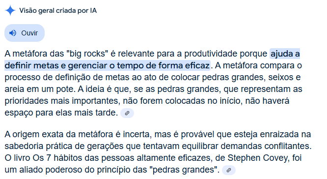 Visão geral criada por IA Ouvir A metáfora das "big rocks" é relevante para a produtividade porque ajuda a definir metas e gerenciar tempo de forma eficaz. A metáfora compara o processo de definição de metas ao ato de colocar pedras grandes, seixos e areia em um pote. A ideia é que, se as pedras grandes, que representam as prioridades mais importantes, não forem colocadas no início, não haverá espaço para elas mais tarde. @ A origem exata da metáfora é incerta, mas é provável que esteja enraizada na sabedoria prática de gerações que tentavam equilibrar demandas conflitantes. livro Os 7 hábitos das pessoas altamente eficazes, de Stephen Covey, foi um aliado poderoso do princípio das "pedras grandes". @