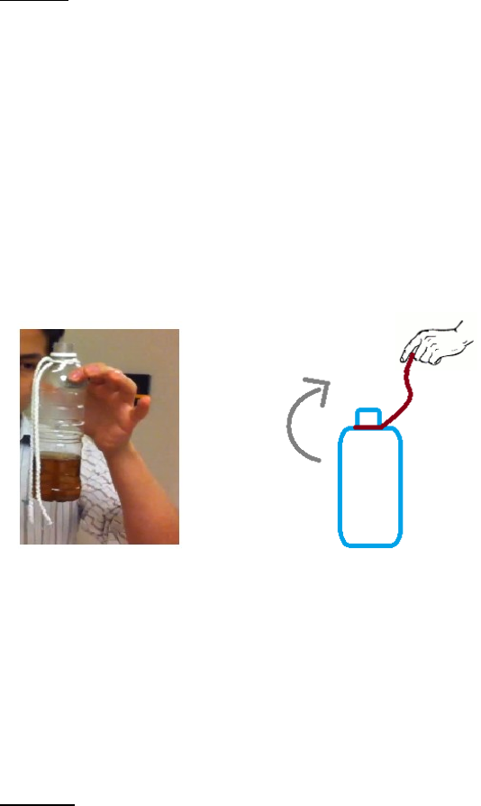 Roteiro dos experimentos Garrafa: Material necessário: - Uma garrafa pequena; - Uma cordinha para sustentar a garrafa; - Água; Experimento: Amarre a corda na boca da garrafa pequena, e encha ela de água, deixe-a sem tampa. Segure na ponta da corda e gira a garrafa com a água dentro, observe o que acontece com o liquido. Perguntas: Porque a água não cai? Se soltar a linha que prende a garrafa, o que acontece? Você acha que existe algo que “segure” a água na garrafa? Moeda: Material necessário: - Um arame firme que possa ser moldado; - Uma moeda; Experimento: Moldar o arame de forma que fique um quadrado, com uma das pontas sobrando em forma de ganho, como na figura. Encaixar a moeda na ponta do gancho, rodar devagar e observar o que acontece. Recolocar a moeda e girar rapidamente no dedo o arame, observando o que acontece. - Porque a moeda não cai? Se diminuir a velocidade do giro, o que acontece com a moeda? image1.png image2.png image3.png image4.png