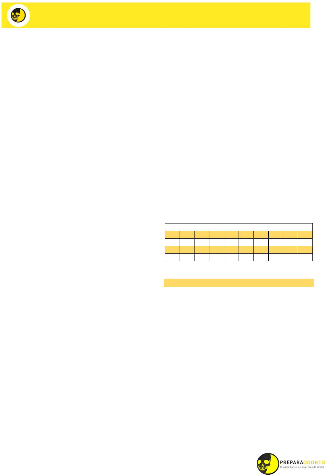 120 V- Gengiva marginal: adaptada à superfície dentária Quais destas são características de normalidade para a gengiva e o periodonto de um adulto? A) I, IV e V B) I, II e III C) II, III e V D) I, III e IV 28) Os anestésicos locais são fármacos utilizados para bloquear temporariamente a condução dos impulsos nervosos, levando à perda ou diminuição da sensibilidade dolorosa. Considerando o uso dos anestésicos locais em Odontologia, avalie as afirmativas a seguir: I- São propriedades desejáveis dos anestésicos locais: Não deve produzir reações alérgicas, deve ser estável em solução e deve ser estéril ou capaz de ser esterilizado. II- O ph do meio não interfere na ação dos anestésicos locais, pois o ph não é capaz de alterar a formação de base livre. III- Para a prevenção de toxicidade dos anestésicos locais deve-se realizar uma injeção lenta e com aspiração prévia. De acordo com o uso dos anestésicos locais em odontologia as seguintes afirmativas estão corretas: A) I B) II C) I e II D) I e III 29) No atendimento de pacientes odontopediátricos, os profissionais por diversas vezes têm que lançar mão de técnicas de adaptação comportamental. Existem diversas técnicas de adaptação comportamental farmacológicas e não farmacológicas descritas na literatura. Em um caso hipotético de atendimento de uma criança saudável, que chora copiosamente durante o atendimento, que tem movimentos bruscos e contínuos de membros e não colabora durante todo o atendimento, o profissional pode usar as seguintes técnicas, EXCETO: A) Mostrar-Falar-Fazer durante todo o procedimento. B) Imobilização protetora com autorização dos pais para realização do procedimento planejado. C) Controle de Voz, durante o atendimento da criança para conseguir que ela te escute ou obedeça uma ordem ou comando, quando a mesma está chorando. D) Reforço positivo, ao final da consulta que não pode ser realizada devido ao comportamento inadequado. 30) As penicilinas são os antibióticos mais extensamente utilizados atualmente. Esses medicamentos são altamente eficazes, seguros e possuem espectro de atividade que inclui os micro-organismos mais comuns. Além disso na rotina diária odontológica, por diversas vezes o cirurgião dentista tem que prescrever esses medicamentos. Porém devemos ter atenção para reações alérgicas. Para aqueles pacientes que apresentem hipersensibilidade à penicilina e necessitam de antibioticoterapia, podese substituir a penicilina por: A) Eritromicina B) Amoxicilina C) Alprozolan D) Penicilina V GABARITO 11 12 13 14 15 16 17 18 19 20 B D B B D D A D A A 21 22 23 24 25 26 27 28 29 30 C C B C A D A D D A PROVA CIRURGIÃO-DENTISTA 26ª QUESTÃO Os instrumentos perfurocortantes ou escarificantes são elementos potencialmente contaminantes no uso da clínica odontológica, em que o profissional e seus auxiliares devem ter o máximo de atenção em relação ao seu descarte. Para evitar injúrias àqueles que os manipulam, os mesmos devem ser dispensados em a) sacos plásticos, na cor branca, com uma inscrição vermelha em cruz destinados à coleta de lixo municipal. b) sacos plásticos, na cor branca, com indicação de material contaminado. c) sacos plásticos, na cor escura, destinados à coleta de lixo hospitalar. d) sacos plásticos, na cor escura, destinados à coleta de lixo municipal. e) recipiente resistente à perfuração tipo caixa (Descarpack).