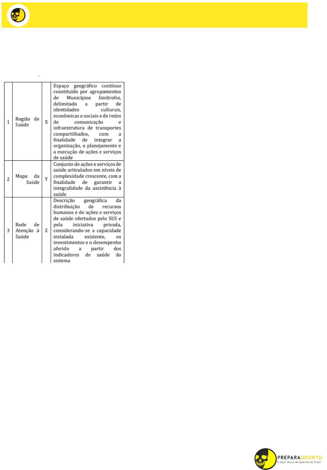 100 17) Sobre as disposições preliminares descritas no decreto 7508/11, associe as definições trazidas na tabela a seguir e assinale a alternativa que traz a sequência CORRETA: A) 1 – Z; 2 – X; 3 – Y. B) 1 – Z; 2 – Y; 3 – X. C) 1 – X; 2 – Z; 3 – Y. D) 1 – X; 2 – Y; 3 – Z. 18) As Comissões intergestores pactuarão: I - Das diretrizes nacionais, do financiamento e das questões operacionais das Regiões de Saúde situadas em fronteiras com outros países, respeitadas, em todos os casos, as normas que regem as relações internacionais. II - Diretrizes de âmbito nacional, estadual, regional e interestadual, a respeito da organização das redes de atenção à saúde, principalmente no tocante à gestão institucional e à integração das ações e serviços dos entes federativos. III - Aspectos operacionais, financeiros e administrativos da gestão compartilhada do SUS, de acordo com a definição da política de saúde dos entes federativos, consubstanciada nos seus planos de saúde, aprovados pelos respectivos conselhos de saúde. Está correto o que se afirma em: A) I e II, apenas. B) I e III, apenas. C) II e III, apenas. D) I, II e III. 19) São características do processo de trabalho das equipes de Atenção Básica, exceto: A) Programação e implementação das atividades de atenção à saúde de acordo com as necessidades de saúde da população, com a priorização de intervenções clínicas e sanitárias nos problemas de saúde segundo critérios de freqüência, risco, vulnerabilidade e resiliência. Inclui-se aqui o planejamento e organização da agenda de trabalho compartilhado de todos os profissionais e recomenda-se evitar a divisão de agenda segundo critérios de problemas de saúde, ciclos de vida, sexo e patologias dificultando o acesso dos usuários. B) Realizar o acolhimento com escuta qualificada, classificação de risco, avaliação de necessidade de saúde e análise de vulnerabilidade tendo em vista a responsabilidade da assistência resolutiva à demanda espontânea e o primeiro atendimento às urgências. C) Desenvolver ações educativas que possam interferir no processo de saúde-doença da população, no desenvolvimento de autonomia, individual e coletiva, e na busca por qualidade de vida pelos usuários. D) Realizar atenção domiciliar destinada a usuários que possuam problemas de saúde controlados/compensados e com dificuldade ou impossibilidade física de locomoção até uma unidade de saúde, que necessitam de cuidados com maior frequência e maior necessidade de recursos de saúde e realizar o cuidado compartilhado com as equipes de atenção domiciliar nos demais casos. 20) Os municípios-sede de módulos assistenciais deverão dispor de leitos hospitalares, no mínimo, para o atendimento básico em: A) Clínica médica, clínica pediátrica e obstetrícia (parto normal). B) Clínica médica/cirúrgica, clínica pediátrica e obstetrícia (parto normal e cesariana). C) Clínica médica, clínica pediátrica/neonatal, obstetrícia e oftalmologia. D) Clínica médica/cirúrgica, clínica pediátrica/neonatal.