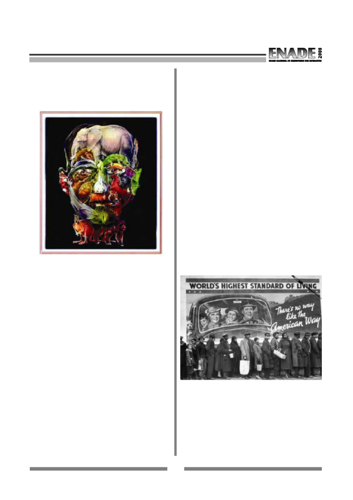 Impresso por Andre Alves Huerdo, CPF 293.768.808-03 para uso pessoal e privado. Este material pode ser protegido por direitos autorais e não pode ser reproduzido ou repassado para terceiros. 29/10/2021 11:25:42 2 TECNOLOGIA EM ANÁLISE E DESENVOLVIMENTO DE SISTEMAS QUESTÃO 2 Quando o homem não trata bem a natureza, a natureza não trata bem o homem. Essa afirmativa reitera a necessária interação das diferentes espécies, representadas na imagem a seguir. Disponível em http://curiosidades.spaceblog.com.br. Acesso em 10 out. 2008. Depreende-se dessa imagem a A atuação do homem na clonagem de animais pré-históricos. B exclusão do homem na ameaça efetiva à sobrevivência do planeta. C ingerência do homem na reprodução de espécies em cativeiro. D mutação das espécies pela ação predatória do homem. E responsabilidade do homem na manutenção da biodiversidade. QUESTÃO 3 A exposição aos raios ultravioleta tipo B (UVB) causa queimaduras na pele, que podem ocasionar lesões graves ao longo do tempo. Por essa razão, recomenda-se a utilização de filtros solares, que deixam passar apenas certa fração desses raios, indicada pelo Fator de Proteção Solar (FPS). Por exemplo, um protetor com FPS igual a 10 deixa passar apenas 1/10 (ou seja, retém 90%) dos raios UVB. Um protetor que retenha 95% dos raios UVB possui um FPS igual a A 95. B 90. C 50. D 20. E 5. QUESTÃO 4 CIDADÃS DE SEGUNDA CLASSE? As melhores leis a favor das mulheres de cada país-membro da União Européia estão sendo reunidas por especialistas. O objetivo é compor uma legislação continental capaz de contemplar temas que vão da contracepção à eqüidade salarial, da prostituição à aposentadoria. Contudo, uma legislação que assegure a inclusão social das cidadãs deve contemplar outros temas, além dos citados. São dois os temas mais específicos para essa legislação: A aborto e violência doméstica. B cotas raciais e assédio moral. C educação moral e trabalho. D estupro e imigração clandestina. E liberdade de expressão e divórcio. QUESTÃO 5 A foto a seguir, da americana Margaret Bourke-White (1904-71), apresenta desempregados na fila de alimentos durante a Grande Depressão, que se iniciou em 1929. STRICKLAND, Carol; BOSWELL, John. daArte Comentada: pré-história ao pós-moderno. Rio de Janeiro: Ediouro [s.d.]. Além da preocupação com a per omposição, afeita c artista, nessa foto, revela A a capacidade de organização do operariado. B a esperança de um futuro melhor para negros. C a possibilidade de ascensão social universal. D as contradições da sociedade capitalista. E o consumismo de determinadas classes sociais.