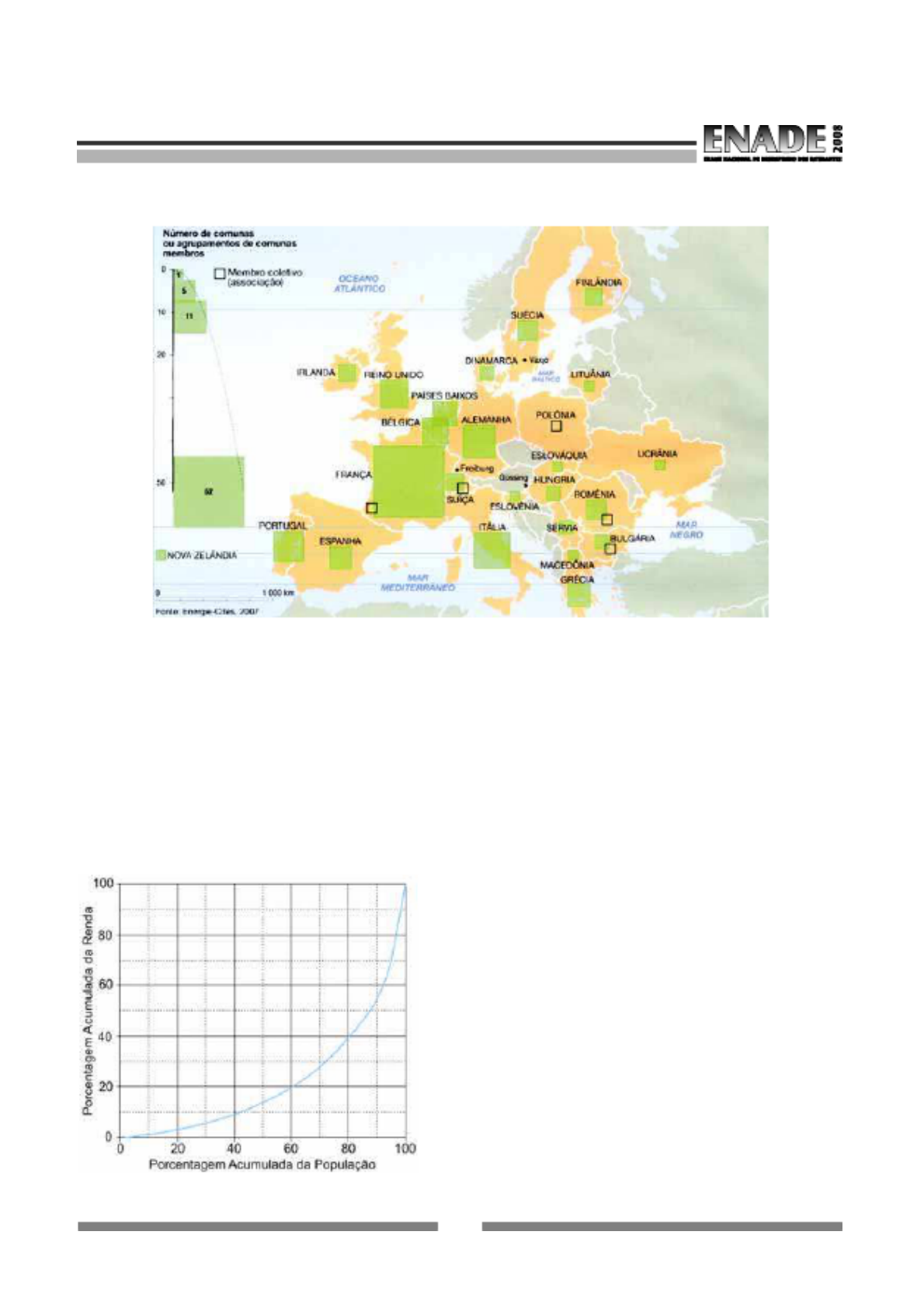Impresso por Andre Alves Huerdo, CPF 293.768.808-03 para uso pessoal e privado. Este material pode ser protegido por direitos autorais e não pode ser reproduzido ou repassado para terceiros. 29/10/2021 11:25:42 3 TECNOLOGIA EM ANÁLISE E DESENVOLVIMENTO DE SISTEMAS Disponível em http://www.ipea.gov.br QUESTÃO 6 CENTROS URBANOS MEMBROS DO GRUPO “ENERGIA-CIDADES” LE MONDE Diplomatique Brasil. Atlas do Meio Ambiente, 2008, p. 82. No mapa, registra-se uma prática exemplar para que as cidades se tornem sustentáveis de fato, favorecendo as trocas horizontais, ou seja, associando e conectando territórios entre si, evitando desperdícios no uso de energia. Essa prática exemplar apóia-se, fundamentalmente, na A centralização de decisões políticas. B atuação estratégica em rede. C fragmentação de iniciativas institucionais. D hierarquização de autonomias locais. E unificação regional de impostos. QUESTÃO 7 Apesar do progresso verificado nos últimos anos, o Brasil continua sendo um país em que há uma grande desigualdade de renda entre os cidadãos. Uma forma de se constatar este fato é por meio da Curva de Lorenz, que fornece, para cada valor de entre 0 ex 100, o percentual da renda total do País auferido pelos % dex brasileiros de menor renda. Por exemplo, na Curva de Lorenz para 2004, apresentada ao lado, constata-se que a renda total dos 60% de menor renda representou apenas 20% da renda total. De acordo com o mesmo gráfico, o percentual da renda total correspondente aos 20% de renda foi,maior aproximadamente, igual a A 20%. B 40%. C 50%. D 60%. E 80%.