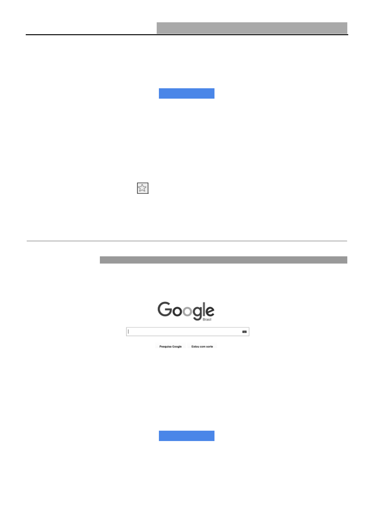 Dominando Informática Para Concursos: 300 Questões Comentadas dos Assuntos mais Cobrados em Provas Capítulo #05 – Internet e Navegadores 217 c) se somente as afirmativas I e II estiverem corretas. d) se somente as afirmativas II e III estiverem corretas. e) se todas as afirmativas estiverem corretas. * * * * * RESPOSTA * * * * * I. [CERTO] Para habilitar o modo de tela cheia no Internet Explorer basta pressionar a tecla de função F11. II. [CERTO] Para imprimir o conteúdo de uma página de um site no Internet Explorer, deve-se executar o atalho de teclado Ctrl + P. III. [ERRADO] O ícone refere-se aos sites favoritos selecionados pelo usuário. Alternativa CORRETA LETRA D Ano: 2016 Banca: FGV Órgão: CODEB AProva: Técnico Portuário - Apoio Administrativo Questão 230. A figura a seguir ilustra o cursor do mouse posicionado à esquerda na janela de diálogo do Google, na tela do browser Firefox Mozilla. Para digitar a URL do site da CODEBA nesse navegador, há necessidade de acessar a Barra de Endereços e, para isso, deve-se executar o seguinte atalho de teclado: a) Ctrl + L b) Ctrl + E c) Shift + L d) At + E e) Alt + L * * * * * RESPOSTA * * * * * a) [CERTO] As teclas de atalho para selecionar a barra de endereço são: F6, Alt+D, Ctrl+L.