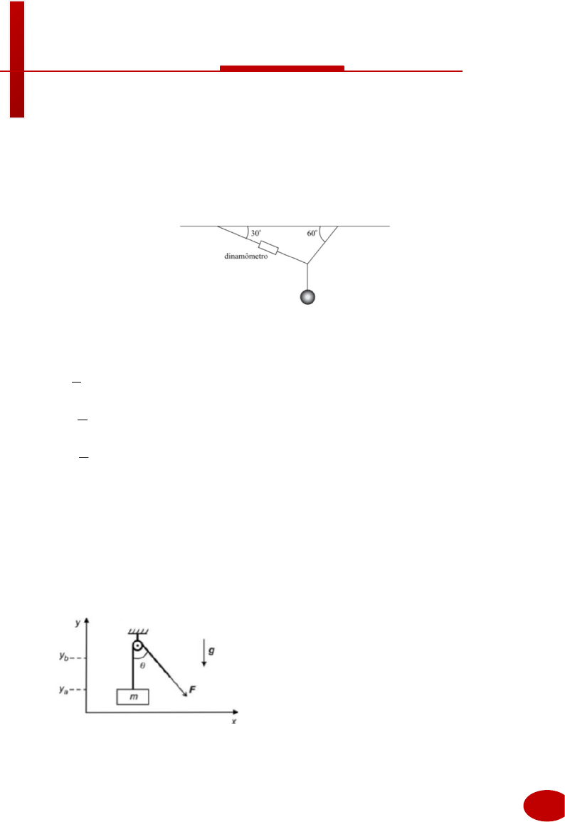 60 BANCO DE QUESTO ES Farlei Roberto Mazzarioli www.farlei.net c) 670 N. d) 800 N. e) 870 N. Questão. (Unesp) Um professor de física pendurou uma pequena esfera, pelo seu centro de gravidade, ao teto da sala de aula, conforme a figura: Em um dos fios que sustentava a esfera ele acoplou um dinamômetro e verificou que, com o sistema em equilíbrio, ele marcava 10N. O peso, em newtons, da esfera pendurada é de a) 5√3. b) 10. c) 10√3. d) 20. e) 20√3. Questão. (Fuvest) Usando um sistema formado por uma corda e uma roldana, um homem levanta uma caixa de massa m, aplicando na corda uma força F que forma um ângulo θ com a direção vertical, como mostra a figura. O trabalho realizado pela resultante das forças que atuam na caixa – peso e força da corda –, quando o centro de massa da caixa é elevado, com velocidade constante v, desde a altura ya até a altura yb, é: a) nulo. b) F (yb – ya). c) mg (yb – ya).