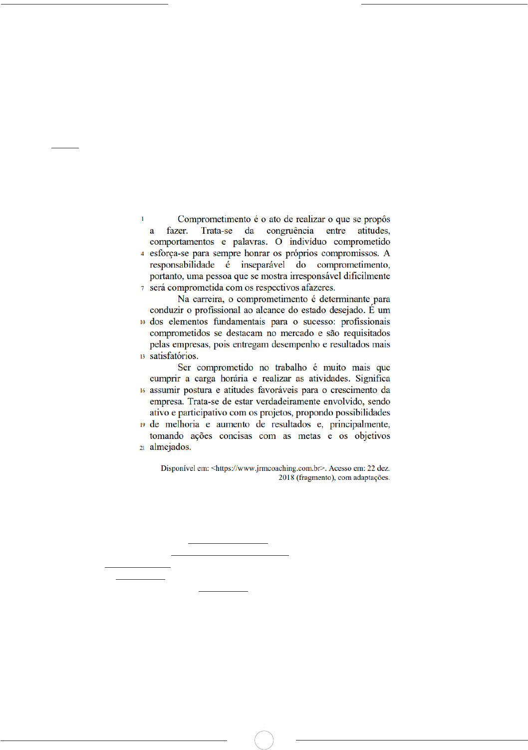 CADERNO DE QUESTÕES 20 De acordo com a norma-padrão e as questões gramaticais referentes ao período “Sempre vale repetir que remédios devem ser guardados fora do alcance das crianças e longe da umidade, do calor e da exposição solar.” (linhas de 11 a 13), assinale a alternativa correta. A) O uso do sinal indicativo de crase estaria correto caso a autora julgasse conveniente empregar a construção informar à população no lugar da forma verbal “repetir”. B) A redação Sempre vale alertar de que poderia, do ponto de vista da regência, substituir corretamente o trecho “Sem- pre vale repetir que”. C) Conforme as regras para o uso do sinal indicativo de crase, o trecho “fora do alcance das crianças” poderia ser substi- tuído corretamente pela redação em locais inacessíveis à crianças. D) A autora poderia substituir corretamente o trecho “longe da umidade, do calor e da exposição solar” pela redação em lugares aonde a umidade, o calor e a exposição solar estejam distantes, pois a construção sublinhada está empregada corretamente. E) O uso do sinal indicativo de crase seria inviável caso o vocábulo “solar” fosse substituído pela construção a luz solar. Texto para responder às questões de 64 a 66 64- IADES - 2019 - CAU - AC - Auxiliar Administrativo Assinale a alternativa cujo termo sublinhado representa adjunto adnominal da respectiva oração. A) “A responsabilidade é inseparável do comprometimento” (linhas 4 e 5) B) “dificilmente será comprometida com os respectivos afazeres” (linhas 6 e 7) C) “são requisitados pelas empresas” (linhas 11 e 12) D) “Ser comprometido no trabalho é muito mais que cumprir” (linhas 14 e 15) E) “atitudes favoráveis para o crescimento da empresa” (linhas 16 e 17) 65- IADES - 2019 - CAU - AC - Auxiliar Administrativo Na linha 6, o vocábulo “portanto” corresponde a uma conjunção coordenativa A) explicativa B) alternativa C) aditiva D) conclusiva E) adversativa